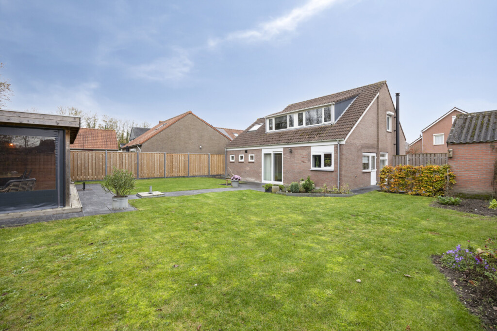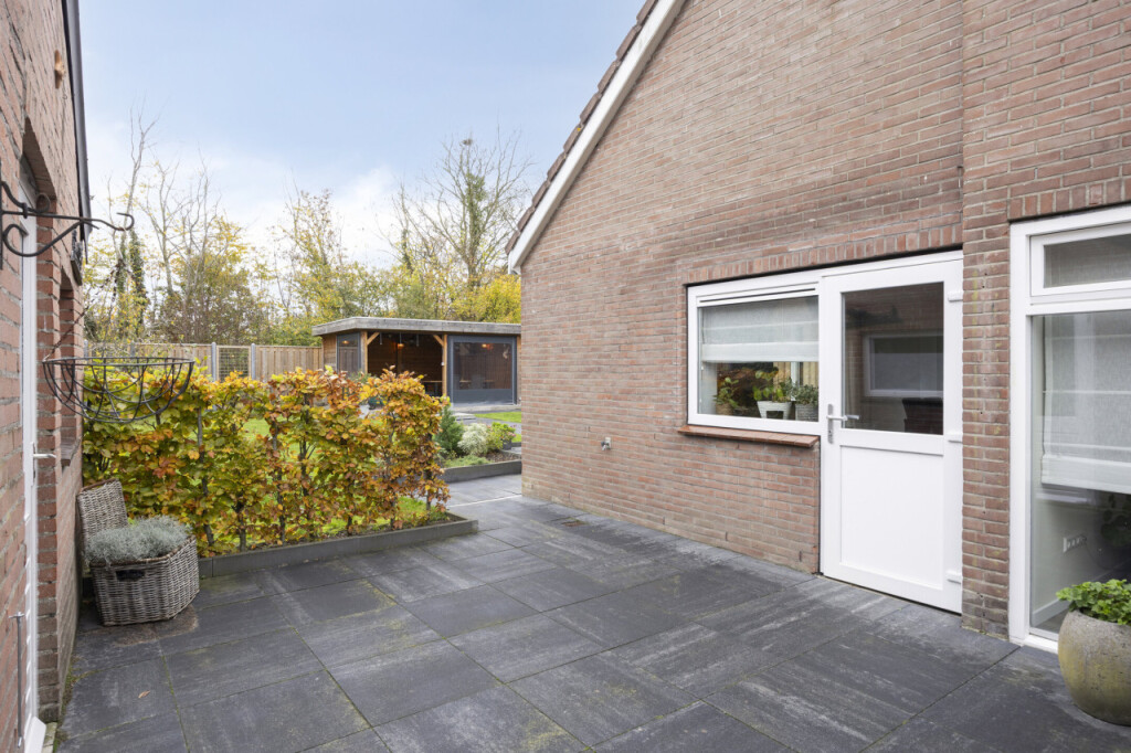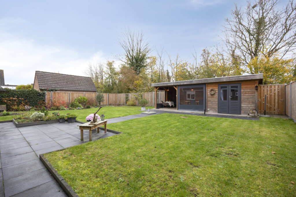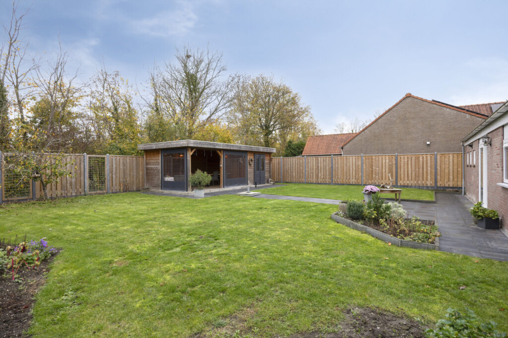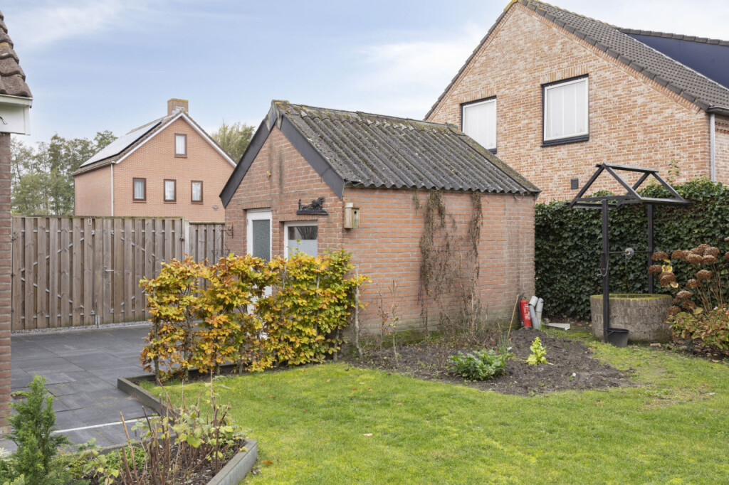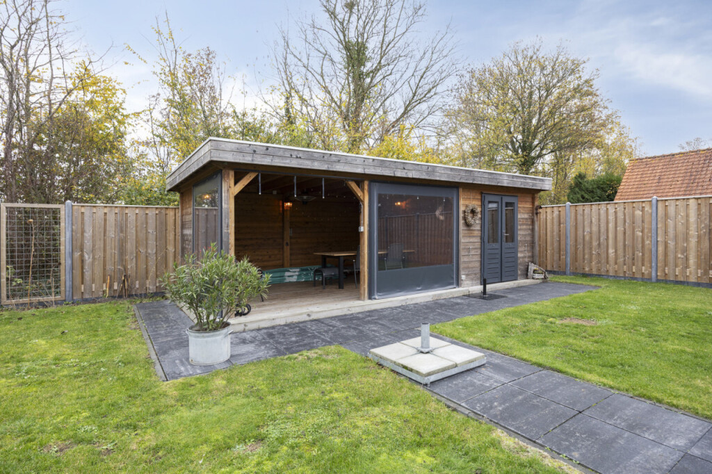 De tuin is een heerlijke plek om te ontspannen. Vanuit de keuken stap je via de zijdeur of de schuifpui zo naar buiten, waar de recent geplaatste houten overkapping direct in het oog springt. Deze kan volledig worden afgesloten, zodat je ook tijdens regenachtige dagen comfortabel buiten zit. Aan de rechterzijde van de overkapping bevindt zich een praktische berging, en aan de zijkant van de tuin staat een vrijstaande stenen berging die perfect is voor fietsen of tuingereedschap. Dankzij de waterput kun je de tuin bovendien eenvoudig en zuinig bewateren. Ook op het gebied van duurzaamheid zit je hier goed: de woning is voorzien van 7 zonnepanelen, wat zorgt voor lagere energiekosten en extra wooncomfort.