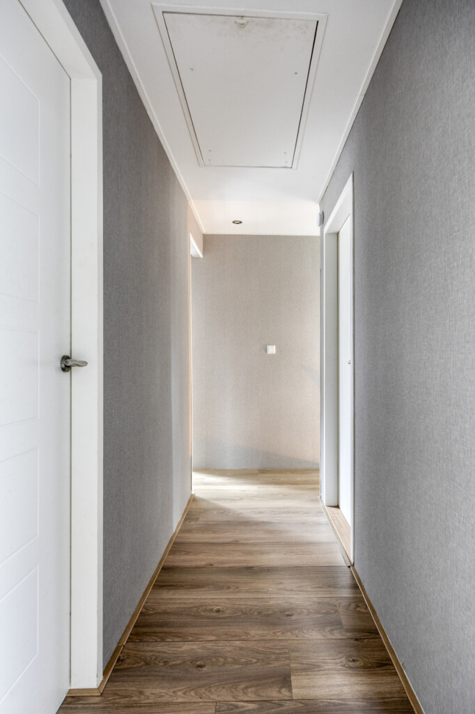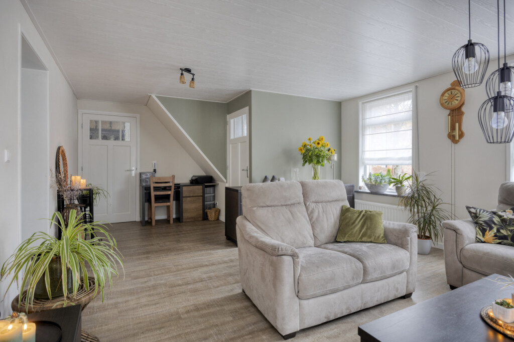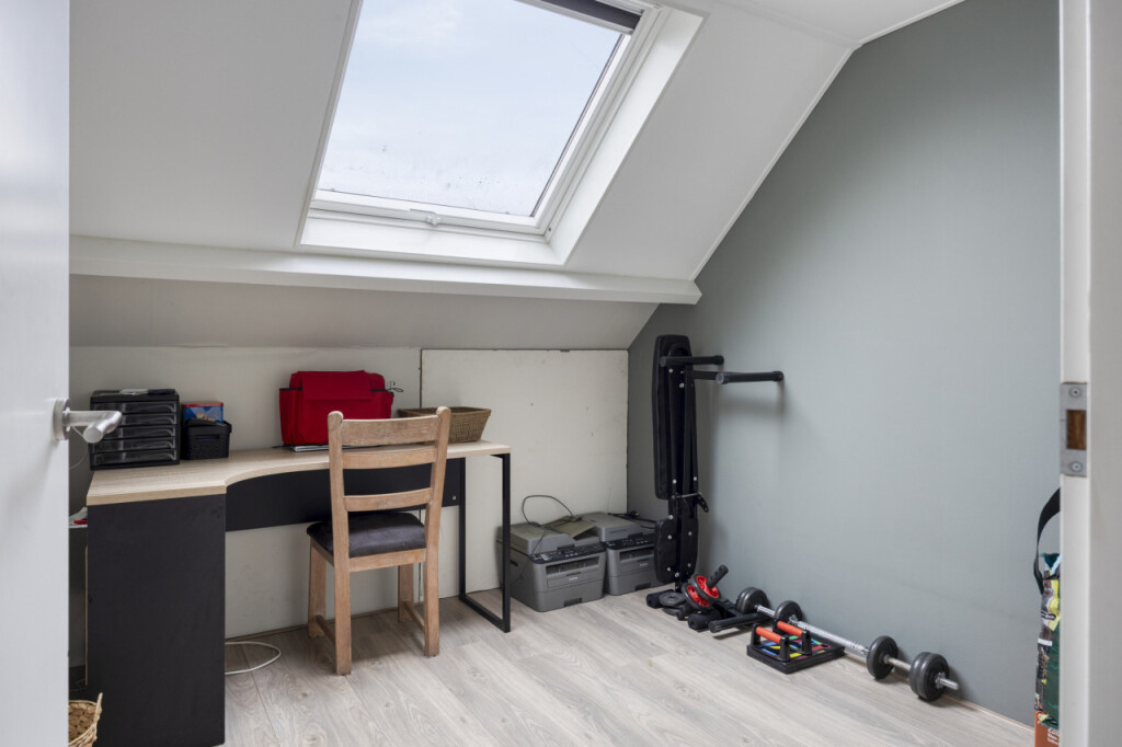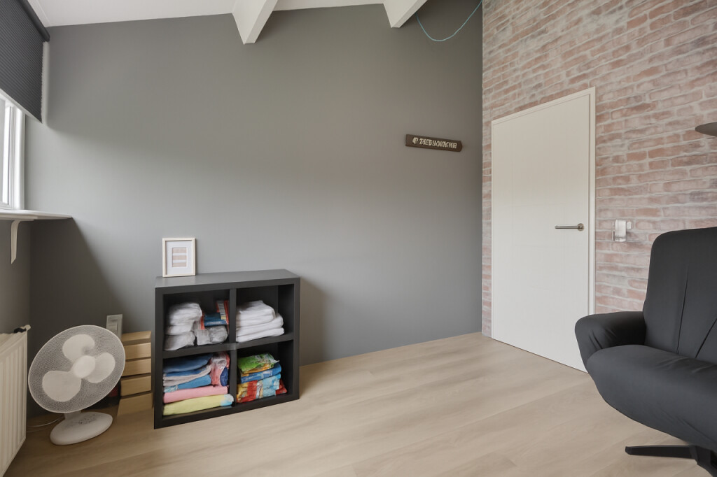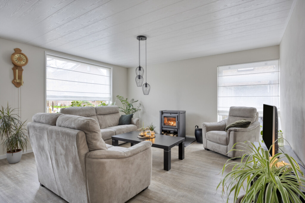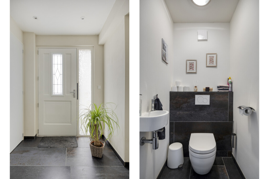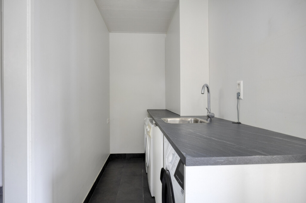 Aansluitend bevindt zich de strak afgewerkte bijkeuken, waar de cv-ketel en de aansluitingen voor de wasmachine en droger te vinden zijn. Daarnaast is er volop plaats voor extra opslag. In de woonkamer vind je een deur naar een kleine hal met de trap naar de eerste verdieping.
