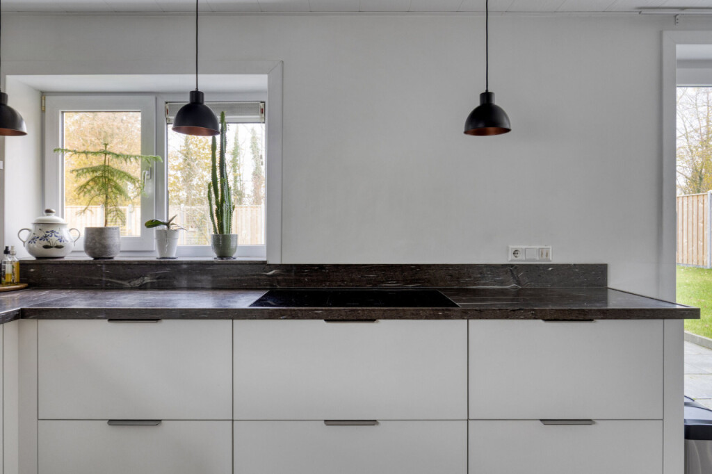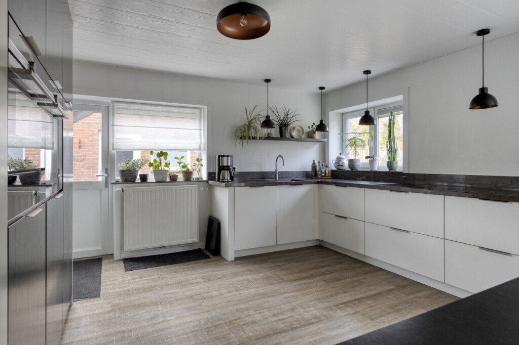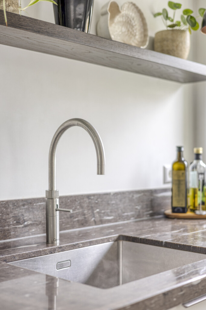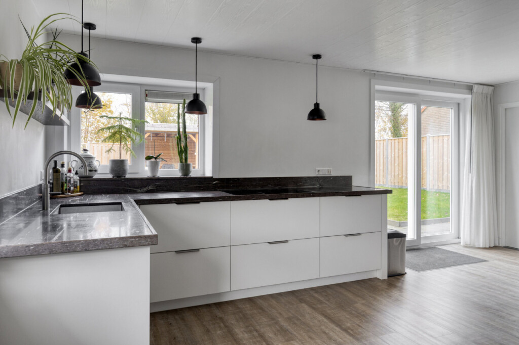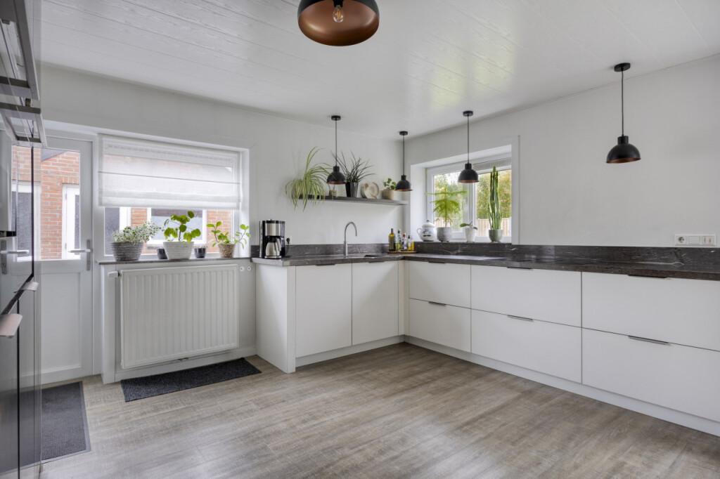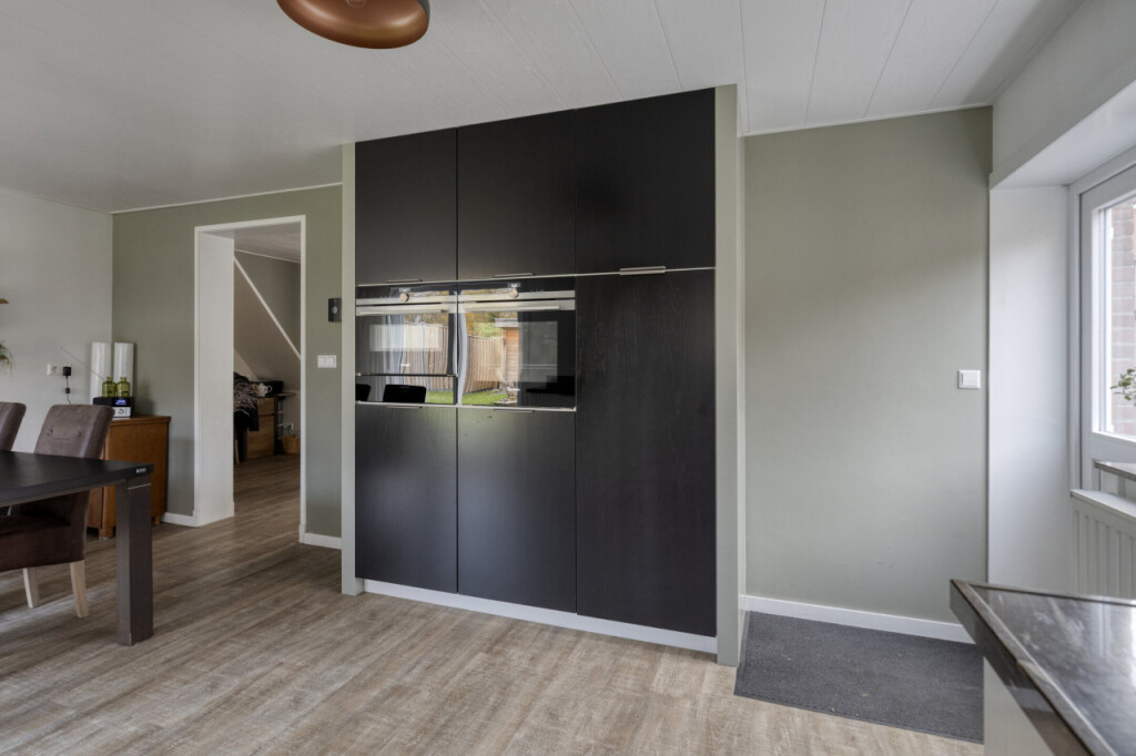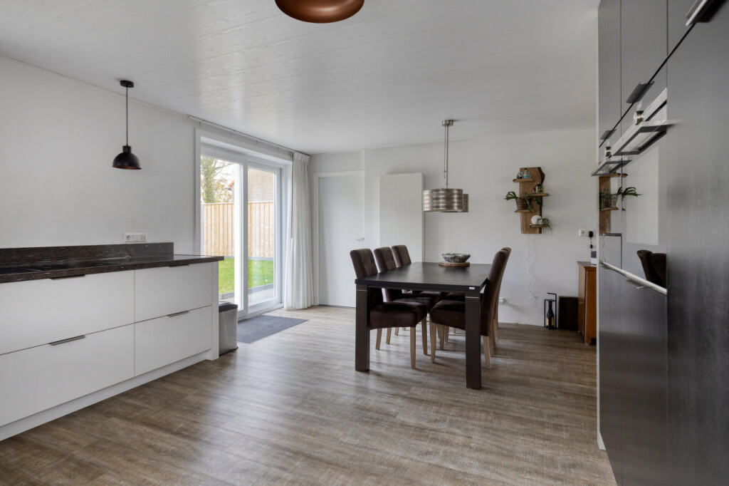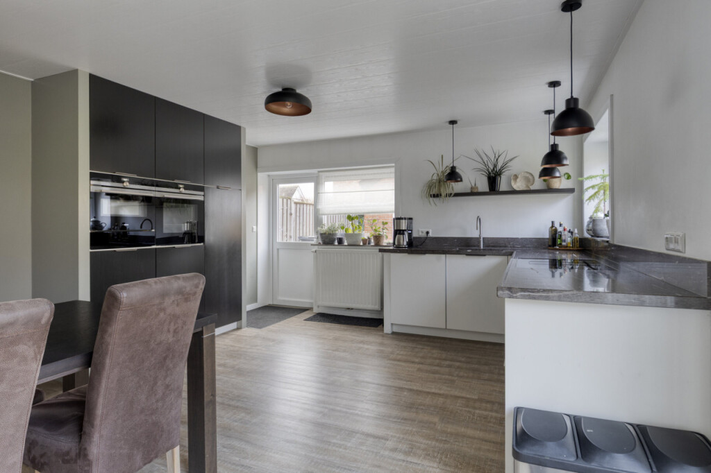 Bij binnenkomst stap je de hal binnen, waar je toegang hebt tot het moderne toilet, de bijkeuken en de woonkamer. Het toilet is netjes afgewerkt en voorzien van een fonteintje. De woonkamer is een fijne leefruimte met een PVC-vloer en grote raampartijen, waardoor er veel natuurlijk licht binnenvalt. Vanuit hier loop je door naar de ruime keuken, die is uitgerust met moderne inbouwapparatuur. De keuken biedt alles wat je nodig hebt: een inductiekookplaat met ingebouwde afzuiging, een vaatwasser, koelkast, oven, combi-oven, warmhoudlade en een Quooker. Het granieten werkblad en de ruime opzet maken het bovendien een fijne plek om te koken en te tafelen, want er is genoeg ruimte voor een grote eettafel.