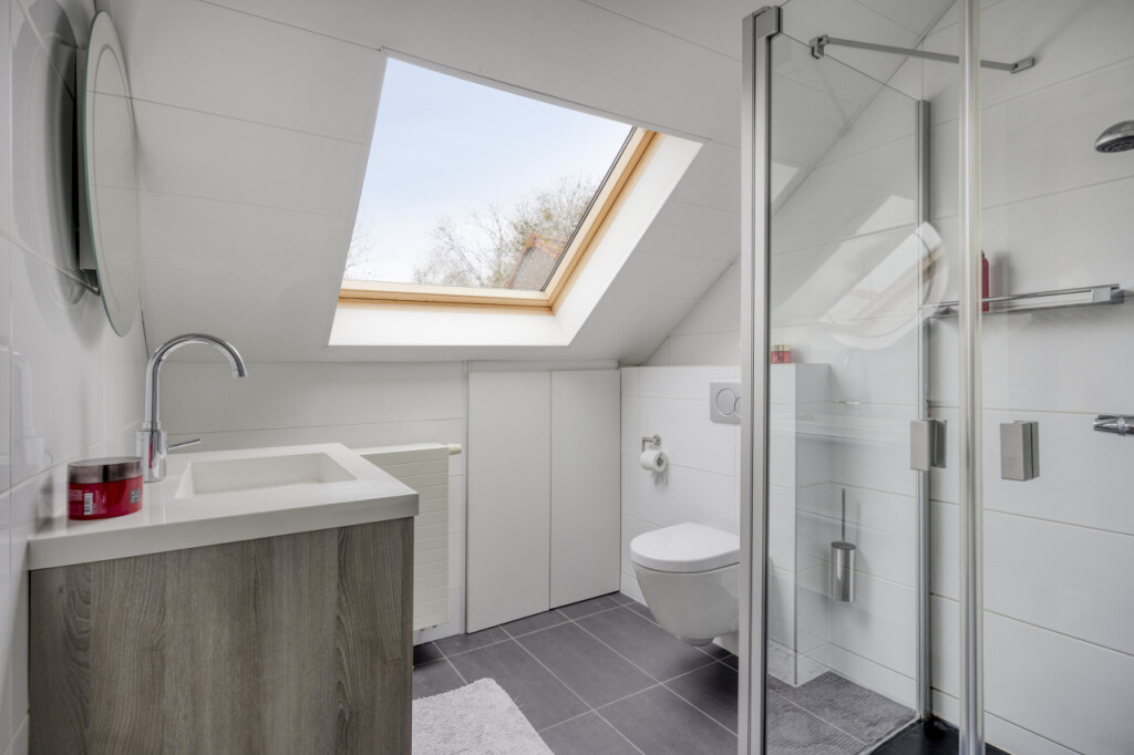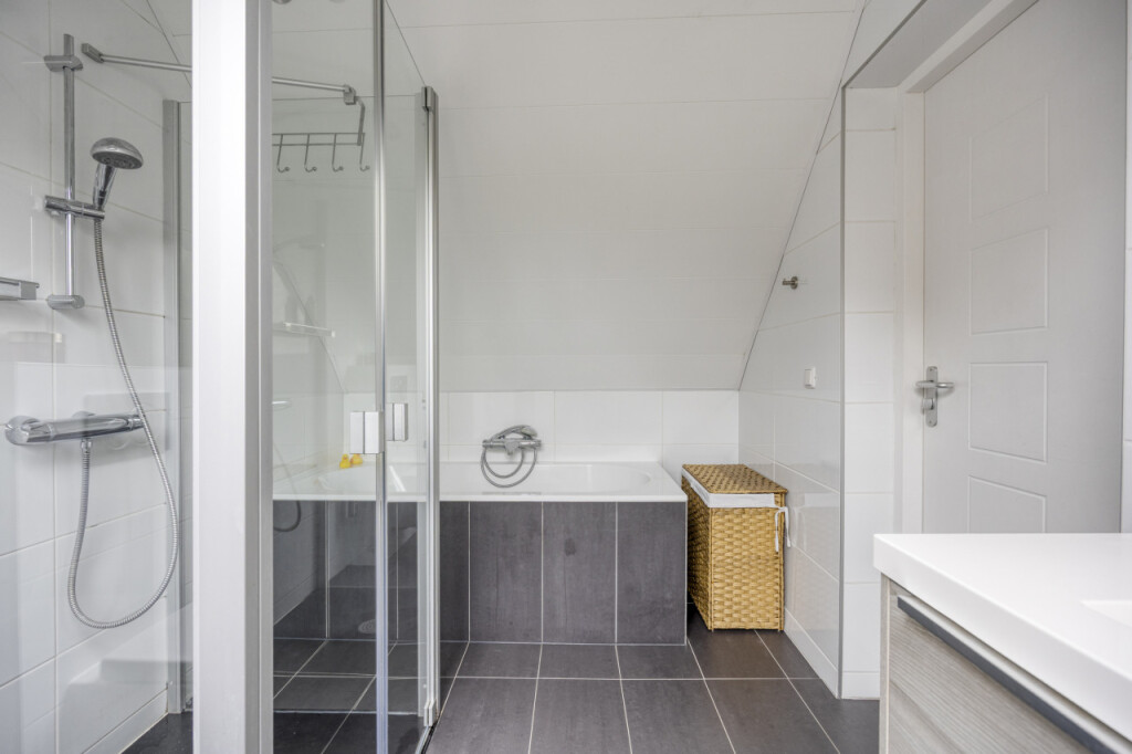 Boven kom je op de overloop die toegang biedt tot vier ruime slaapkamers en een badkamer. De badkamer is compleet ingericht met een toilet, bad, douche en wastafel met meubel. Via de vlizotrap bereik je de bergzolder, ideaal voor spullen die je niet dagelijks nodig hebt.