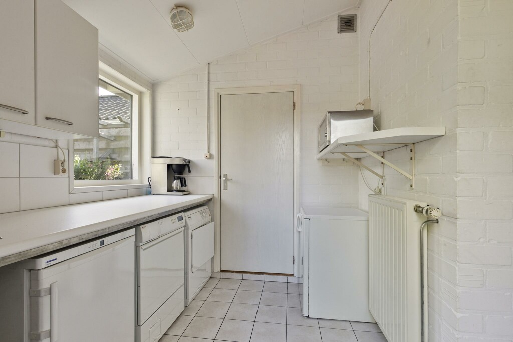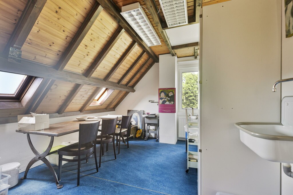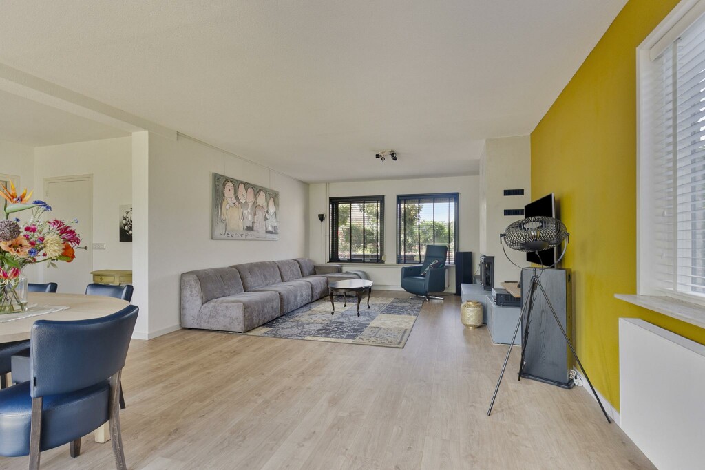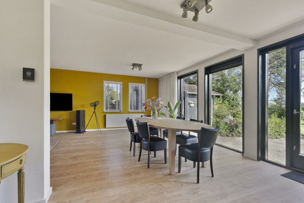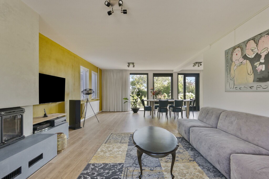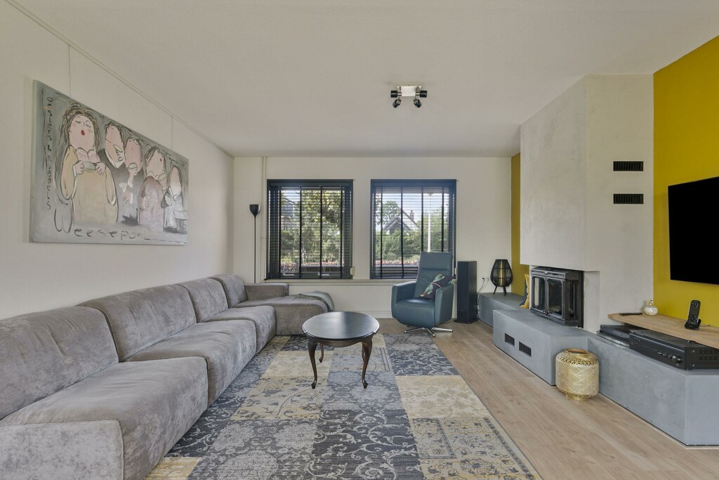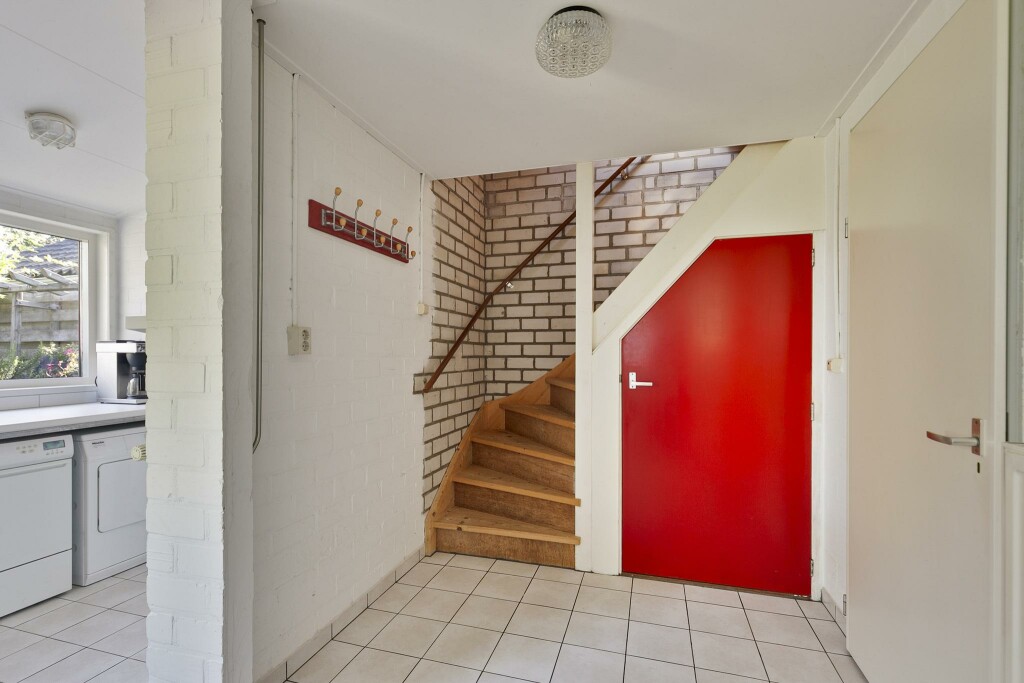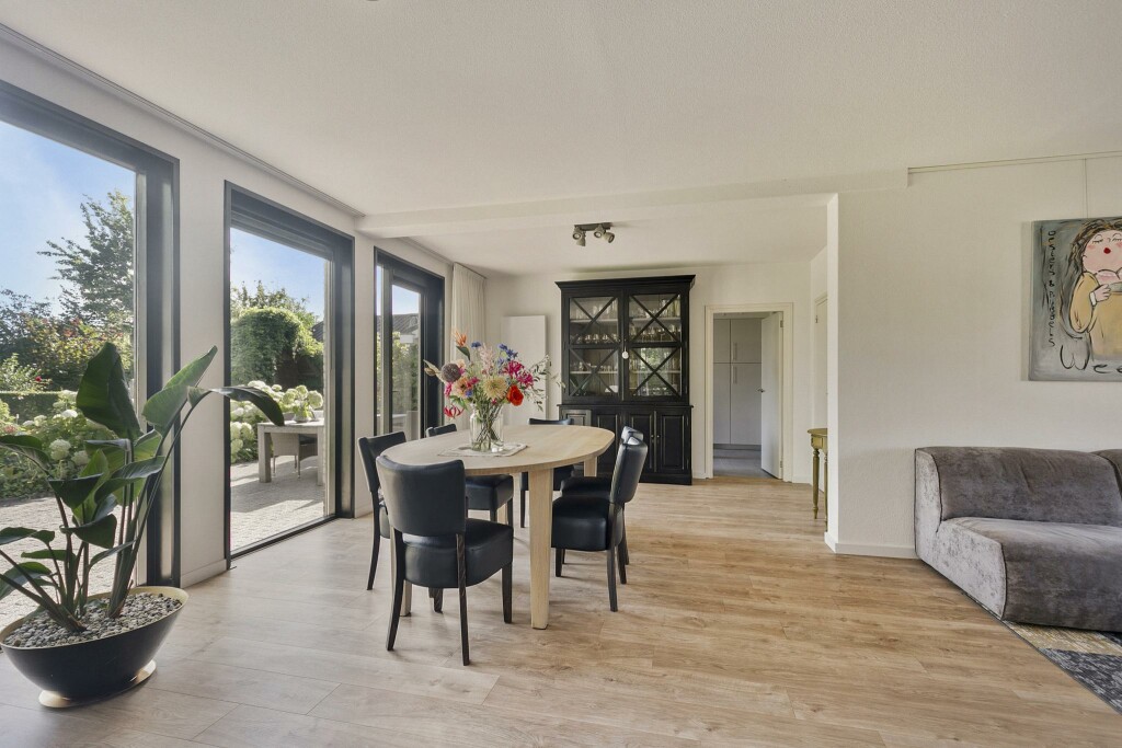 De lichte, L-vormige woonkamer geeft een prachtig uitzicht op de achtergelegen tuin en zorgt voor een zee van licht in de woonkamer. De zithoek is voorzien van een ingebouwde houthaard en de vloer is bekleed met een smaakvolle laminaat. Vanuit de keuken heb je toegang tot een halletje met daarin de deur naar de garage en de vaste trap naar de zolder boven de garage. Achter het halletje vind je de bijkeuken met ruimte voor wasmachine en andere apparatuur. Hier zit ook de achterdeur naar de achtergelegen tuin.