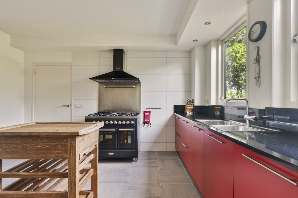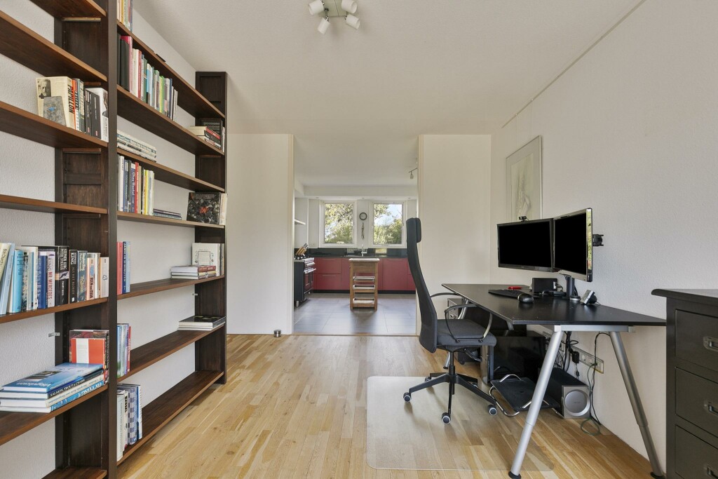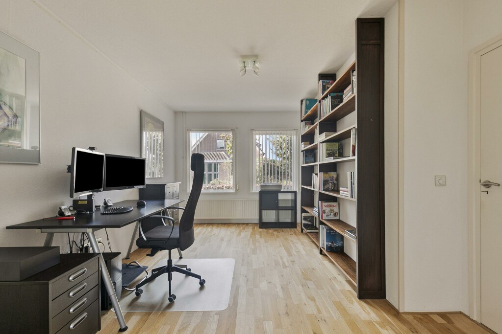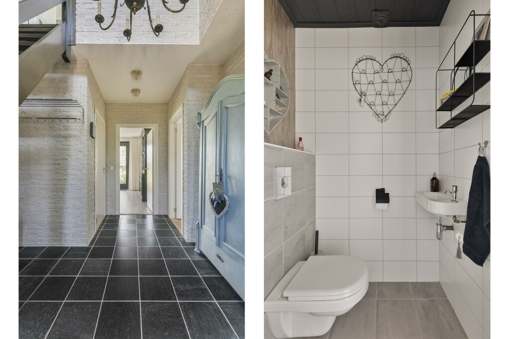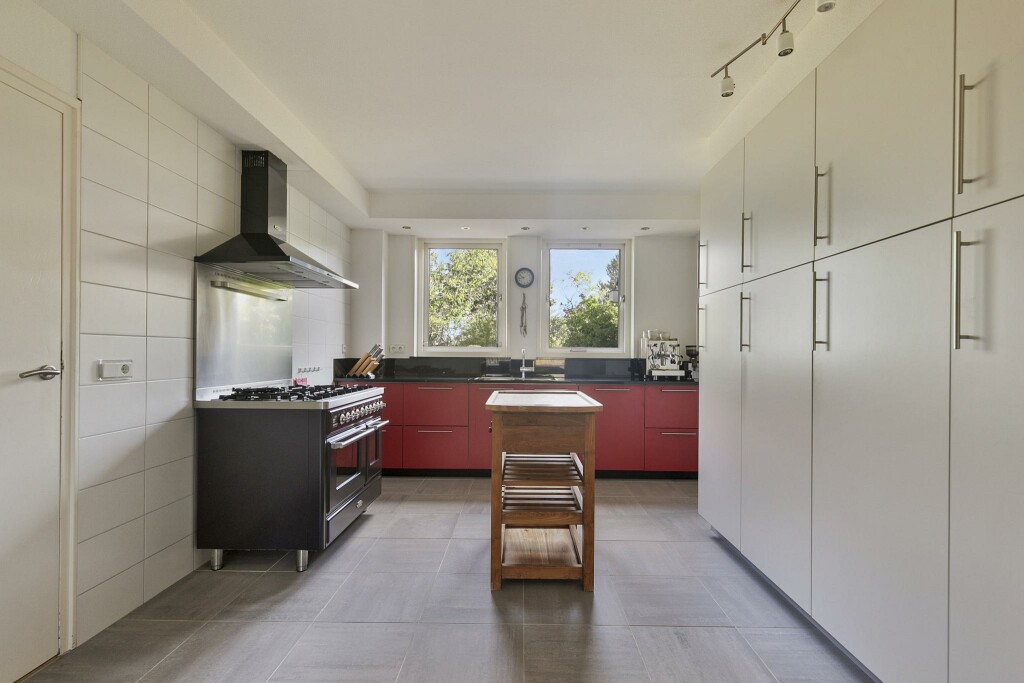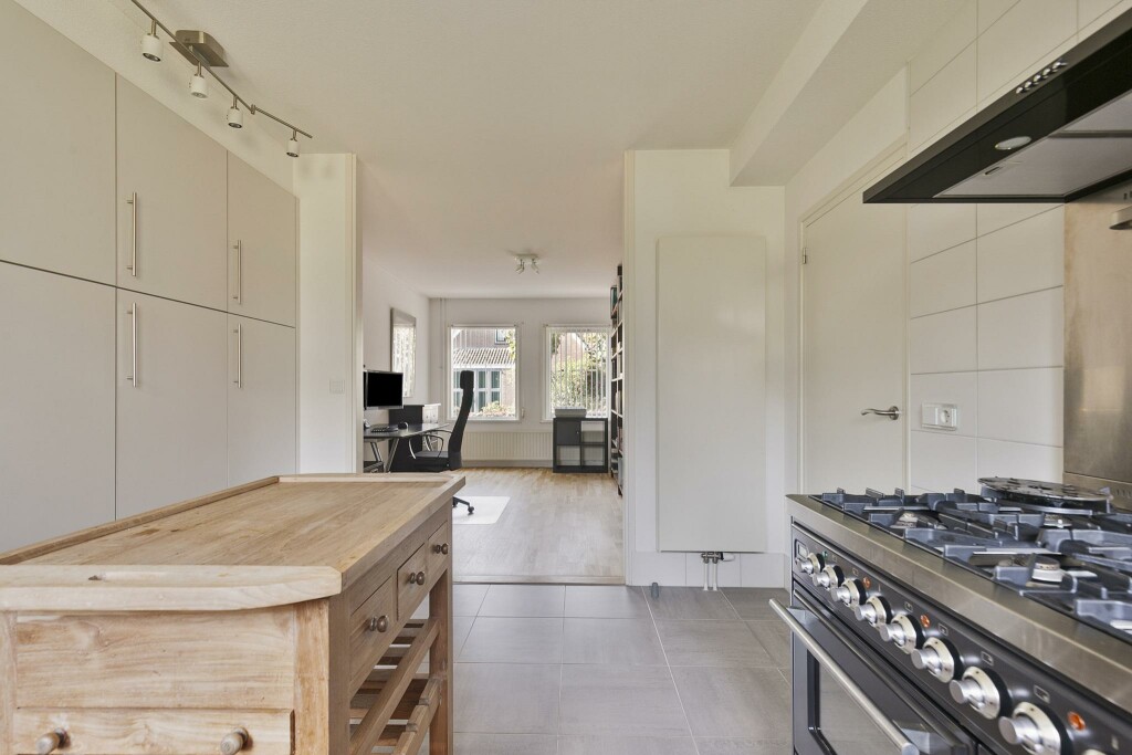 Je betreed de woning via de ruime hal die voorzien is van een fraaie donkere tegelvloer. Hier vind je meterkast, toilet en de trap naar de eerste verdieping. Vanuit de hal heb je toegang tot zowel de woonkamer als de werkkamer. De werkkamer staat in open verbinding met de keuken. De keuken is voorzien van een 6-pits gaskooktoestel dat is uitgerust met twee ovens en een afzuigkap.