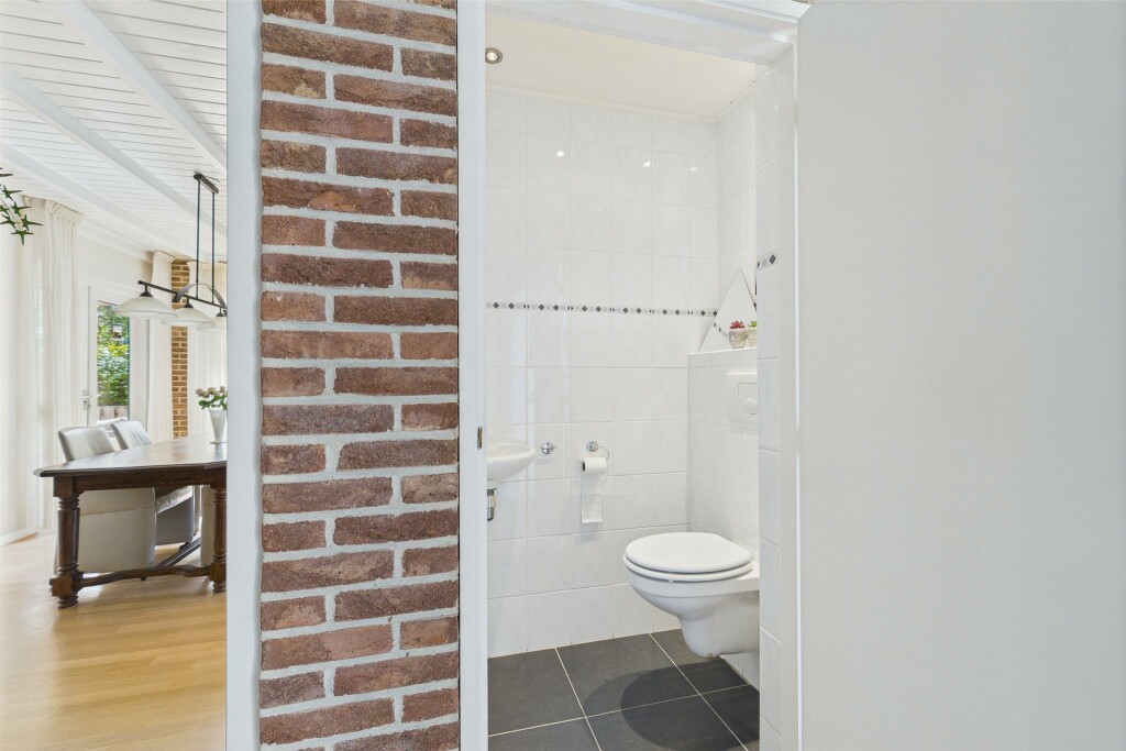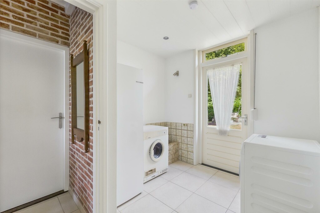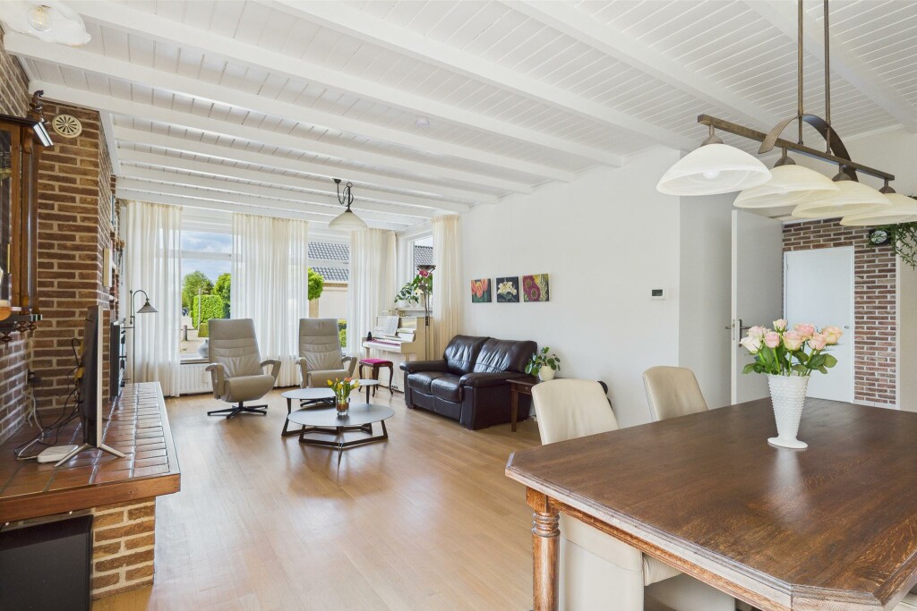 Indeling: je betreedt de woning via een royale hal met toegang tot diverse vertrekken, waaronder een modern toilet met zwevend closet en fonteintje, een slaapkamer (voorheen berging), de inpandige garage en een handige bijkeuken. De sfeervolle woonkamer is licht en uitnodigend dankzij grote raampartijen, een warme parketvloer, allesbrander, balkenplafond en openslaande tuindeuren naar het terras. De aansluitende gesloten keuken (2004) is uitgevoerd in een goede kwaliteit en voorzien van een nette hoekopstelling met diverse inbouwapparatuur, waaronder een inductiekookplaat, oven, magnetron, koelkast, afzuigkap en vaatwasser.