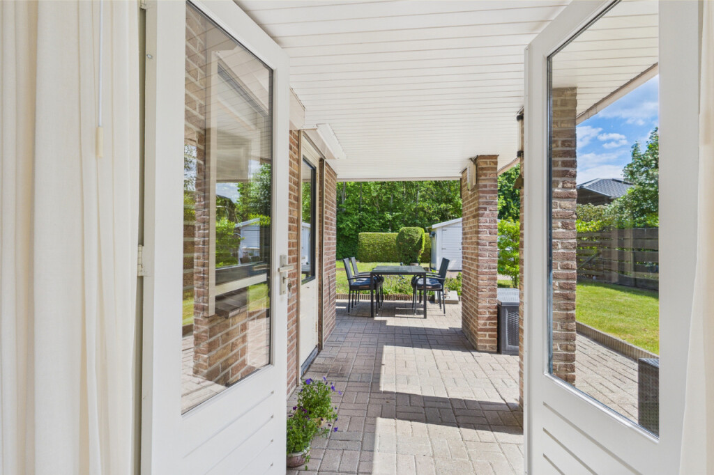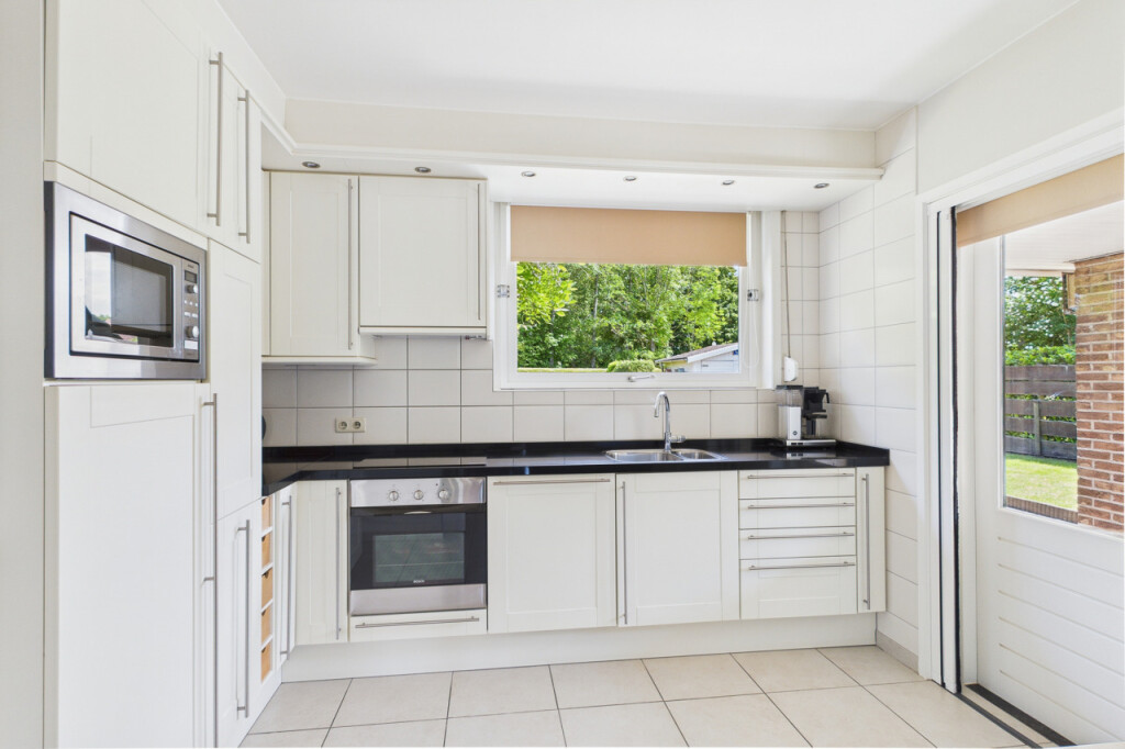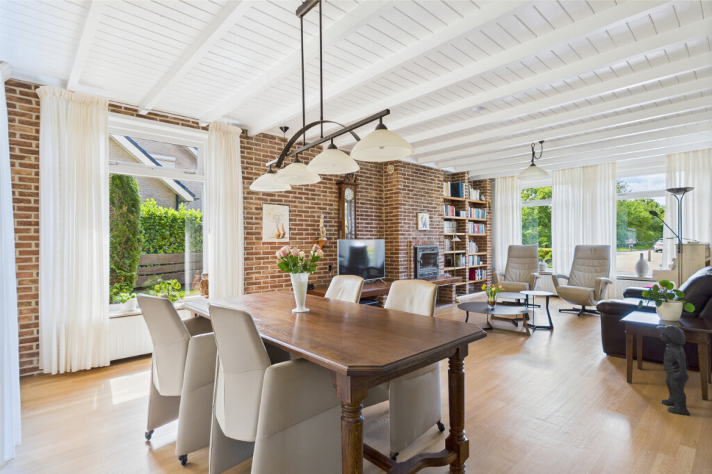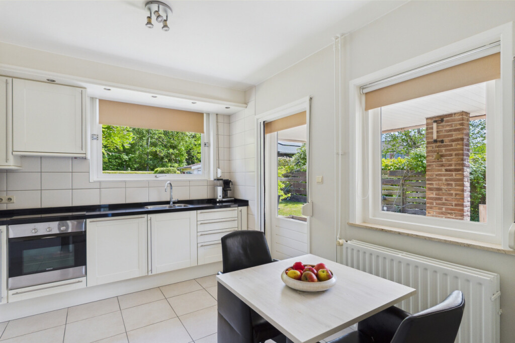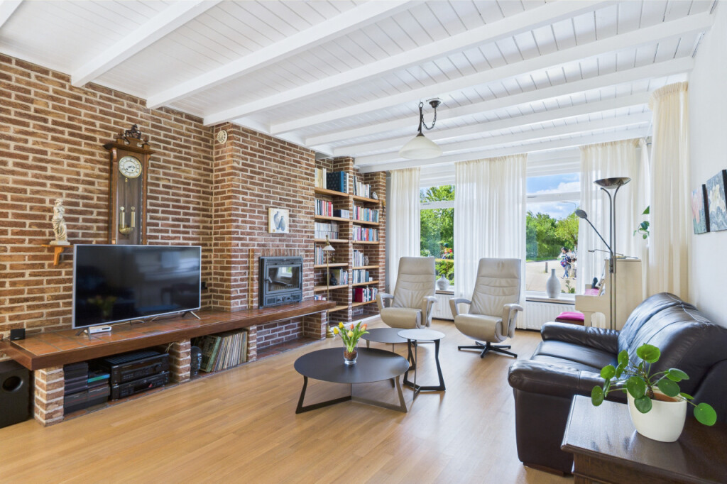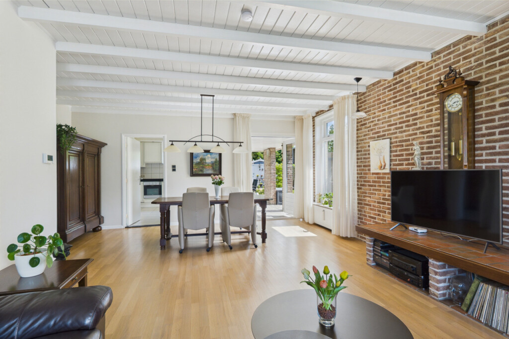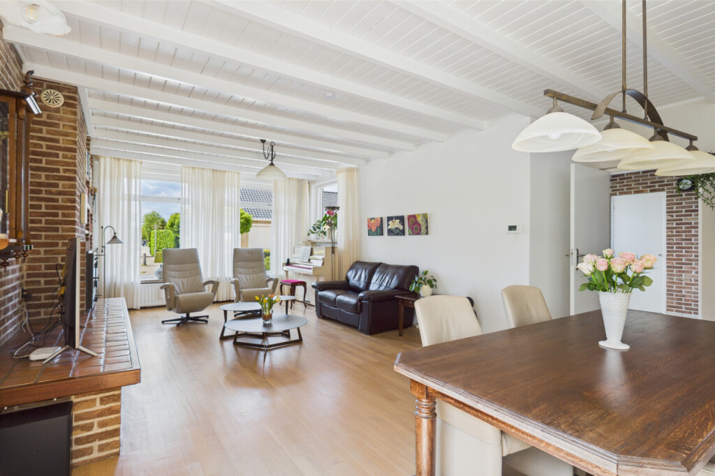 Indeling: je betreedt de woning via een royale hal met toegang tot diverse vertrekken, waaronder een modern toilet met zwevend closet en fonteintje, een slaapkamer (voorheen berging), de inpandige garage en een handige bijkeuken. De sfeervolle woonkamer is licht en uitnodigend dankzij grote raampartijen, een warme parketvloer, allesbrander, balkenplafond en openslaande tuindeuren naar het terras. De aansluitende gesloten keuken (2004) is uitgevoerd in een goede kwaliteit en voorzien van een nette hoekopstelling met diverse inbouwapparatuur, waaronder een inductiekookplaat, oven, magnetron, koelkast, afzuigkap en vaatwasser.