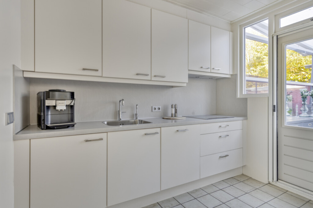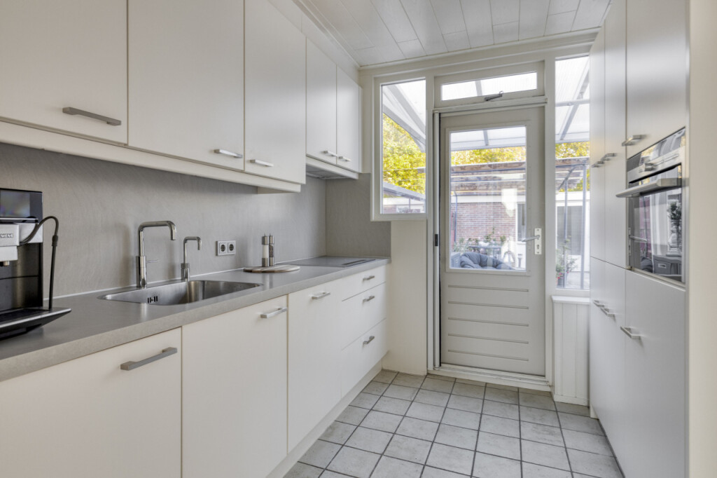 Bij binnenkomst kom je in de hal met toilet, trapopgang naar de eerste verdieping en een handige trapkast voor extra bergruimte. Vanuit de hal bereik je de dichte keuken, die is geplaatst in een dubbele rechte opstelling en is uitgerust met diverse inbouwapparatuur, zoals o.a. een inductiekookplaat, afzuigkap, combi-oven, vaatwasser, koelkast en spoelbak met Quooker. De nette keuken biedt toegang tot de lichte doorzonwoonkamer en de aangebouwde serre. De serre is een heerlijke plek om het hele jaar door van het buitenleven te kunnen genieten.