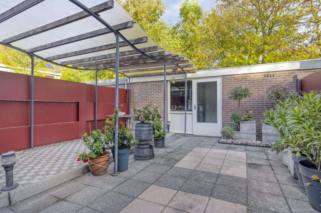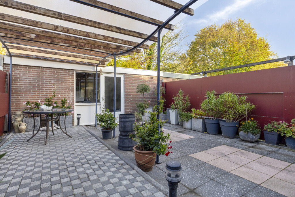 De achtertuin is verzorgd aangelegd. Dankzij de ligging op het noorden geniet je er van zowel zon als schaduw gedurende de dag. Achter in de tuin staat een ruime berging, perfect voor het opbergen van fietsen, tuingereedschap of andere spullen. Via de berging is er een doorgang naar de achterom.