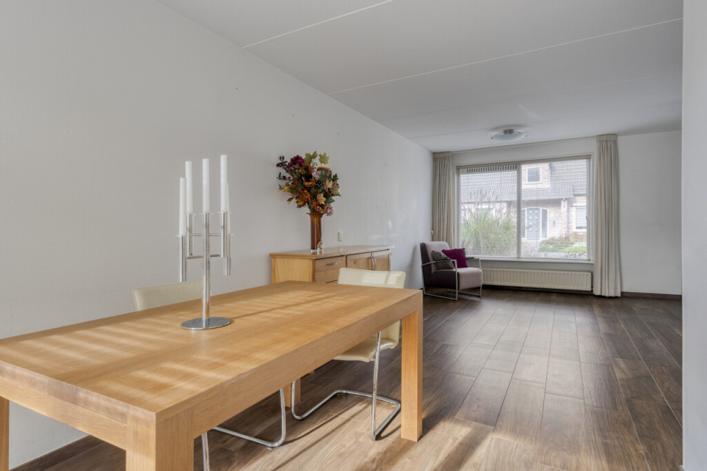 De doorzonwoonkamer is voorzien van een fraaie tegelvloer met houtlook.