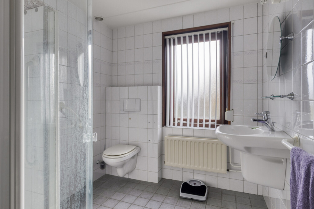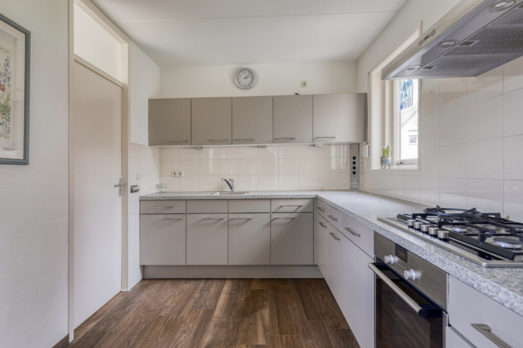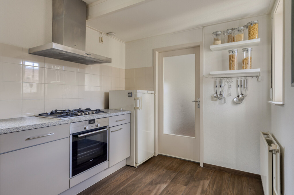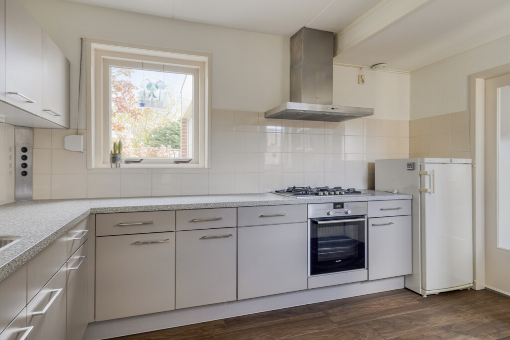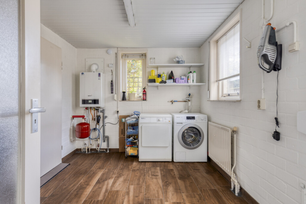Dankzij het zijraam valt er extra daglicht binnen, wat de keuken een prettige en lichte plek maakt. Aansluitend vind je de ruime bijkeuken, waar je de aansluitingen voor je witgoed hebt en waar de cv-ketel is opgesteld. Van hieruit stap je zo de achtertuin in en heb je direct toegang tot de garage, die is voorzien van een elektrische deur.