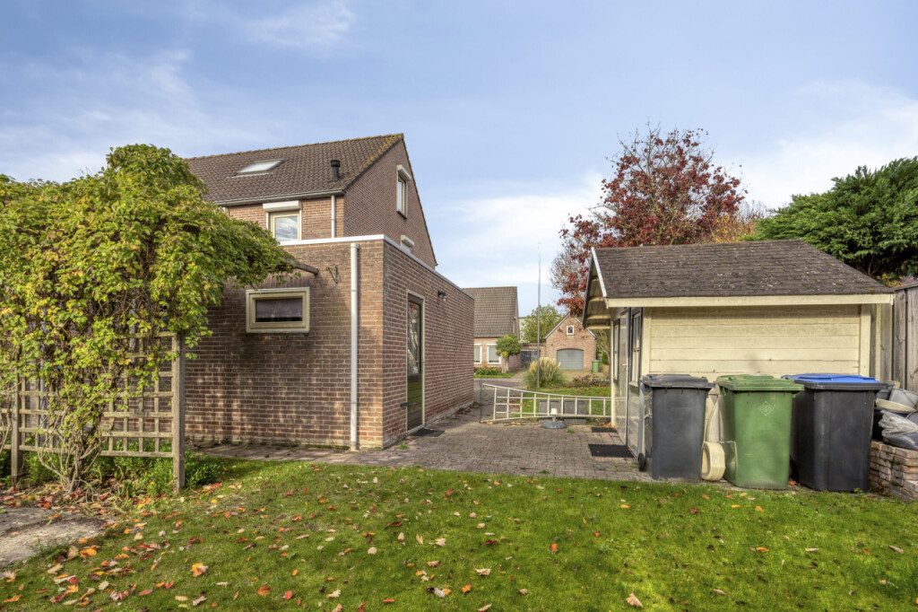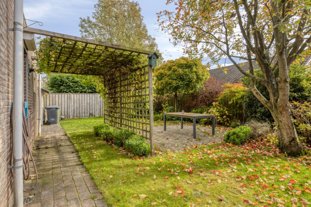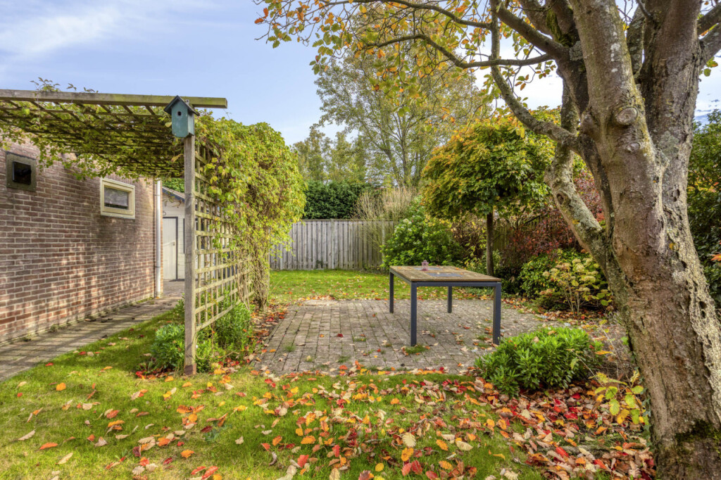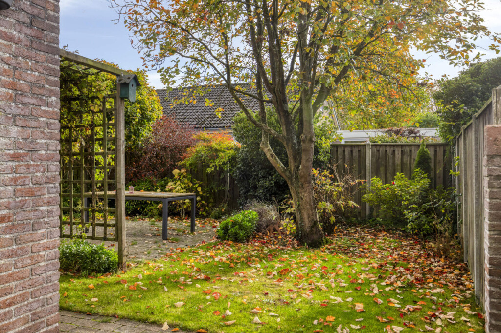 Dan de achtertuin: gelegen op het zonnige zuiden en een heerlijke combinatie van groen en terras. Je kunt hier zowel ontspannen in de zon als genieten van een gezellige barbecue. In het houten tuinhuis berg je eenvoudig al je tuinspullen op. Via een deur heb je hier ook rechtstreeks toegang tot de garage aan de zijkant.