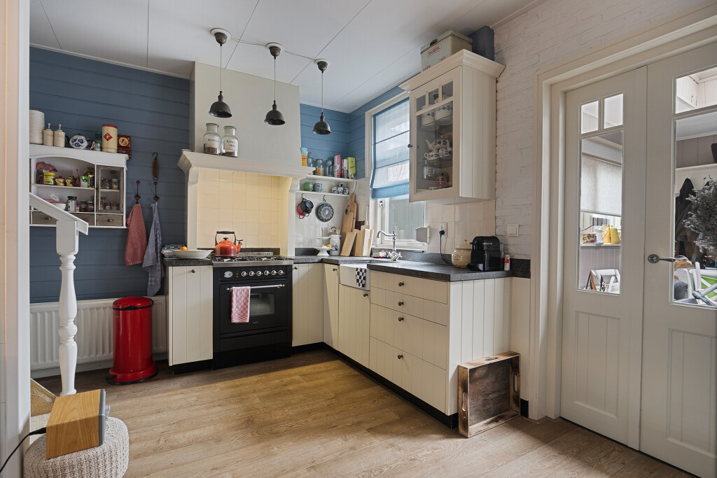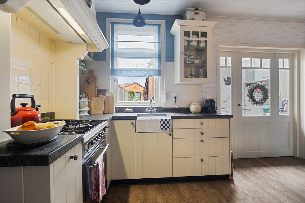 Entree in de hal met meterkast. Vanuit de hal komt u in de gezellige eetkeuken. De keuken heeft een hoekopstelling met een fraai natuursteen blad en is voorzien van een 4-pits gasfornuis, oven en afzuigkap. De knusse woonkamer heeft aan de voorzijde een erker en een schouw met een fraai sier (gas) kachel. Achter de keuken is er een deur naar een ruime bijkeuken. Hier treft u de wasmachineaansluiting en is er voldoende ruimte voor extra (keuken) apparatuur. Tevens vindt u hier de aansluiting van de c.v.-installatie (Remeha ca.’10). Vanuit de bijkeuken is er een deur naar de tuin en een deur naar de nette badkamer. De badkamer is voorzien van een toilet, wastafel en ruime douche.