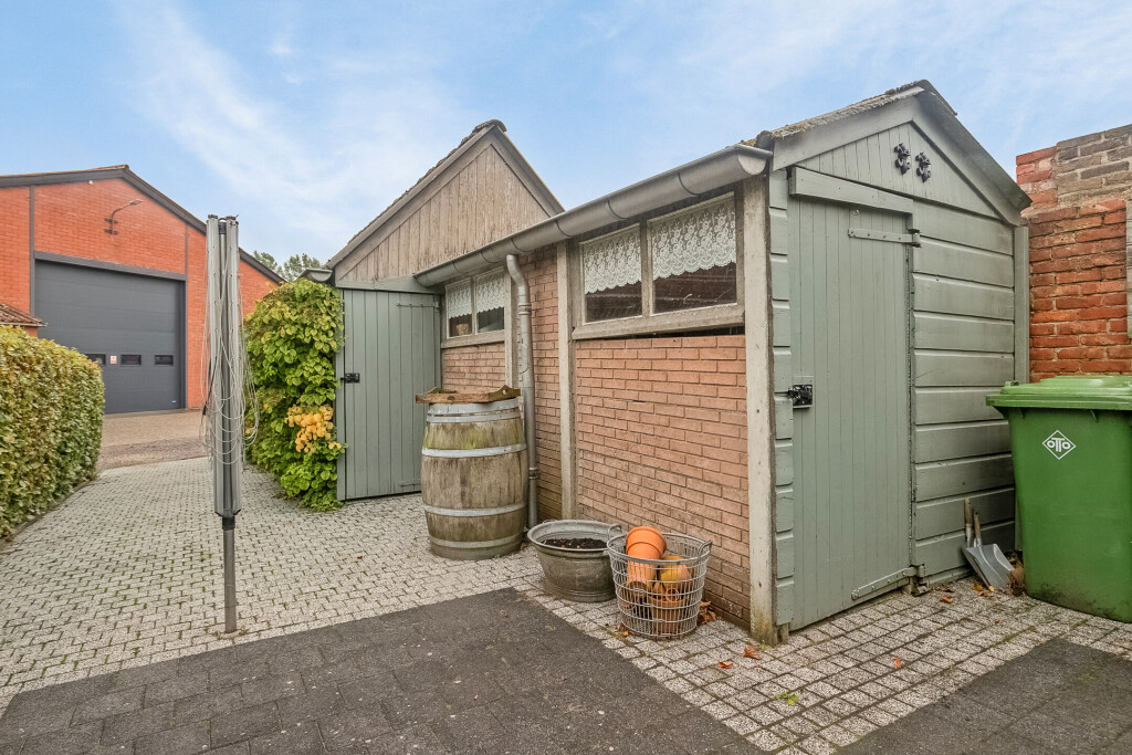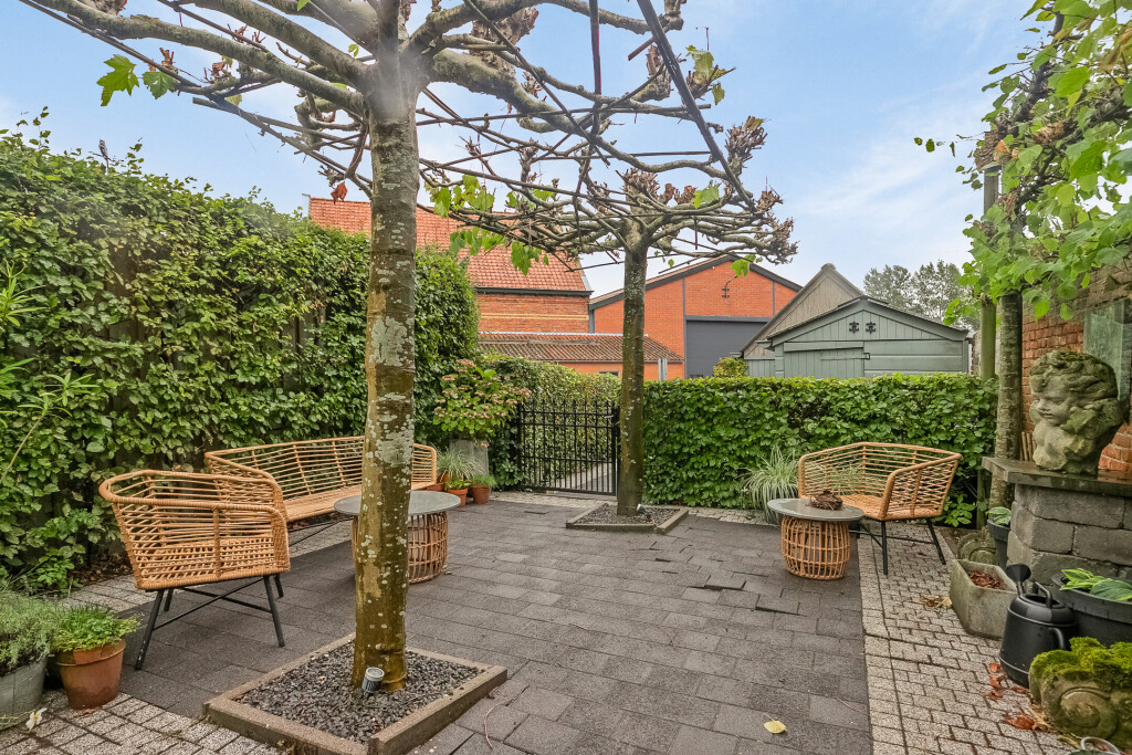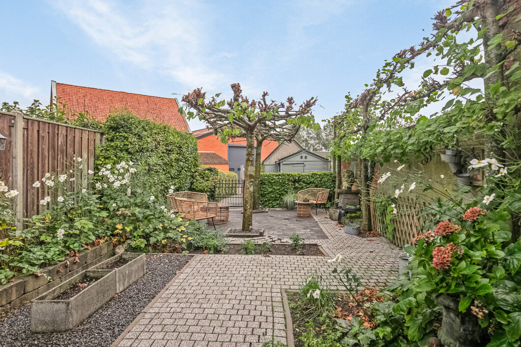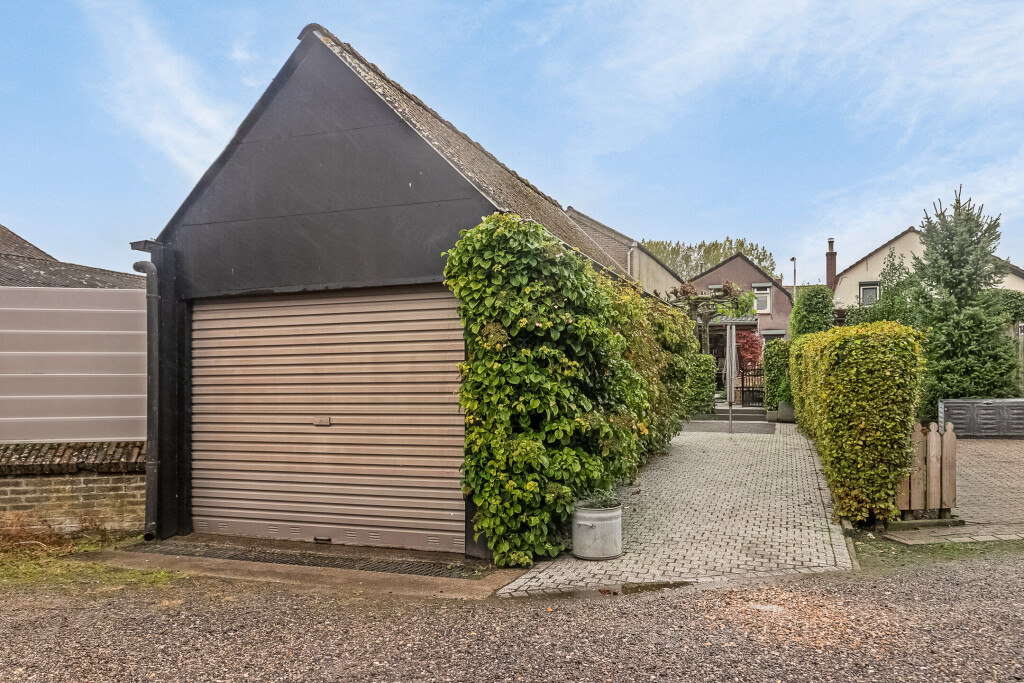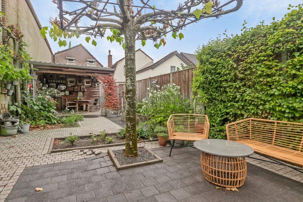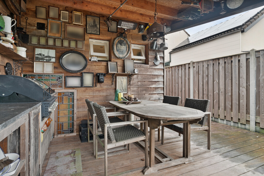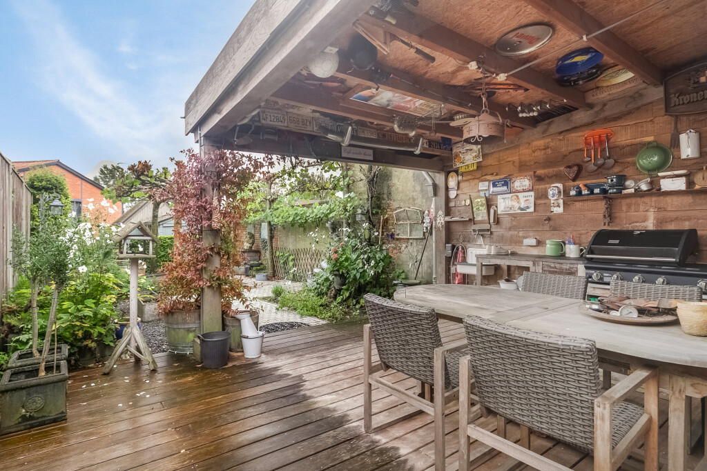 De tuin is verrassend diep. Direct aan de woning is er een fraaie overkapping met leuke buitenkeuken. Achterin de tuin is er nog een fijn terras met dakplatanen. Hier kunt u heerlijk beschut zitten, met veel privacy. Achter het gezellige terras is er toegang tot een handige bergschuur en een garage met grote bergzolder. De garage is toegankelijk voor uw auto via het straatje aan de achterzijde van de woning.