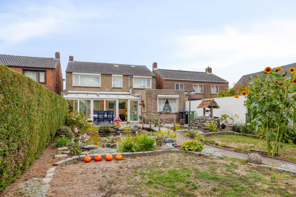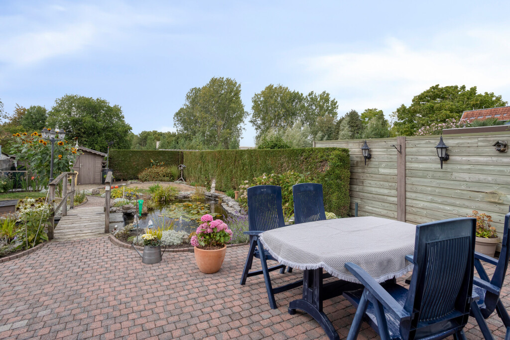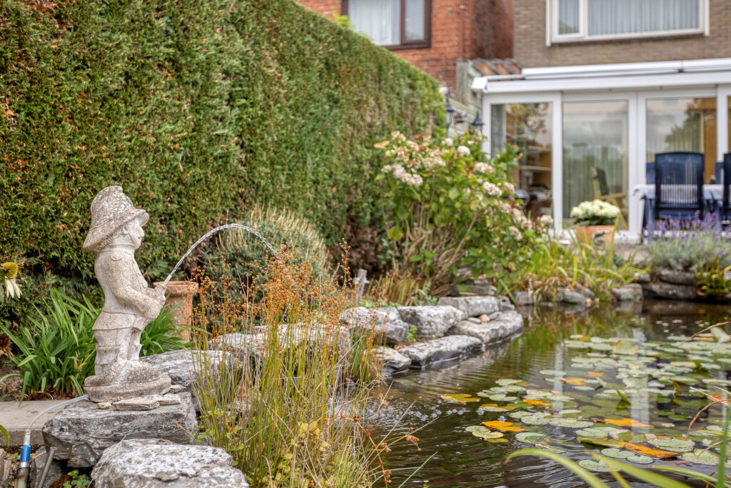 Heerlijk diepe en zonnige tuin met direct aan de woning een groot terras. Grote blikvanger is de fraaie vijverpartij, middenin de tuin. Lopend over het bruggetje komt u achterin de tuin met gezellige bloemborders, gazon en achterin een houten berging. De tuin biedt veel privacy door de hoge hagen.