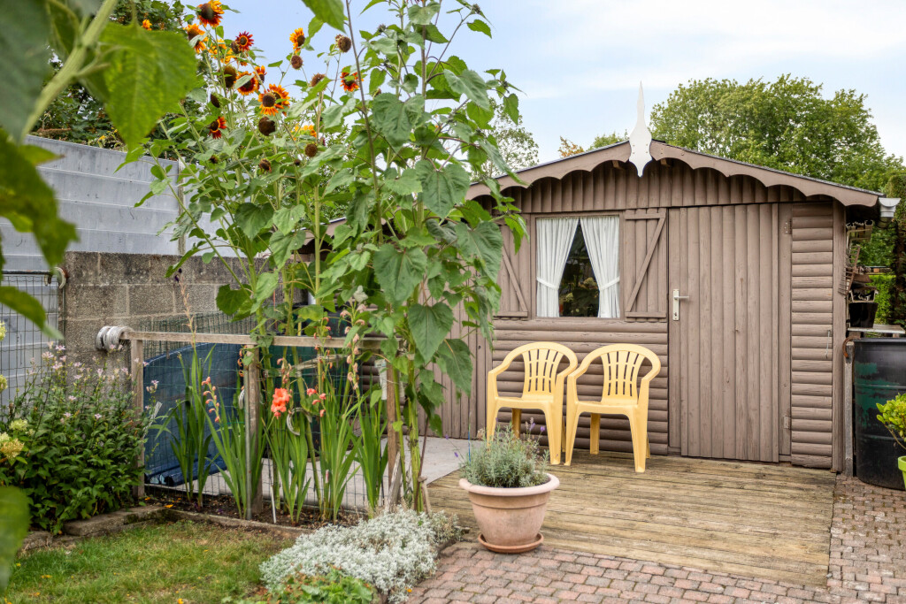 En stapt u naar buiten dan ontdekt u een zonnige, groene tuin met terras, vijver en een houten berging. Een fijne plek om te genieten van lange zomerdagen, een kop koffie in de ochtendzon of een gezellige barbecue met vrienden.