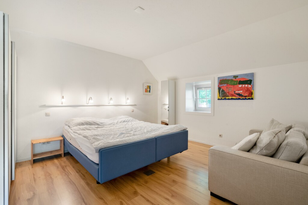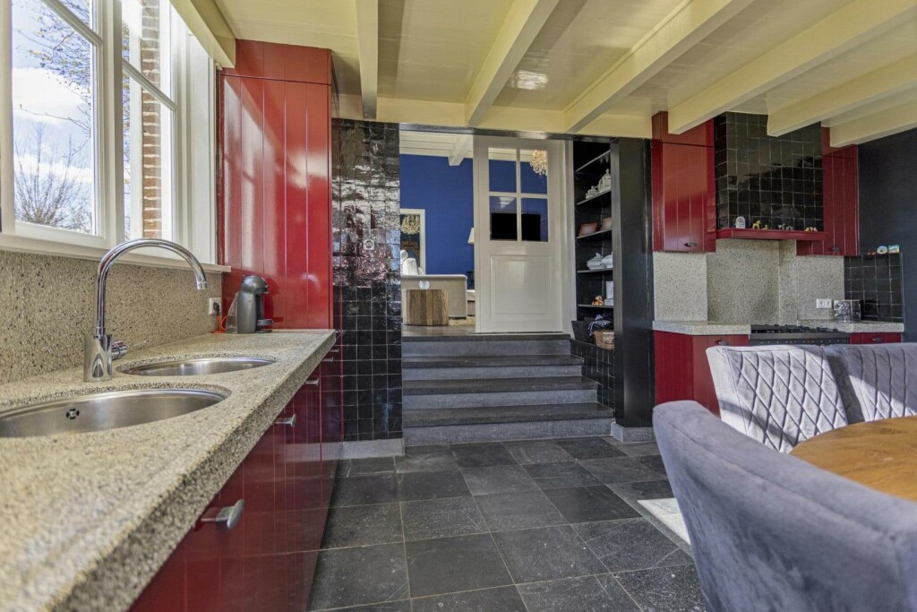 Via een kleine opstap komt u de imposante woonkamer, gekenmerkt door hoge plafonds met originele balken, een blauwstenen vloer, een schouw met houtkachel en een fenomenaal uitzicht. Vanuit de woonkamer zijn twee afzonderlijke kamers bereikbaar. Deze woonkamer is een doorzon woonkamer met veel ligt en zowel aan zuid als aan noord zijde voorzien van tuindeuren.