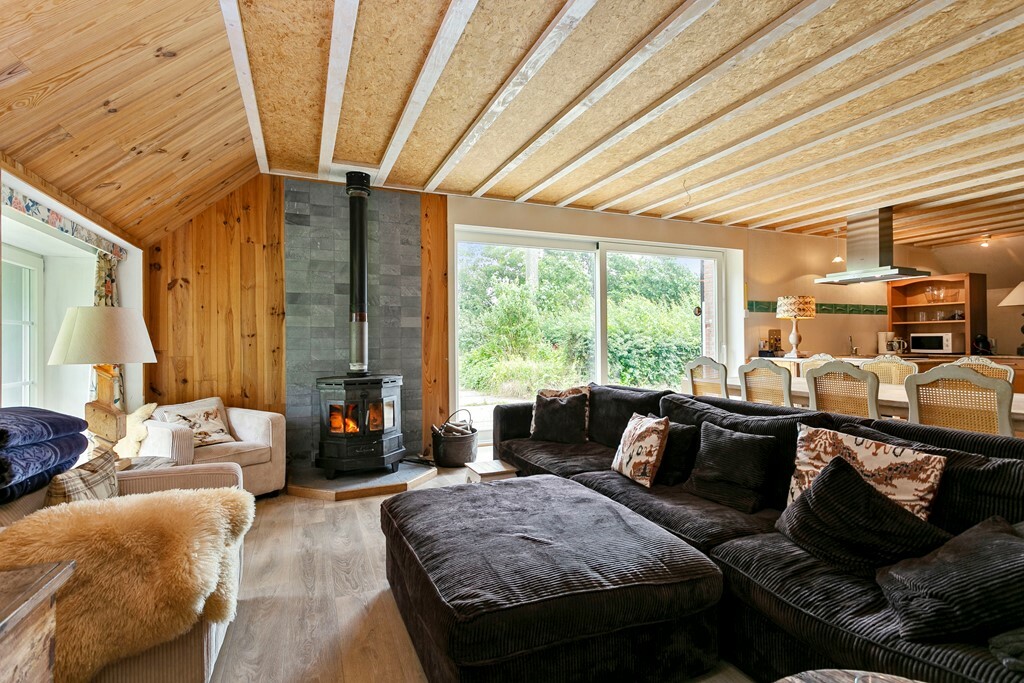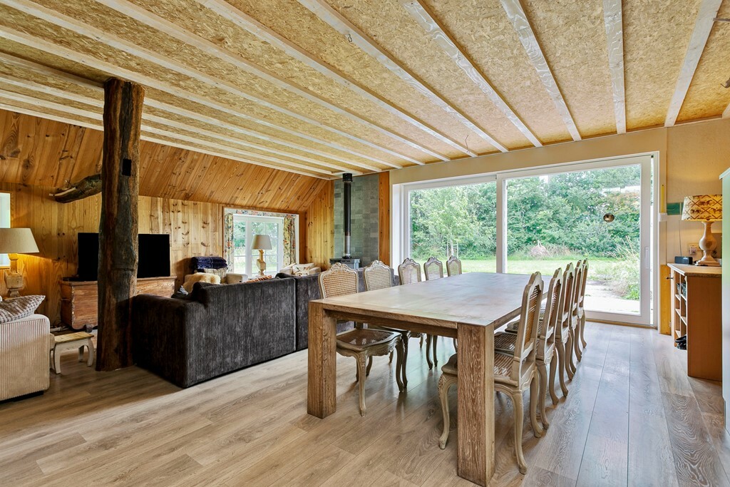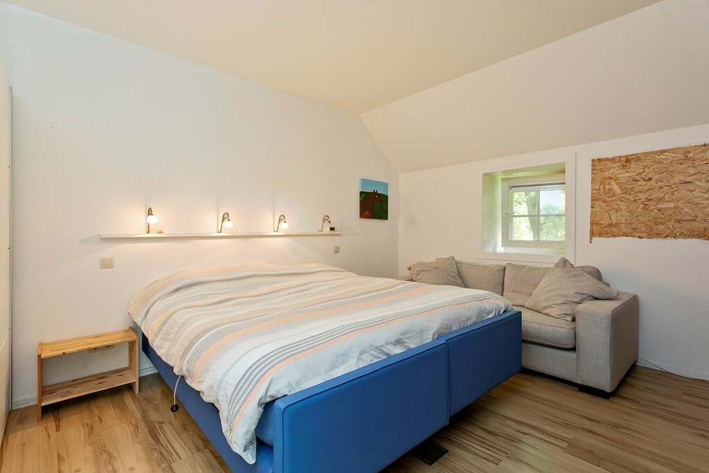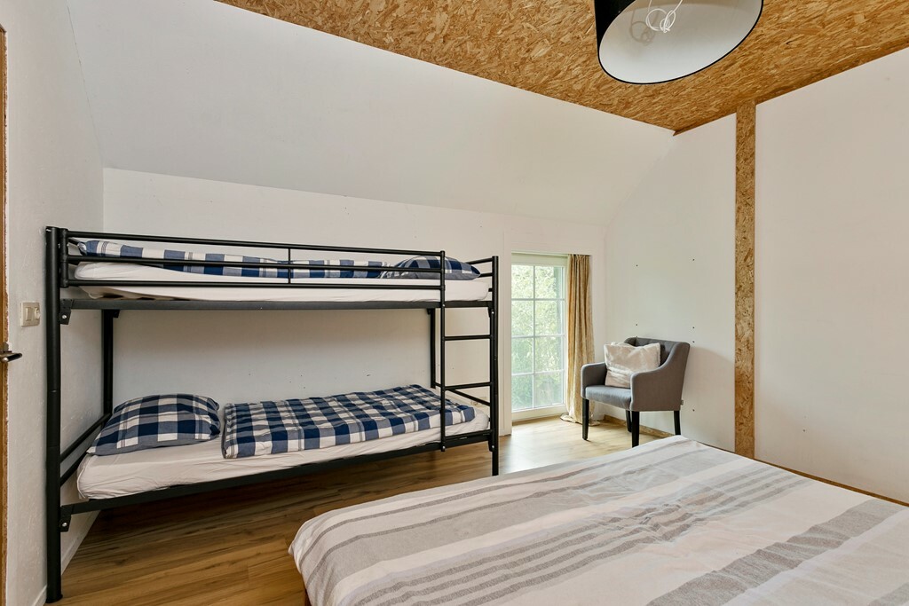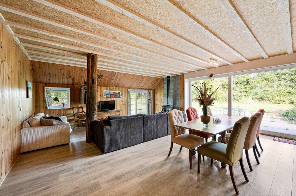De keuken staat in open verbinding met de lichte woonkamer, voorzien van houtkachel en grote raampartijen met schuifpui naar het landschap. Vanuit de woonkamer bereikt u de tweede slaapkamer en badkamer met douche, toilet, wastafel en ligbad.