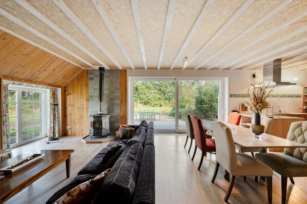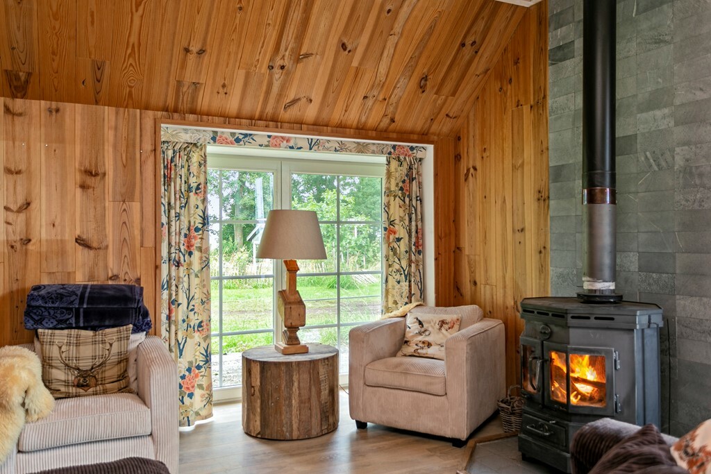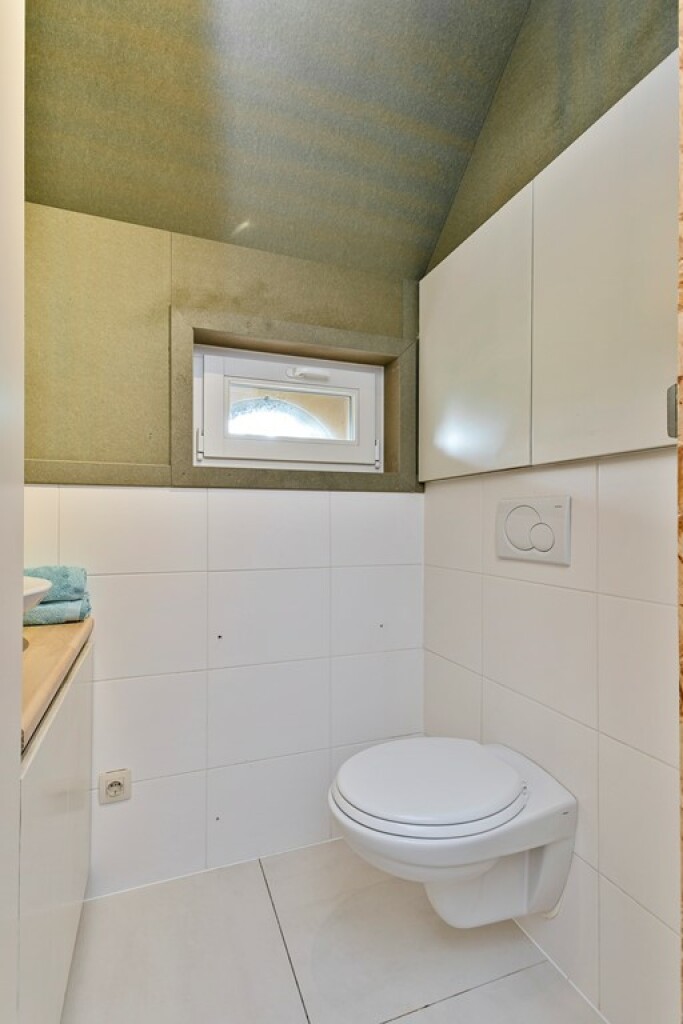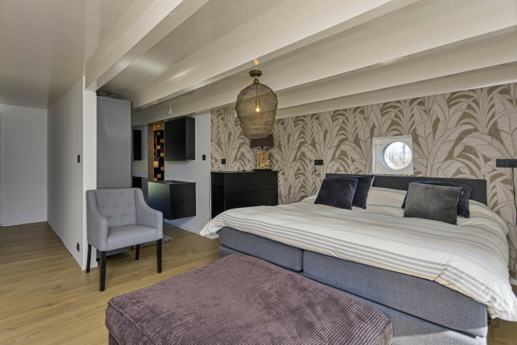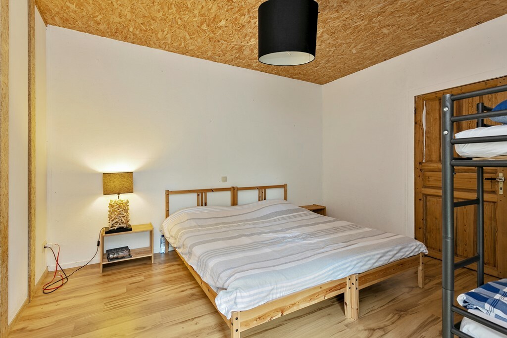 De keuken staat in open verbinding met de lichte woonkamer, voorzien van houtkachel en grote raampartijen met schuifpui naar het landschap. Vanuit de woonkamer bereikt u de tweede slaapkamer en badkamer met douche, toilet, wastafel en ligbad.