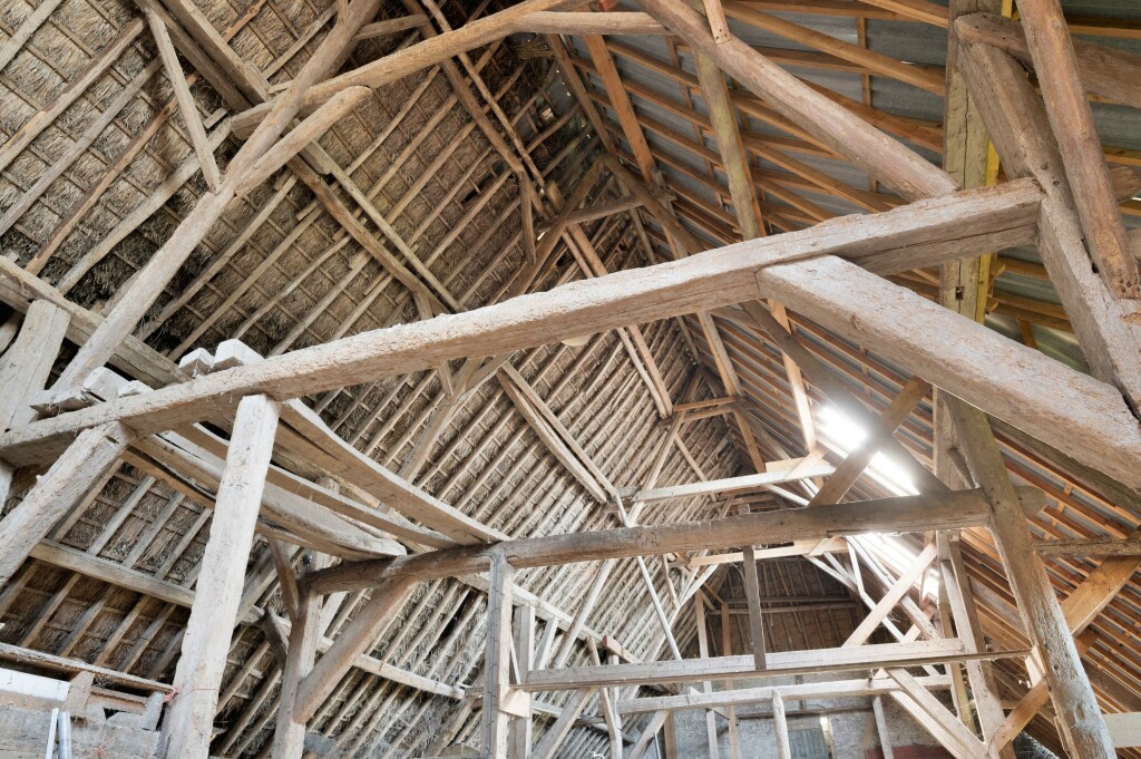 oude houten spanten, paardenstallen en koestallen