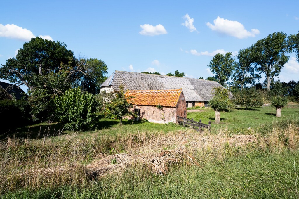 o een imposante monumentale boerenschuur met inpandige woning met deels gepotdekselde gevels en originele