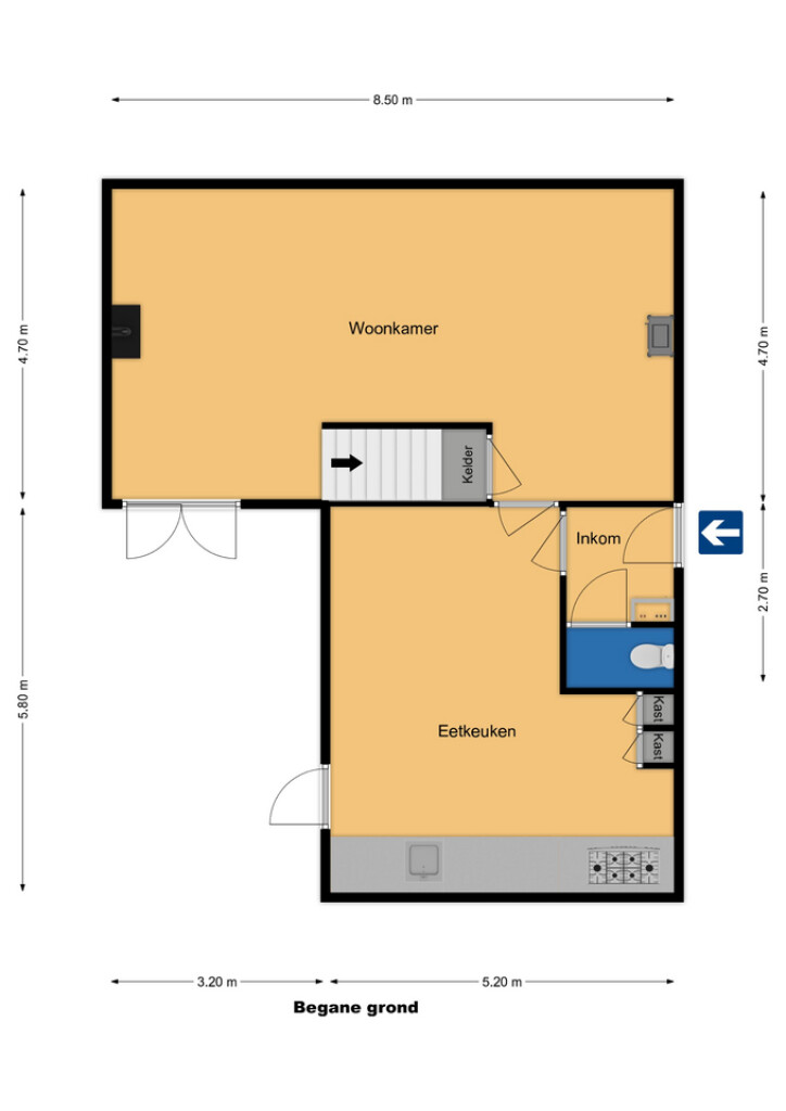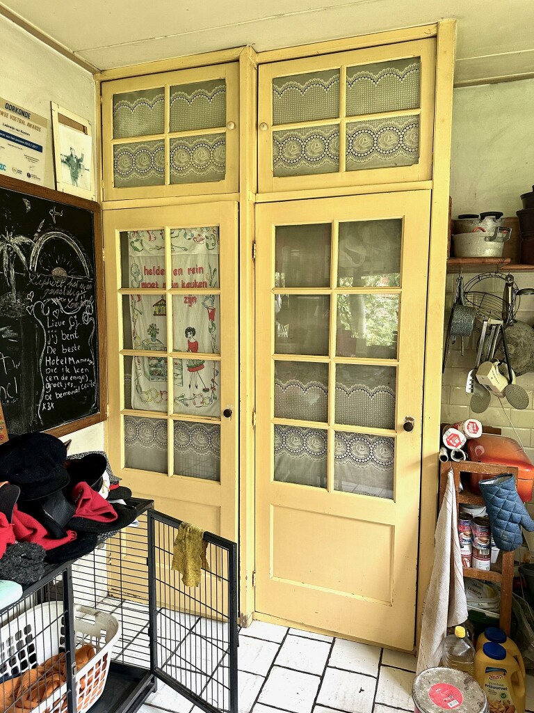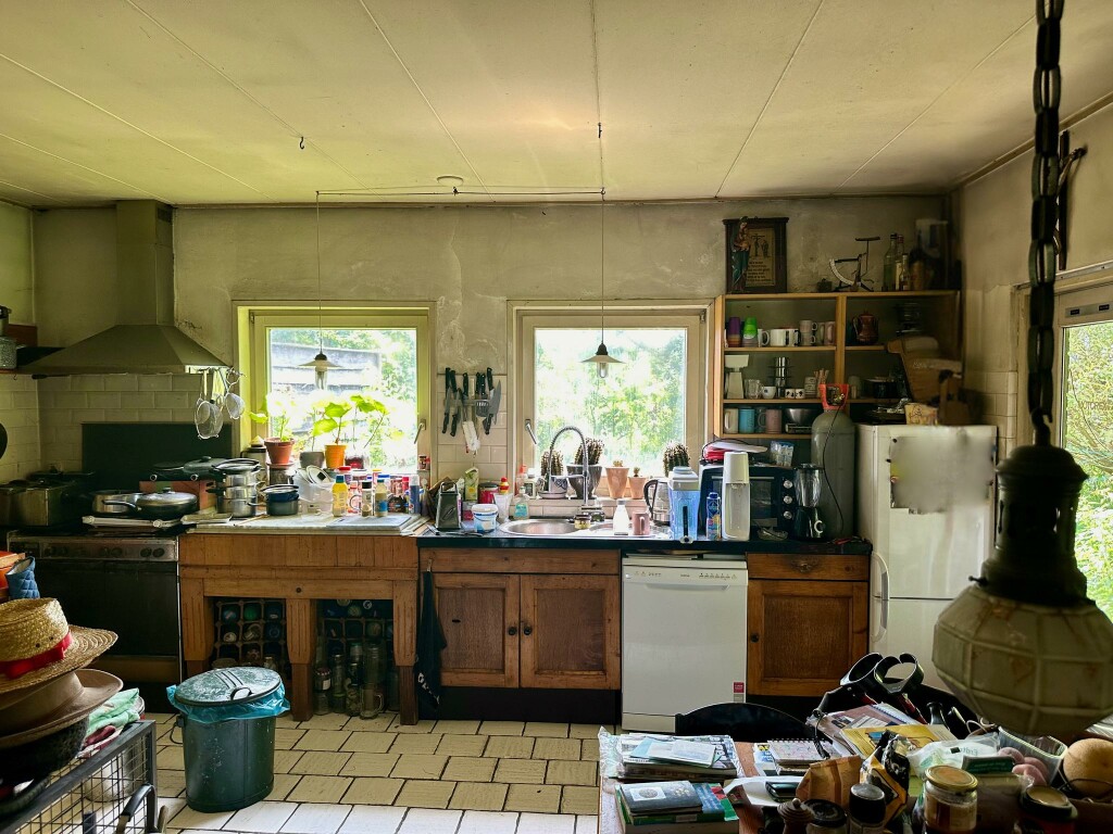 Hal met toiletruimte. Woonkamer met houten vloer, een authentiek balkenplafond, een houtkachel en een haard. De ruime eetkeuken met kastruimte is voorzien van een groot gasfornuis met oven, hakblok en koelkast. Hier is genoeg ruimte voor een grote eettafel waar u samen met familie en vrienden kunt genieten van heerlijke maaltijden. De droge kelder is ideaal voor opslag.
