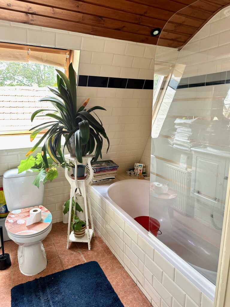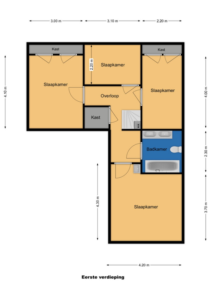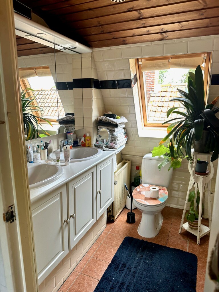 De eerste verdieping bereikt u via een vaste trap vanuit de woonkamer. Op de overloop vindt u een bergkast voor extra opbergruimte. Deze verdieping herbergt vier slaapkamers. In de grootste slaapkamer ligt een grenen vloer en is voorzien van een wastafel, wat extra gemak biedt. In de drie andere slaapkamers ligt een parketvloer en twee slaapkamers hebben inbouwkasten. De badkamer is uitgerust met een ligbad, een dubbel wastafelmeubel en een toilet.