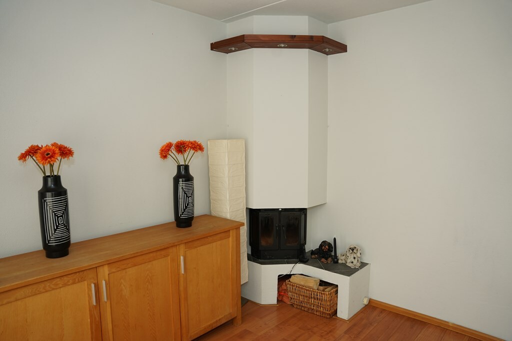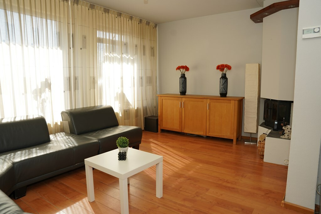Vanuit hier stap je zo de gezellige L-vormige woonkamer in, waar de houtkachel zorgt voor sfeer en warmte tijdens de koudere maanden. De vloer is afgewerkt met een onderhoudsvriendelijke laminaatvloer.