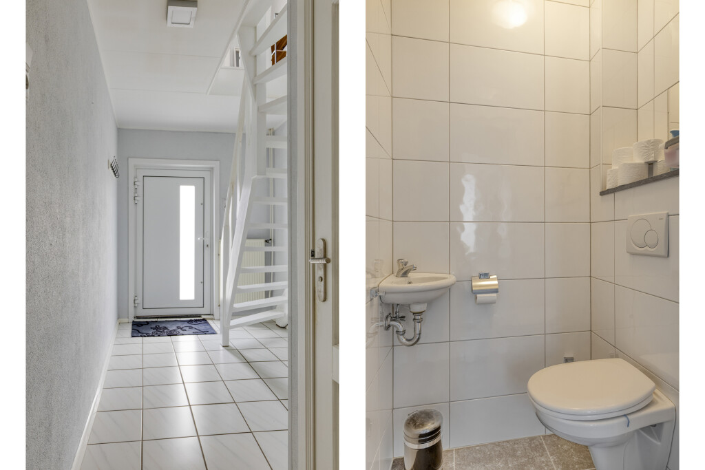 Entree via de hal met tegelvloer, open trap naar de eerste verdieping en toiletruimte. Het toilet is geheel betegeld en voorzien van hangtoilet en fonteintje. Vanuit de hal heb je toegang tot de woonkamer met royale open woonkeuken.