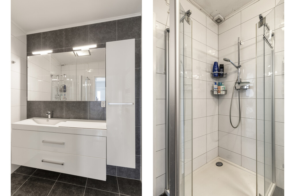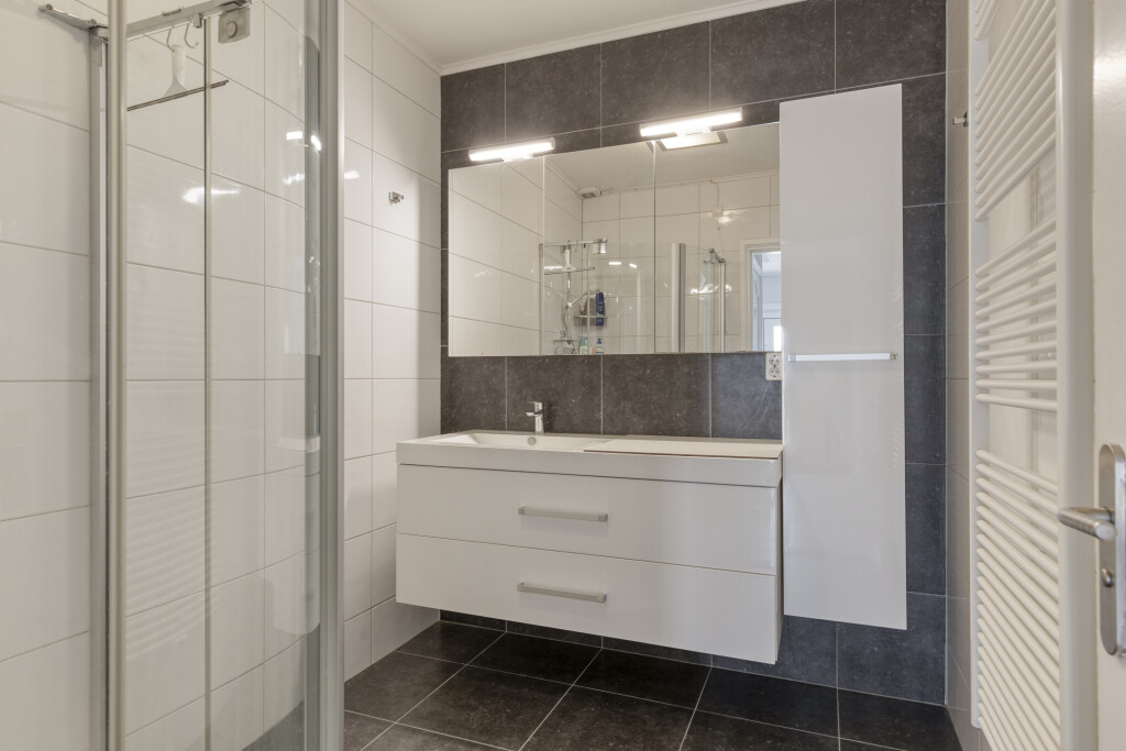 De badkamer bevindt zich op de begane grond en is geheel betegeld en uitgerust met een douche en dubbele wastafel met meubel en kast.
