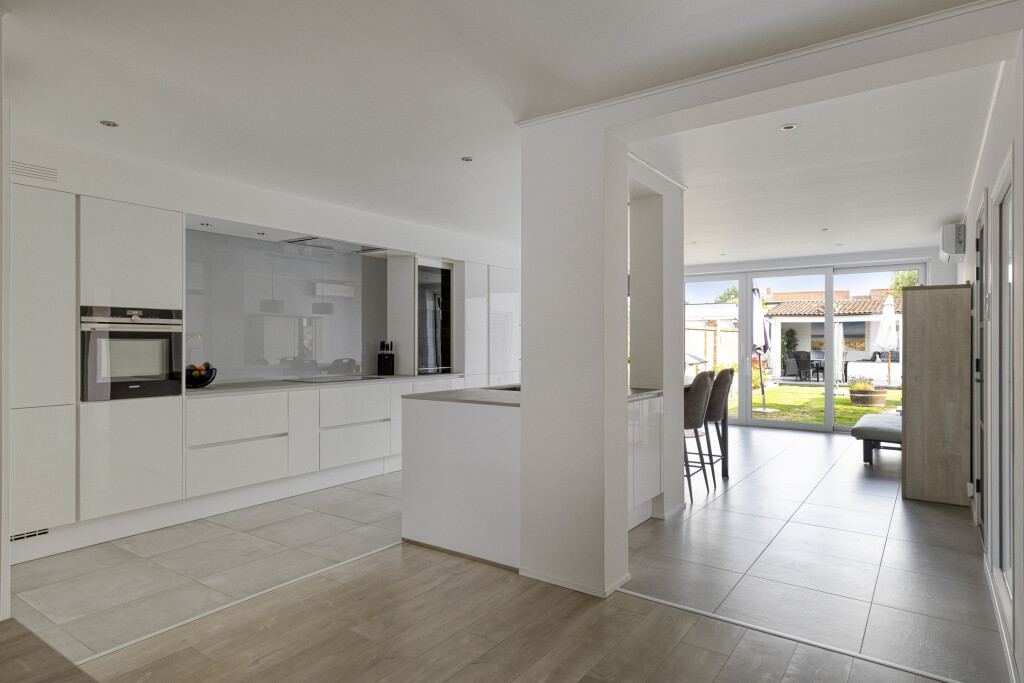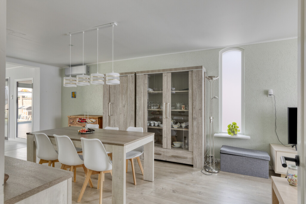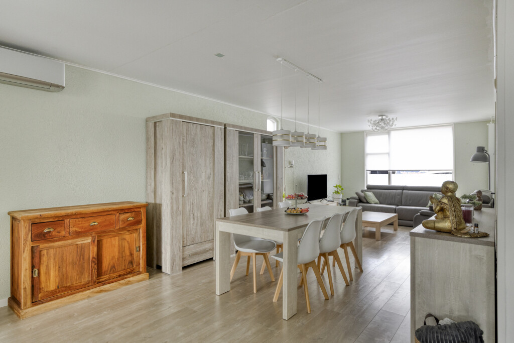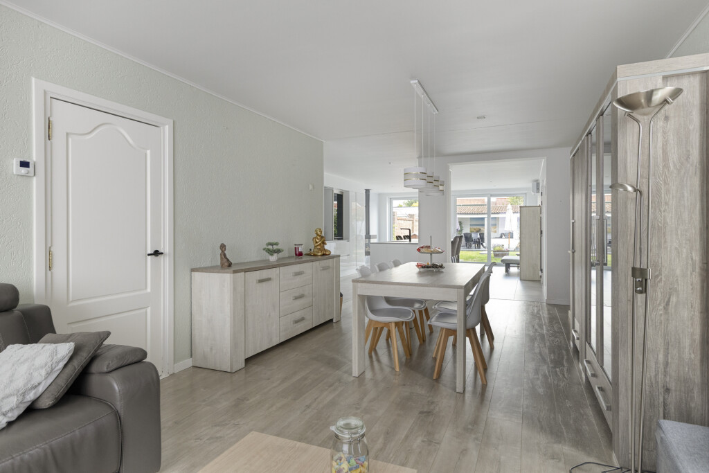 De woonkamer is voorzien van een laminaatvloer, airco-unit en rolluik aan de straatkant. Door een extra raam aan de zijkant én de uitbouw is er aan daglicht in de woonkamer geen gebrek.