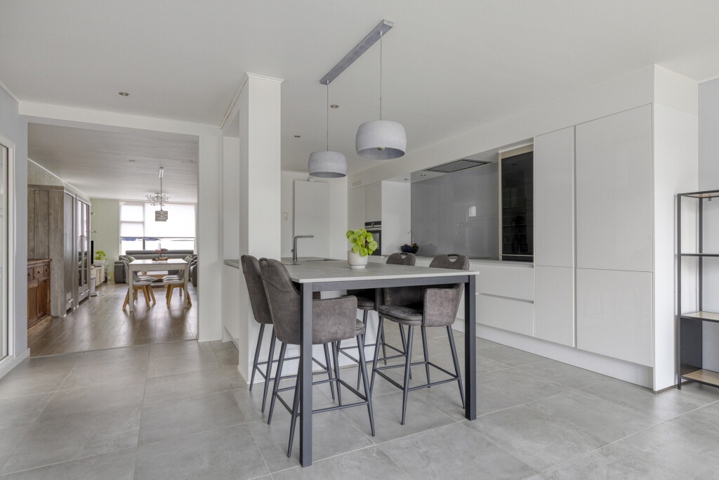 De royale woonkeuken heeft een moderne tegelvloer, is opgesteld in een rechte wandopstelling met spoeleiland inclusief eetbar en voorzien van uitgebreide inbouwapparatuur;