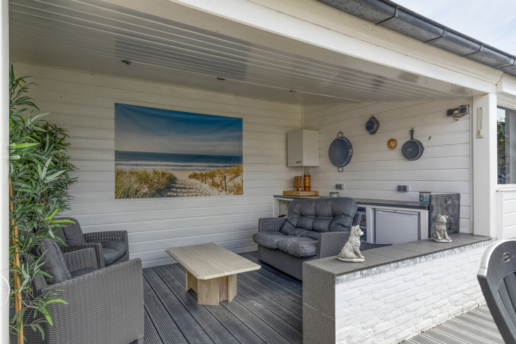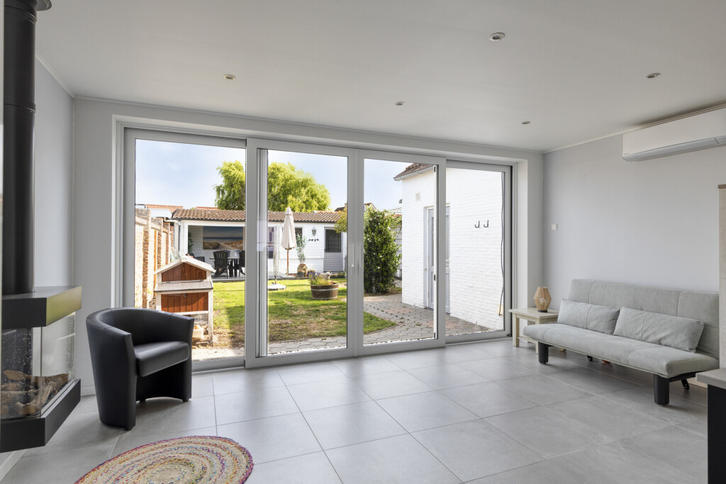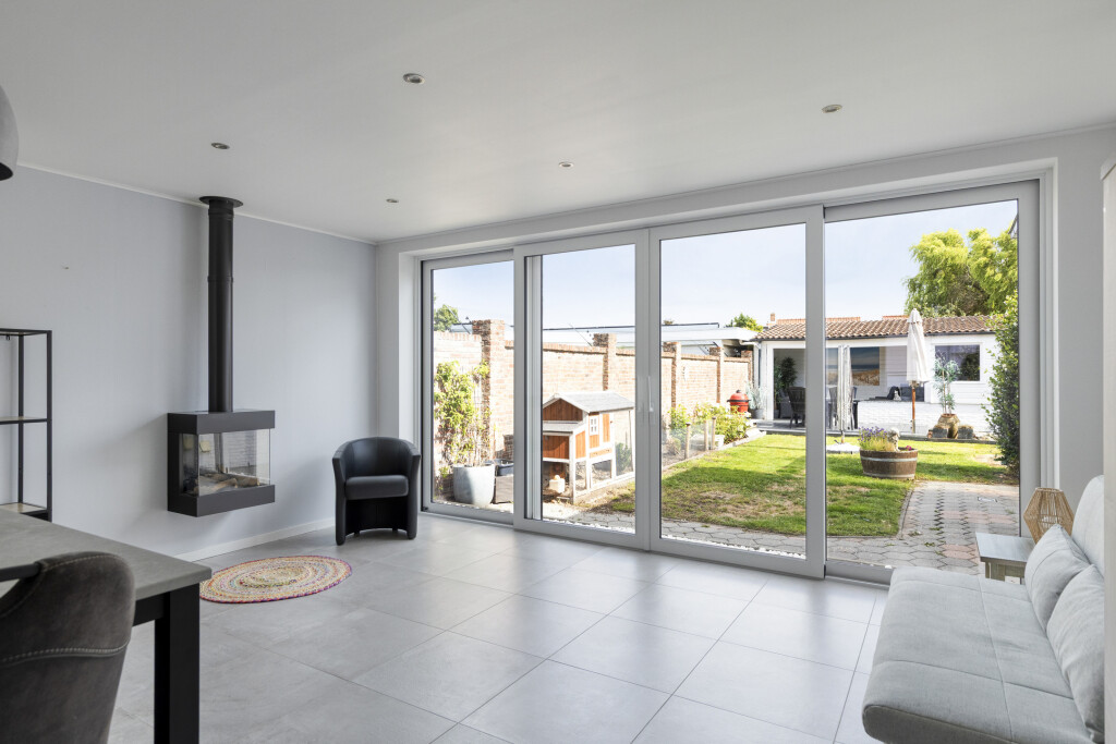 Tevens is er een extra zitgedeelte met sfeerhaard en dubbele schuifdeuren naar de tuin.