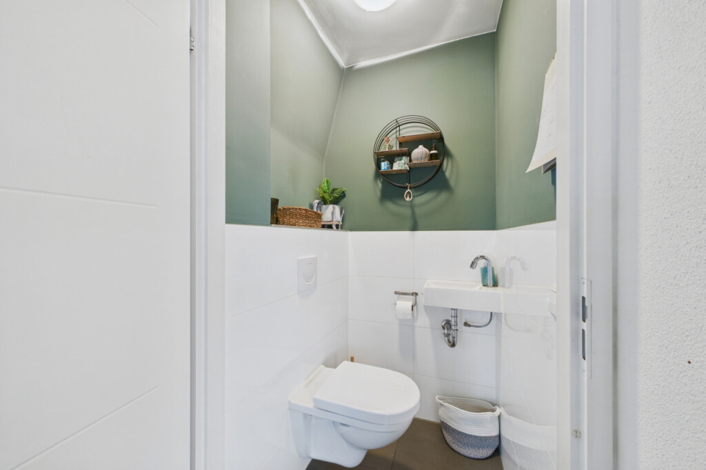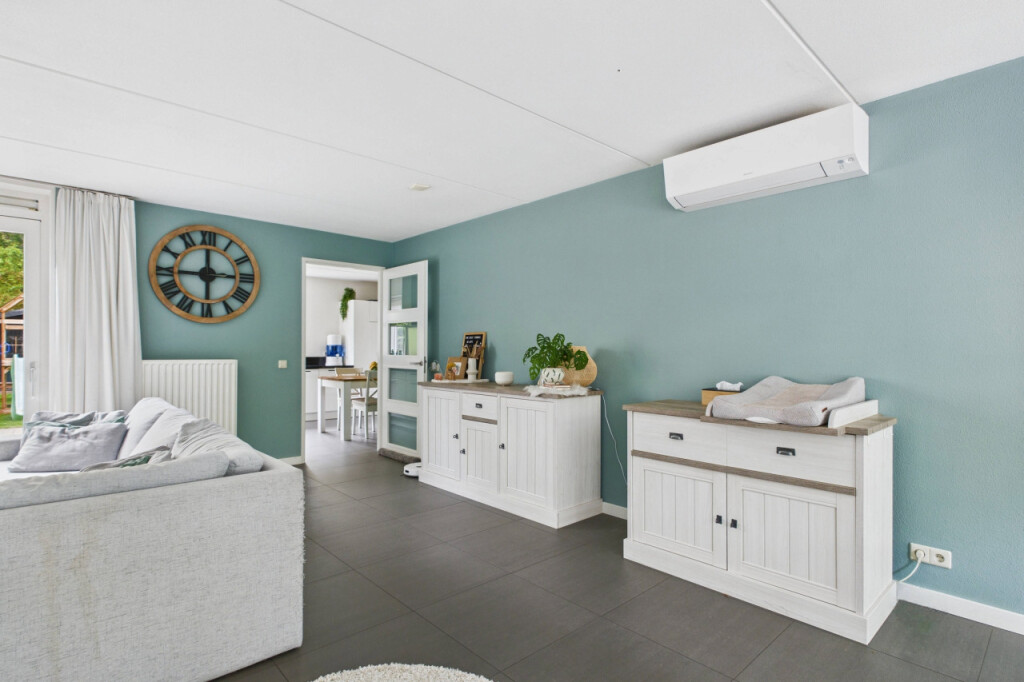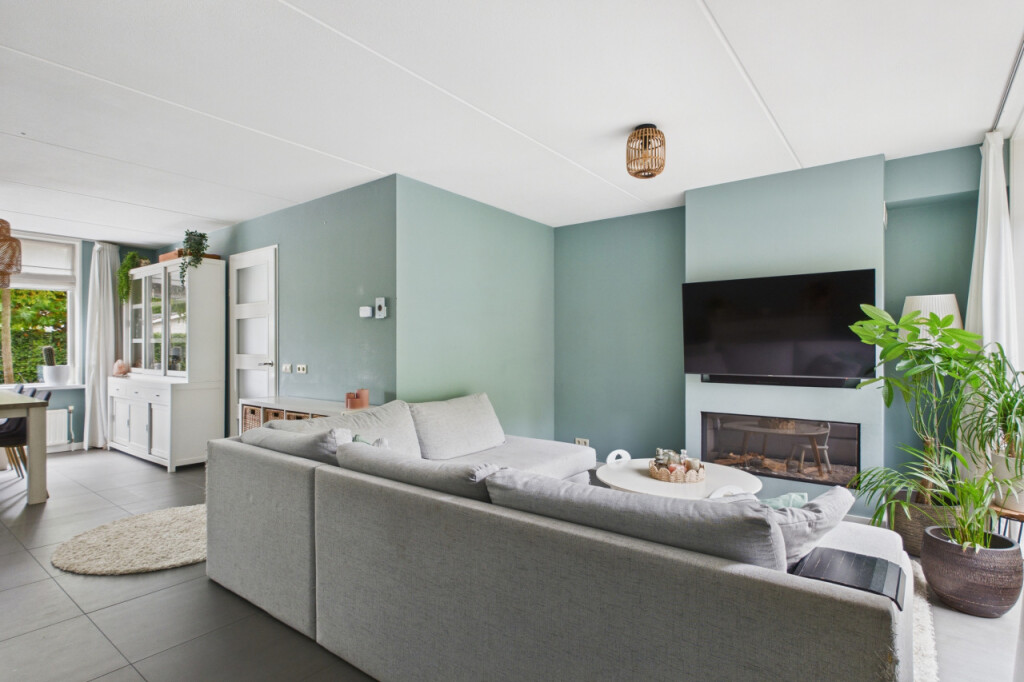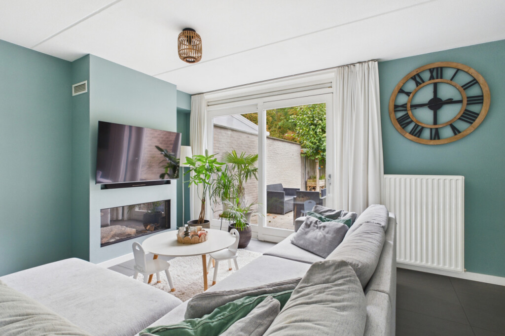 Via de ruime hal met tegelvloer en meterkast/provisieruimte bereik je het moderne hangtoilet met fonteintje. De sfeervolle L-vormige woonkamer is voorzien van een tegelvloer met vloerverwarming, een gashaard en een schuifpui naar de tuin. Hier geniet je van een comfortabel binnenklimaat dankzij de airco (koelen of verwarmen) en van veel daglicht door de royale raampartijen.