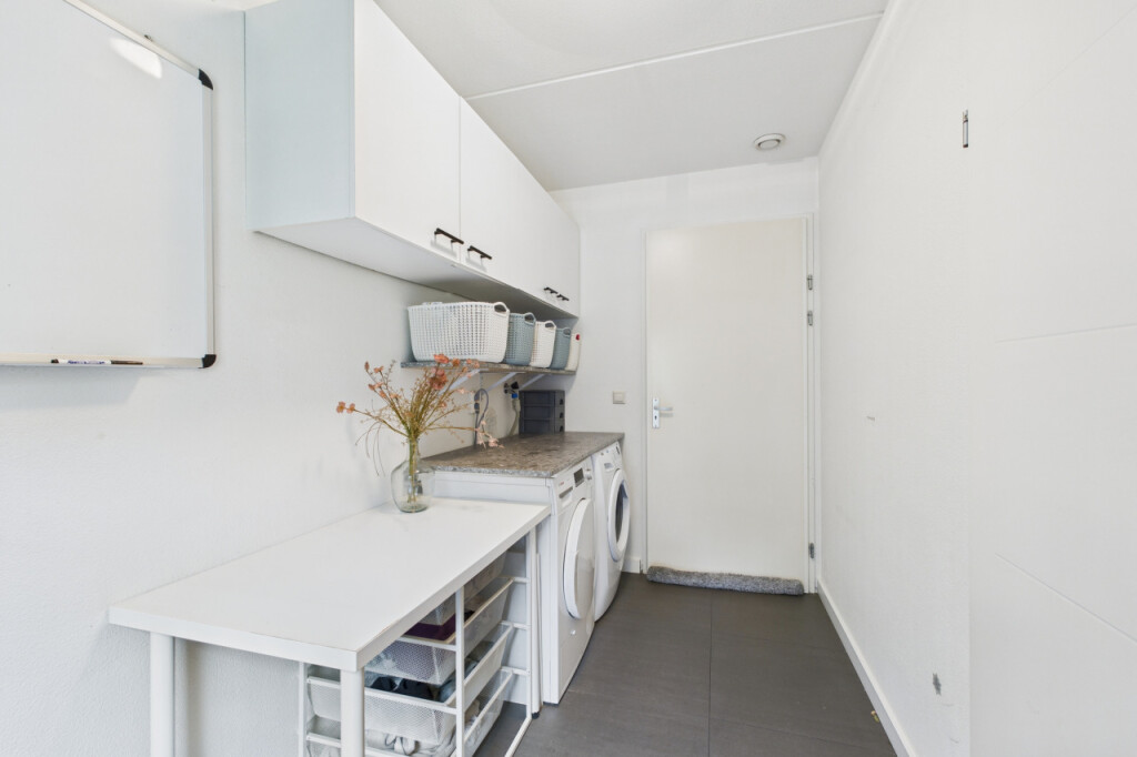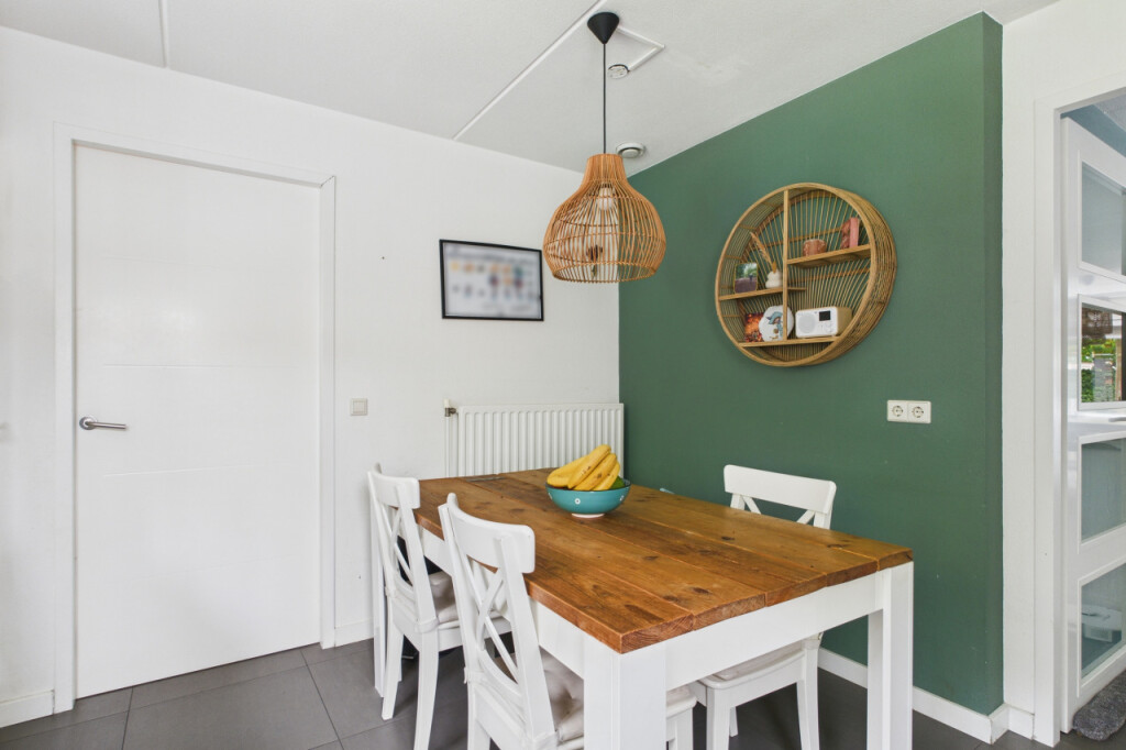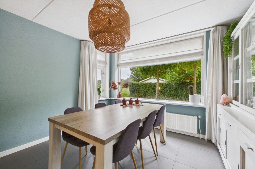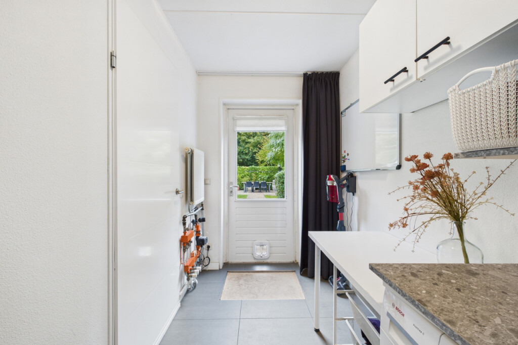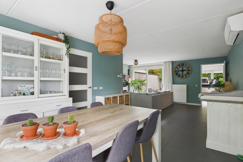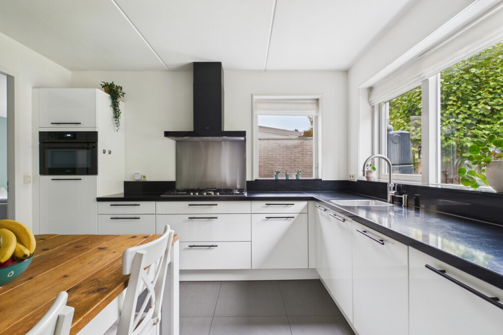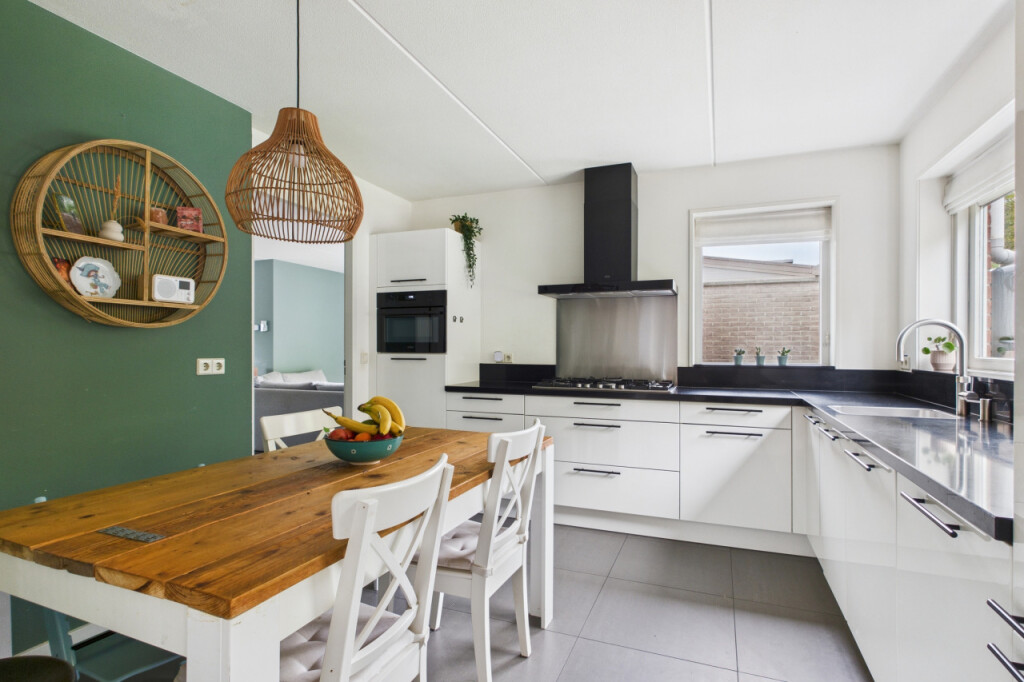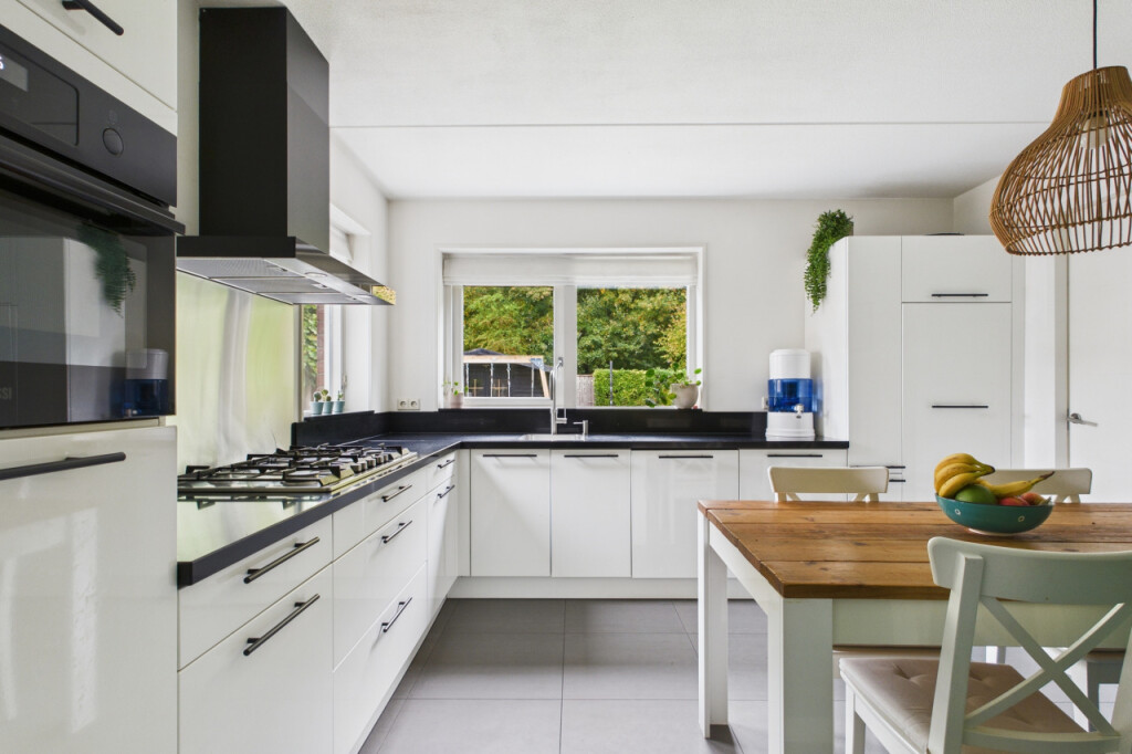 De open eetkeuken is een gezellige plek voor dagelijkse maaltijden en lange diners. De luxe keukenopstelling is compleet met inbouwapparatuur, waarvan de Quooker-kraan, combimagnetron, vaatwasser en afzuigkap in 2023 zijn vernieuwd. Vanuit de keuken is de praktische bijkeuken bereikbaar met witgoedaansluitingen en doorgang naar de garage (voorzien van elektrische garagedeur) en de achterdeur naar de tuin.