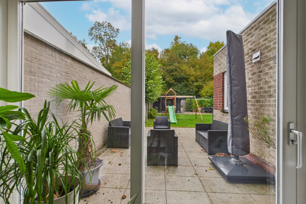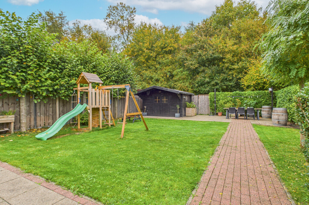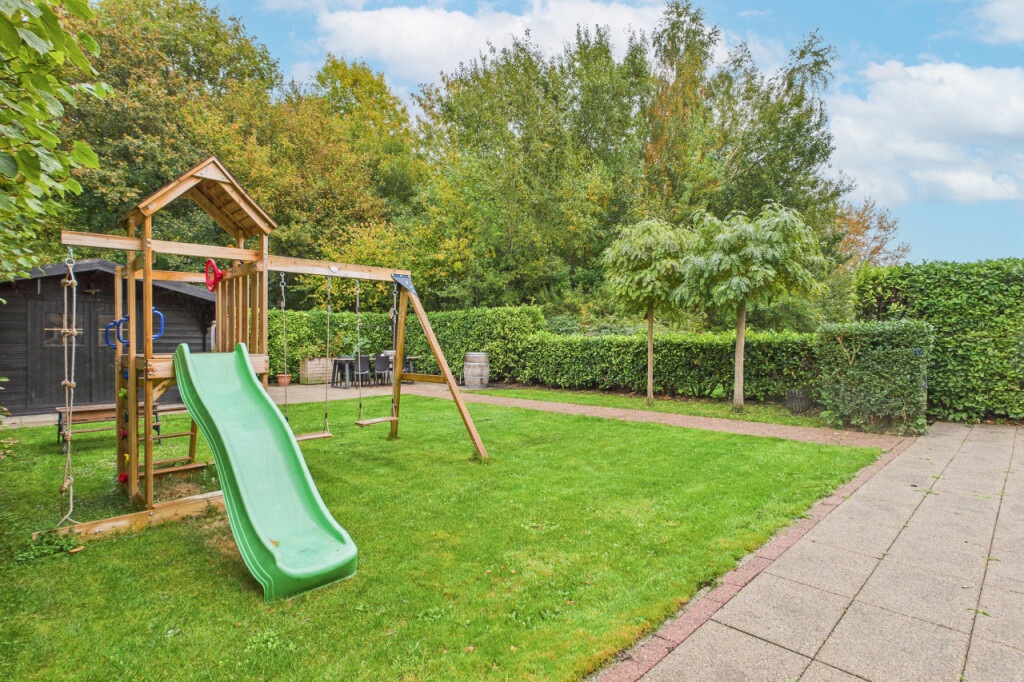 De achtertuin is een heerlijke plek om te ontspannen: fraai aangelegd, voorzien van meerdere terrassen, een tuinhuis en een zijuitgang. Dankzij de ligging aan openbaar groen en het directe contact met bos en kreek geniet je hier van optimale privacy en een prachtig uitzicht.
