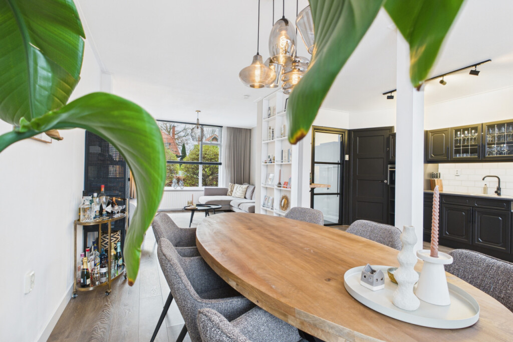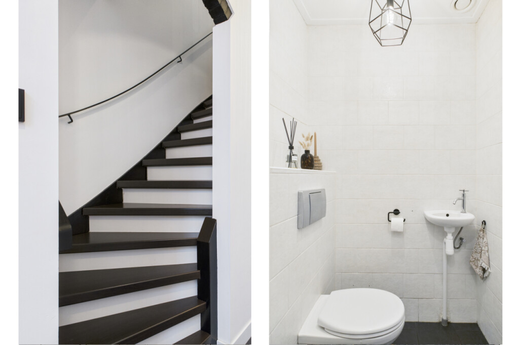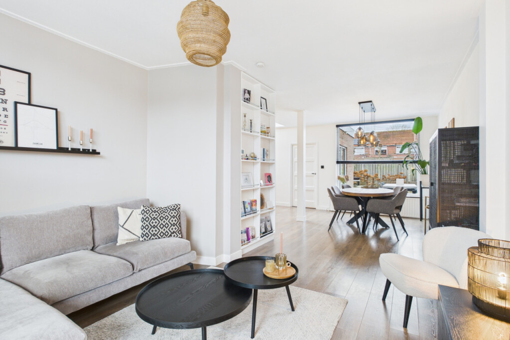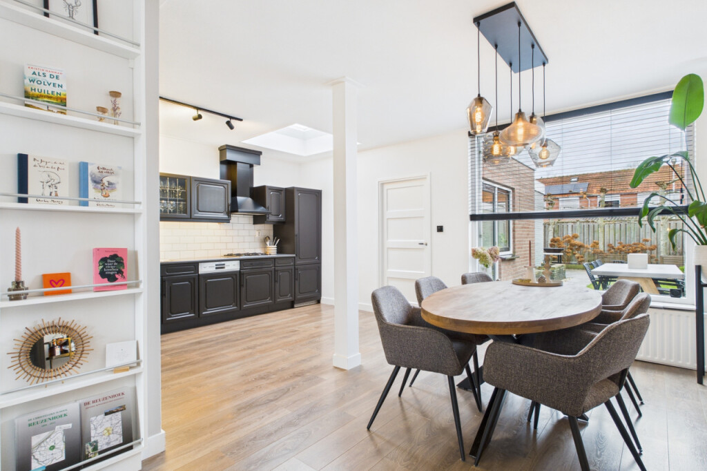 Bij binnenkomst valt meteen op hoe logisch en licht de begane grond is ingedeeld. De hal opent naar een doorzonwoonkamer waar het daglicht vrij spel heeft. Aan de straatzijde is ruimte voor een knusse zithoek, terwijl aan de tuinzijde een ruime eethoek uitnodigt tot lange tafelsessies. De open keuken sluit hier naadloos op aan en is uitgevoerd in een donkere, tijdloze stijl met de nodige inbouwapparatuur. Achter de keuken ligt de praktische bijkeuken met extra waterpunt, de opstelling van de cv-ketel, het toilet en de deur naar de tuin.