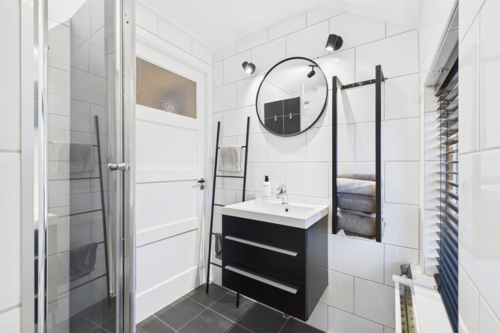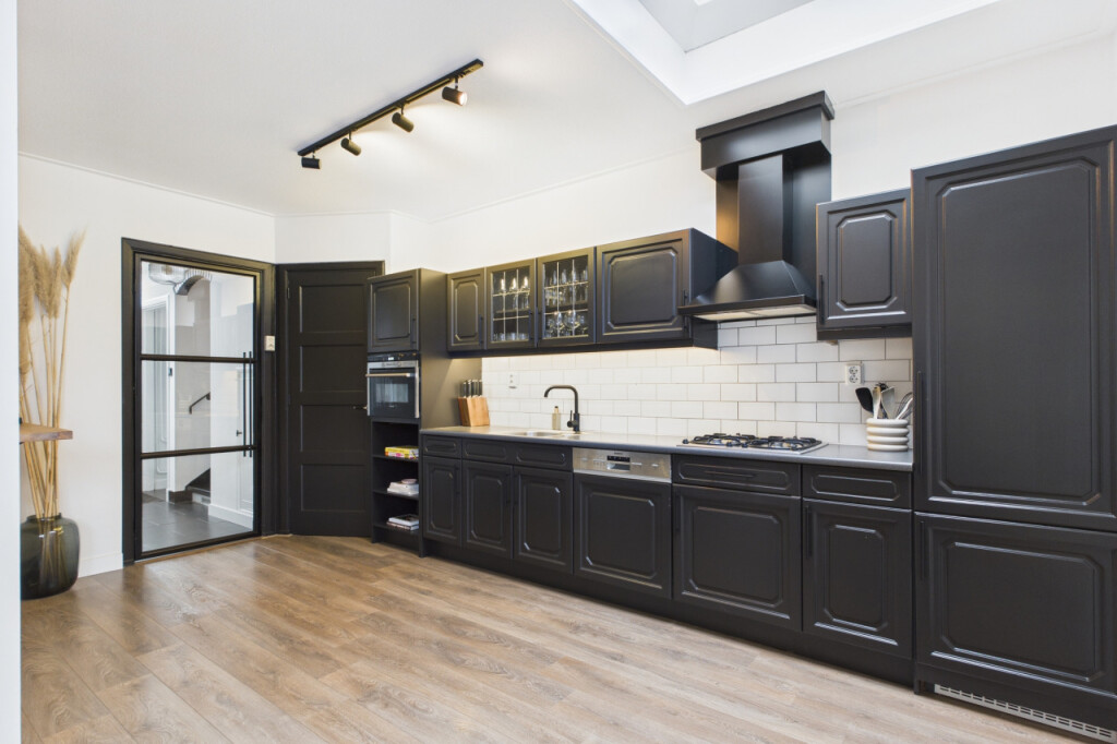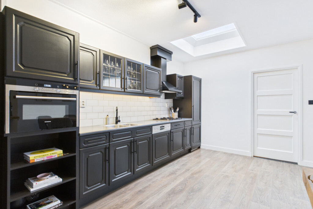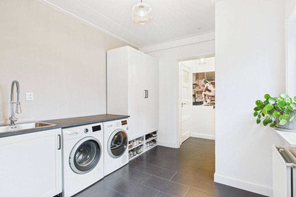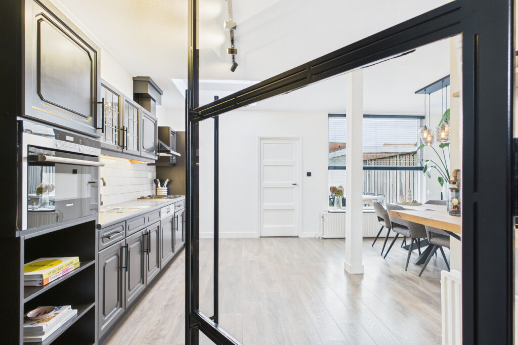 Bij binnenkomst valt meteen op hoe logisch en licht de begane grond is ingedeeld. De hal opent naar een doorzonwoonkamer waar het daglicht vrij spel heeft. Aan de straatzijde is ruimte voor een knusse zithoek, terwijl aan de tuinzijde een ruime eethoek uitnodigt tot lange tafelsessies. De open keuken sluit hier naadloos op aan en is uitgevoerd in een donkere, tijdloze stijl met de nodige inbouwapparatuur. Achter de keuken ligt de praktische bijkeuken met extra waterpunt, de opstelling van de cv-ketel, het toilet en de deur naar de tuin.