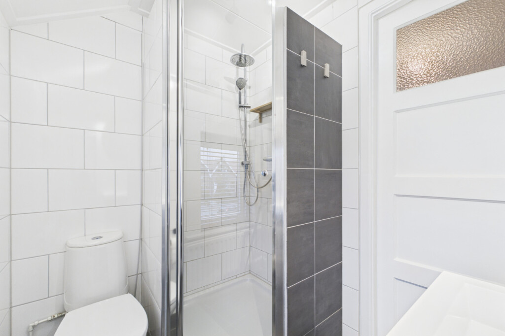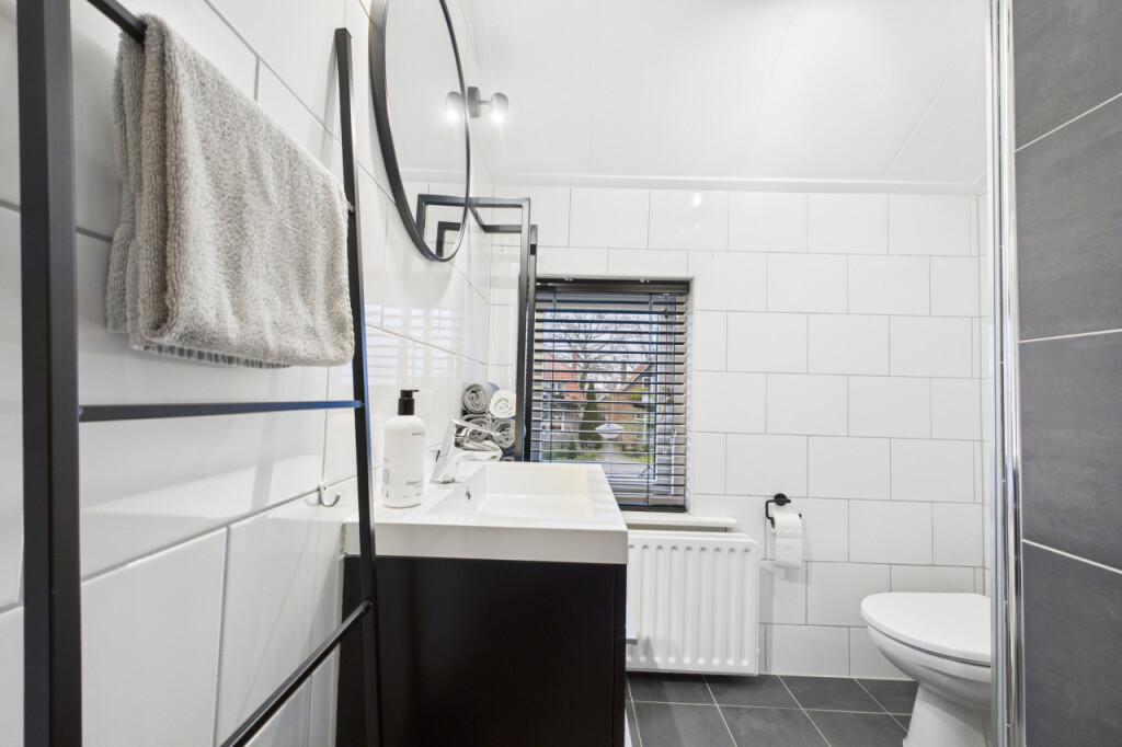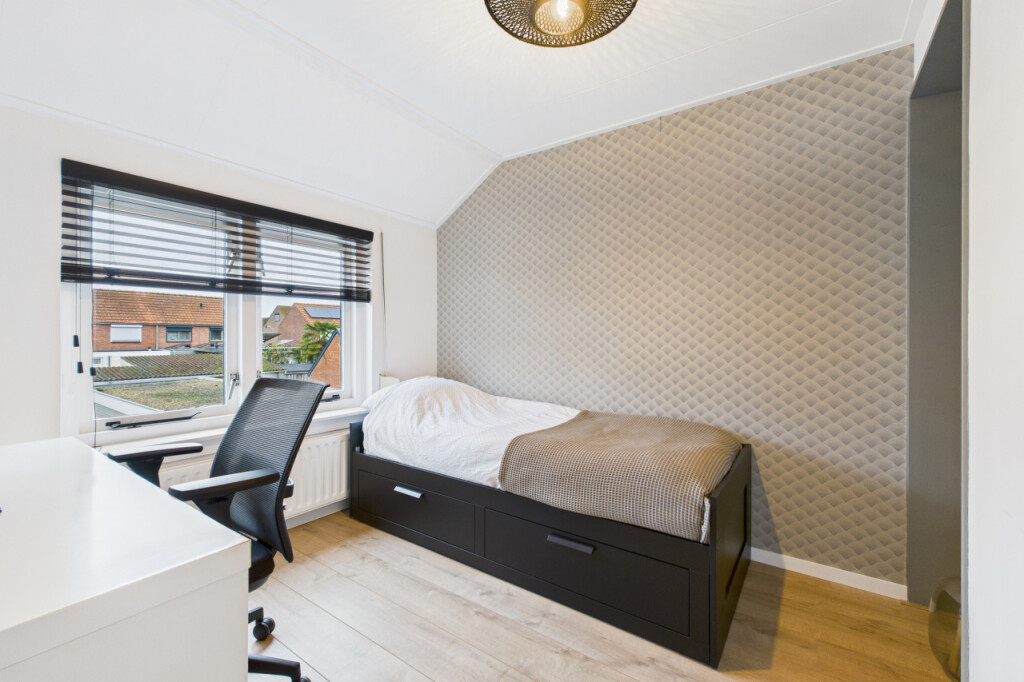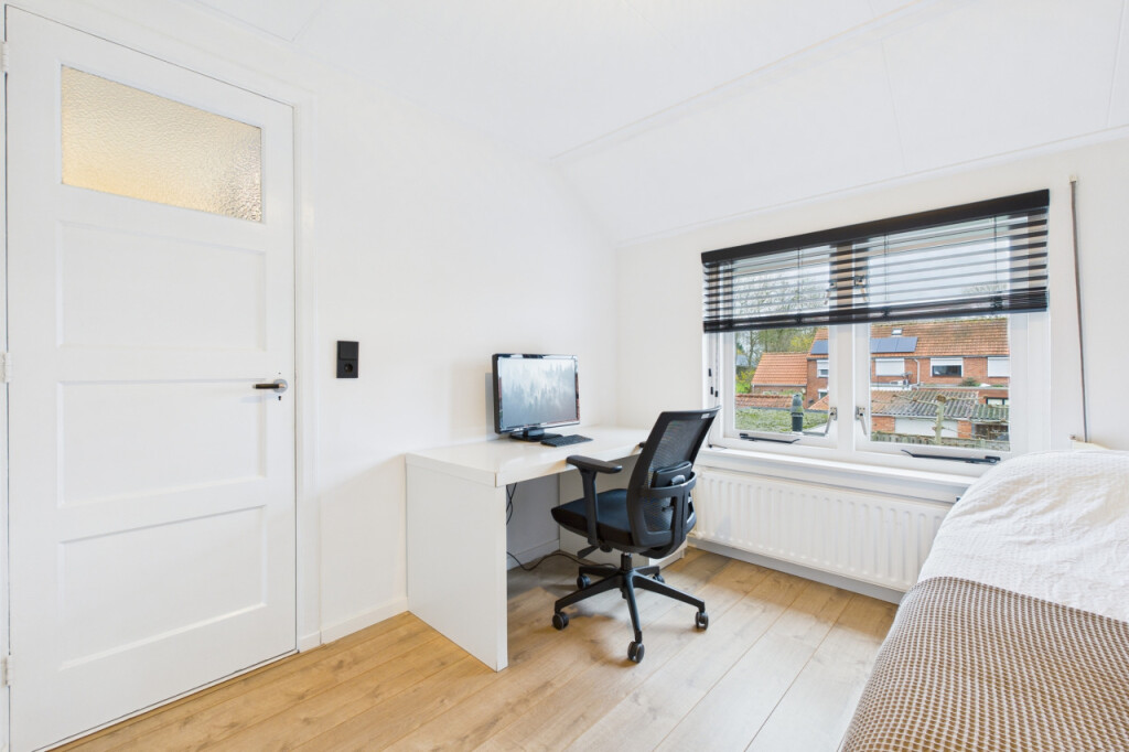 Op de eerste verdieping loopt de overloop langs drie goed ingedeelde slaapkamers, waarvan één is voorzien van een vaste kast. De kamers hebben stuk voor stuk een rustige uitstraling en zijn ideaal als kinderkamer, werkruimte of logeerkamer. De badkamer is fris en licht afgewerkt en biedt een douche, toilet en wastafel met meubel.