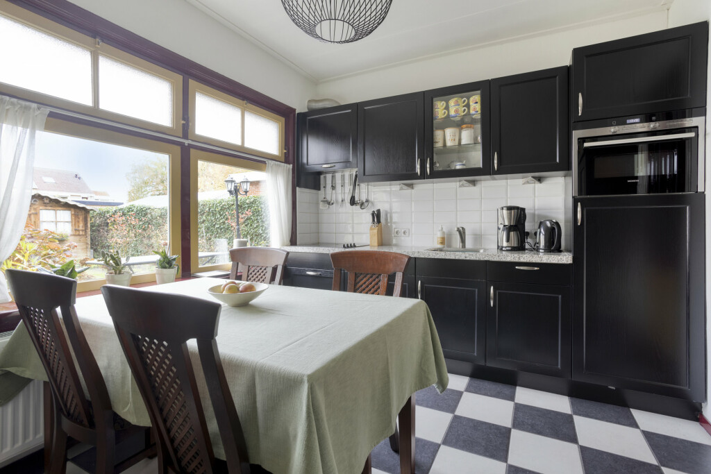 Via de originele dubbele deuren kom je in de woonkamer met een ruim zit- en eetgedeelte. Aan de voorzijde is de raampartij vervangen voor kunststof voor extra comfort. De elektrische haard is zowel praktisch als sfeervol voor de koudere maanden. De grote eetkeuken is uitgevoerd in een rechte wandopstelling met onder- en bovenkasten en inbouwapparatuur, waaronder;