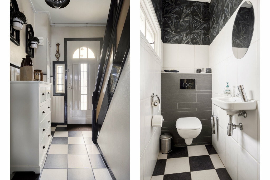 Bij de entree van de woning valt al direct de prachtige authentieke deur met glas-in-lood ramen op. De ruime hal is voorzien van een passende tegelvloer en hier bevinden zich het toilet en de toegang naar de kelder. Het toilet is gedeeltelijk betegeld en voorzien van fontein. Ook de kelder is betegeld en ideaal te gebruiken voor het opslaan van voorraad.