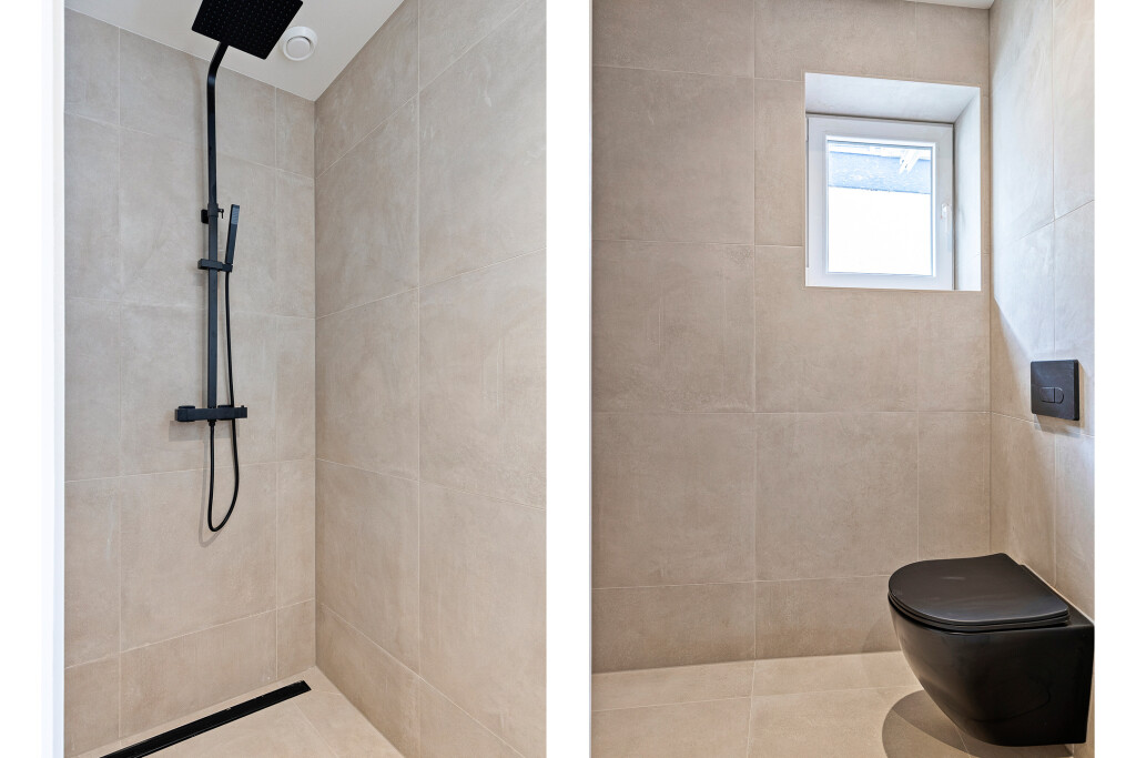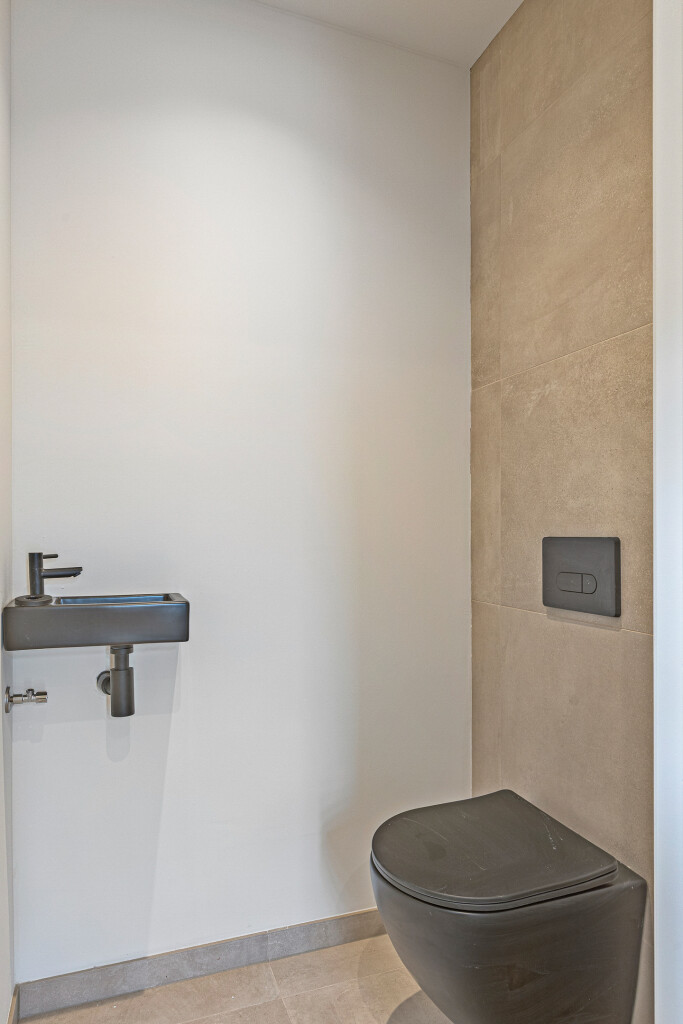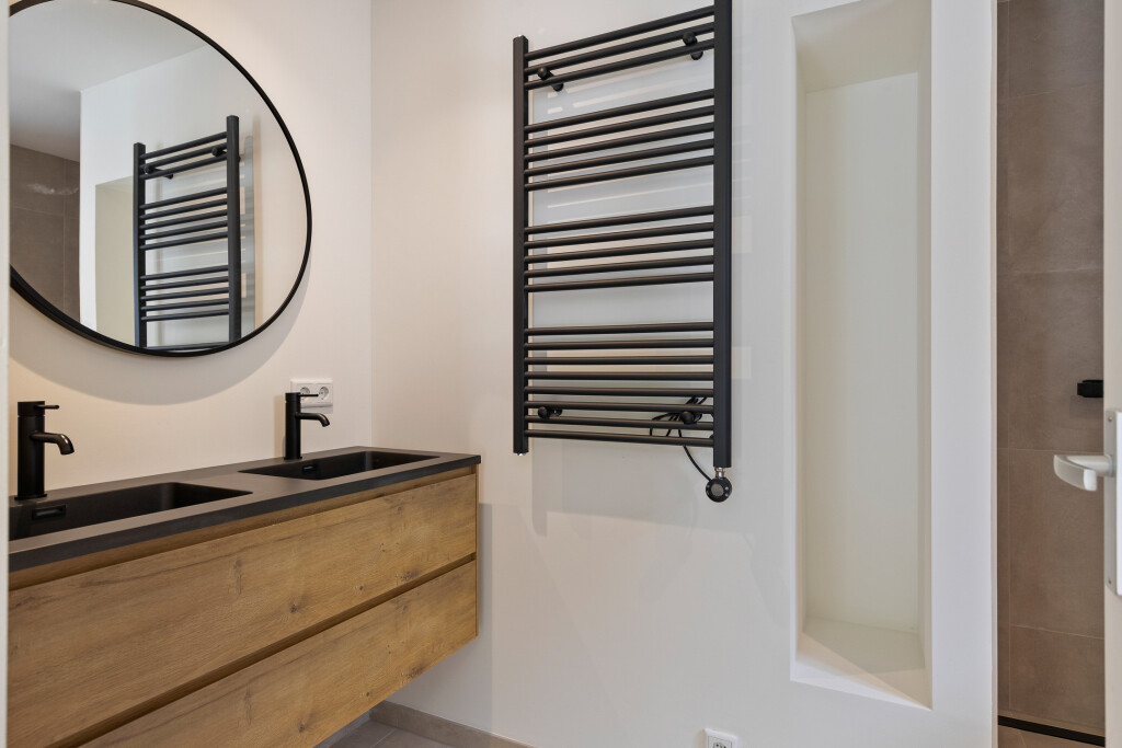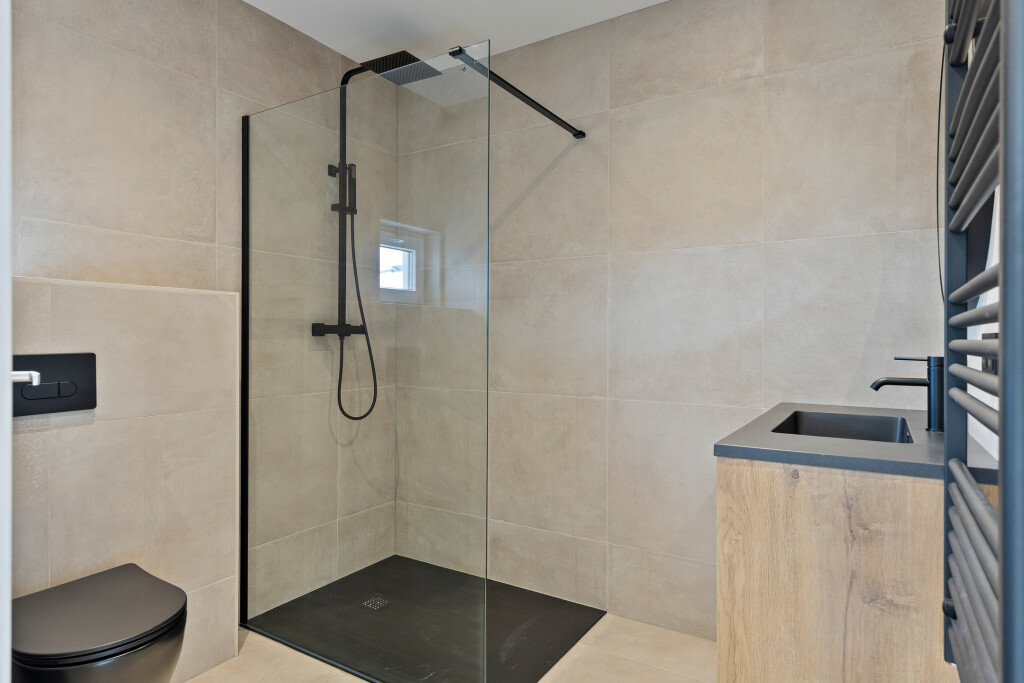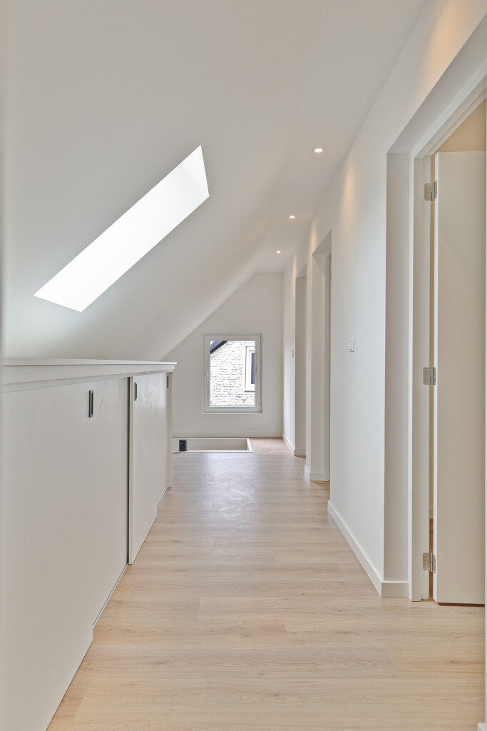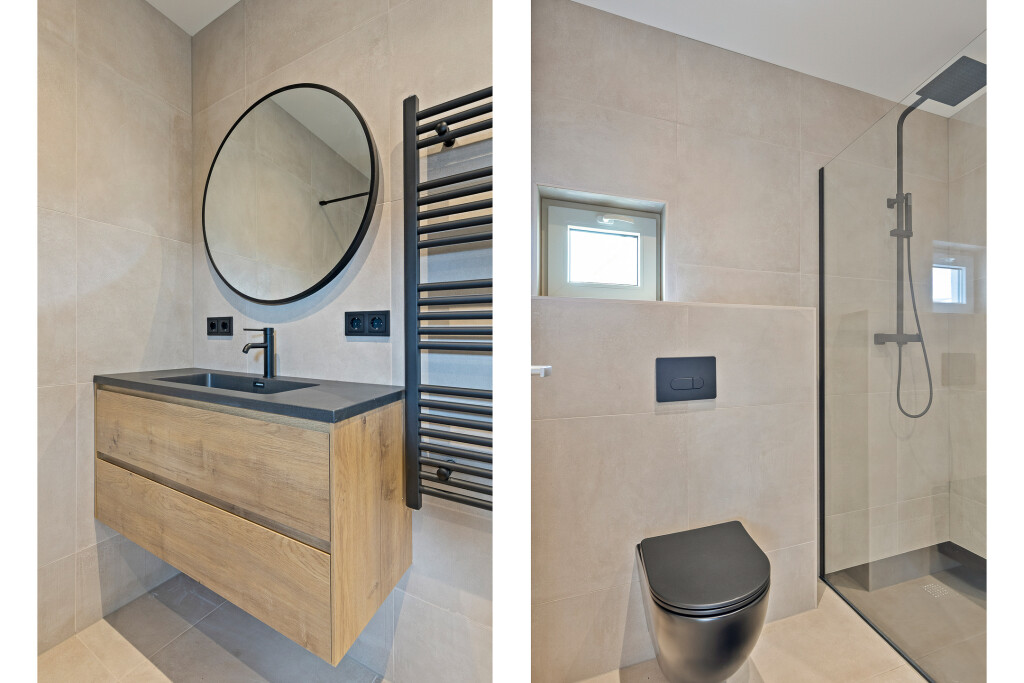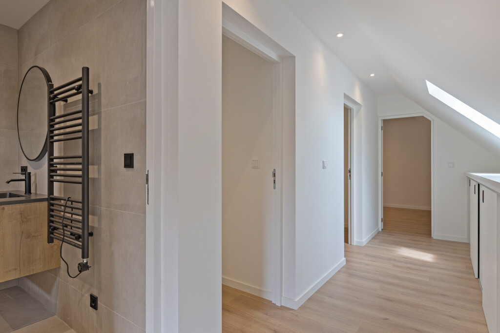 Ruime overloop met bergkasten. In de bergkasten vind u de wasmachineaansluiting, de boiler voor het warme water en de hybride omvormer. Op deze verdieping bevinden zich 1 ruime slaapkamer en 2 zeer ruime slaapkamers. Alle slaapkamers zijn voorzien van airconditioning met zowel een koelende als verwarmende functie. De moderne badkamer heeft een grote inloopdouche, een wasmeubel en een toilet.