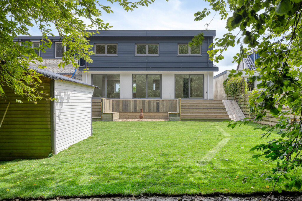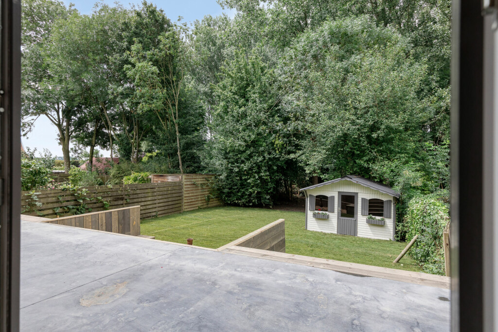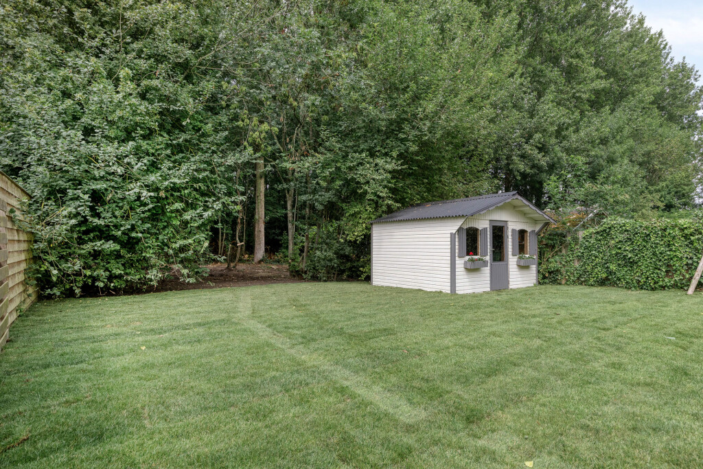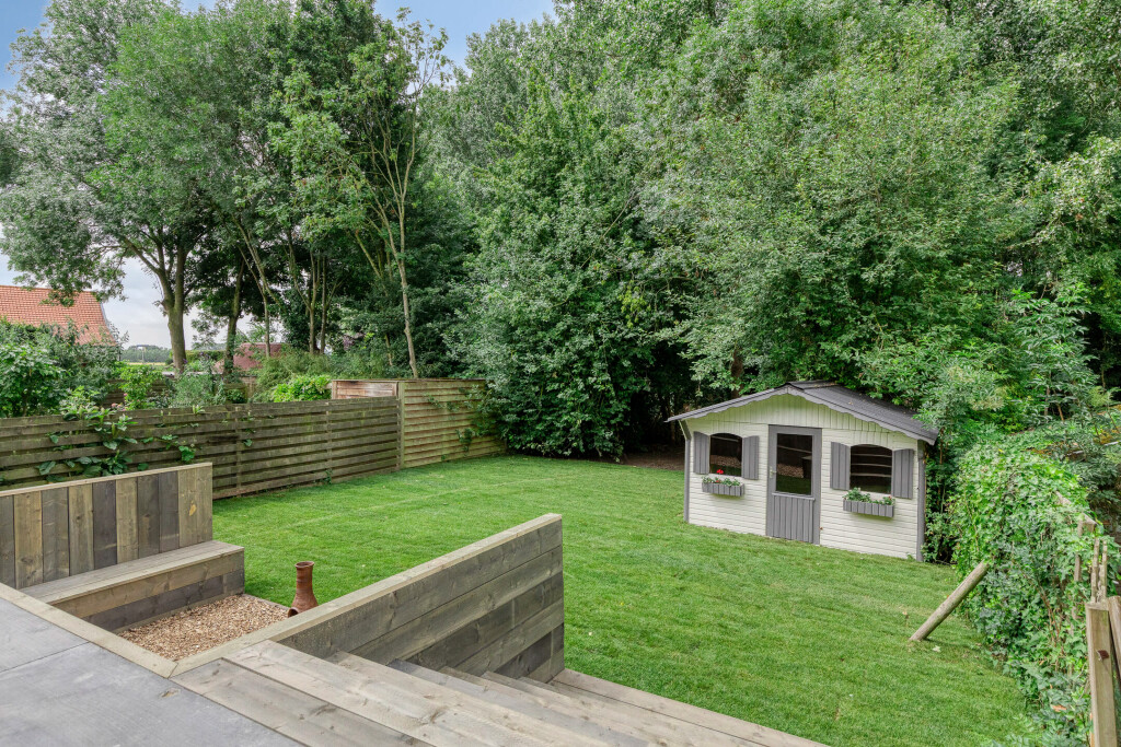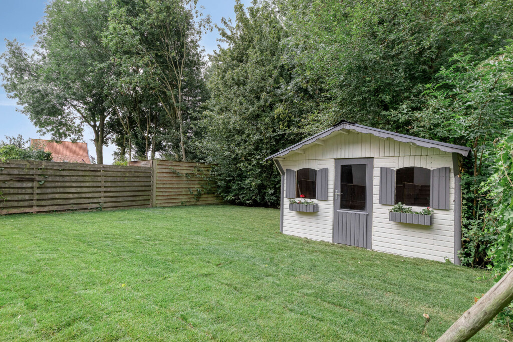 Verder is de tuin voorzien van een strak gazon met achterin de tuin een houten tuinhuis.