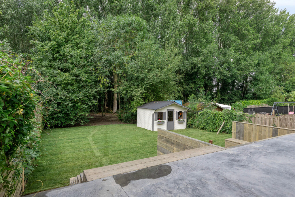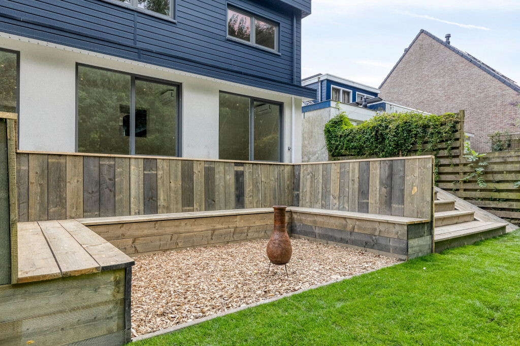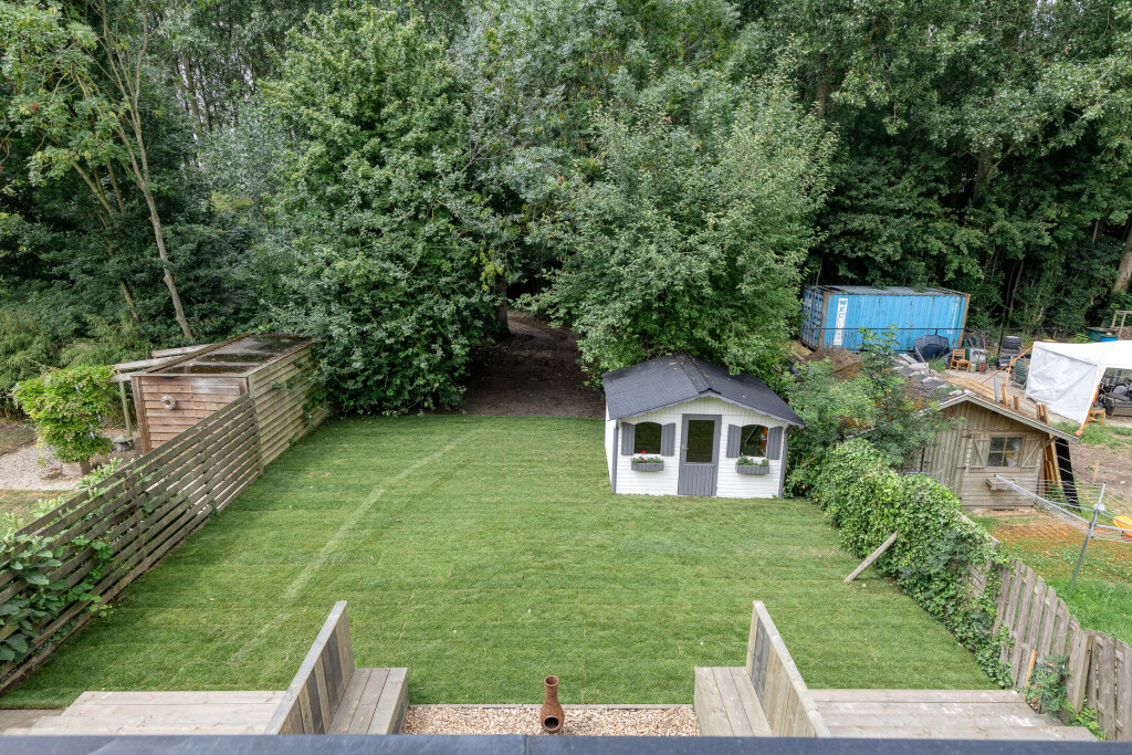 Direct achter de woning is er een prachtig nieuw aangelegd (verhoogd) terras, vanwaar je kijkt op het bos en de tuin. Via 2 grote houten trappen bereik je de rest van de zonnige tuin met in het midden een grote zithoek die ideaal is voor gezellige avonden met vrienden rondom een vuurtje.