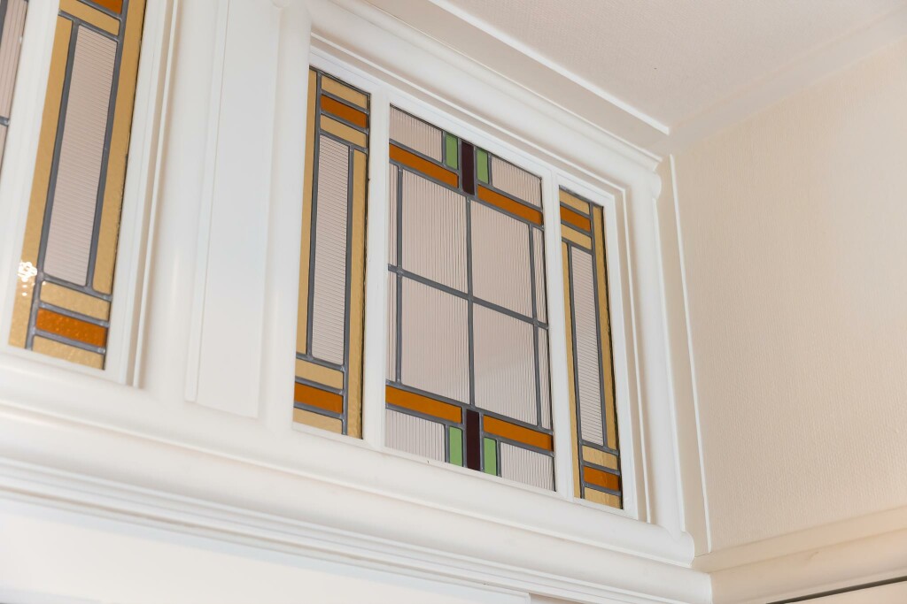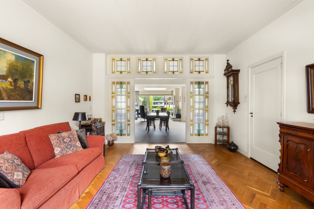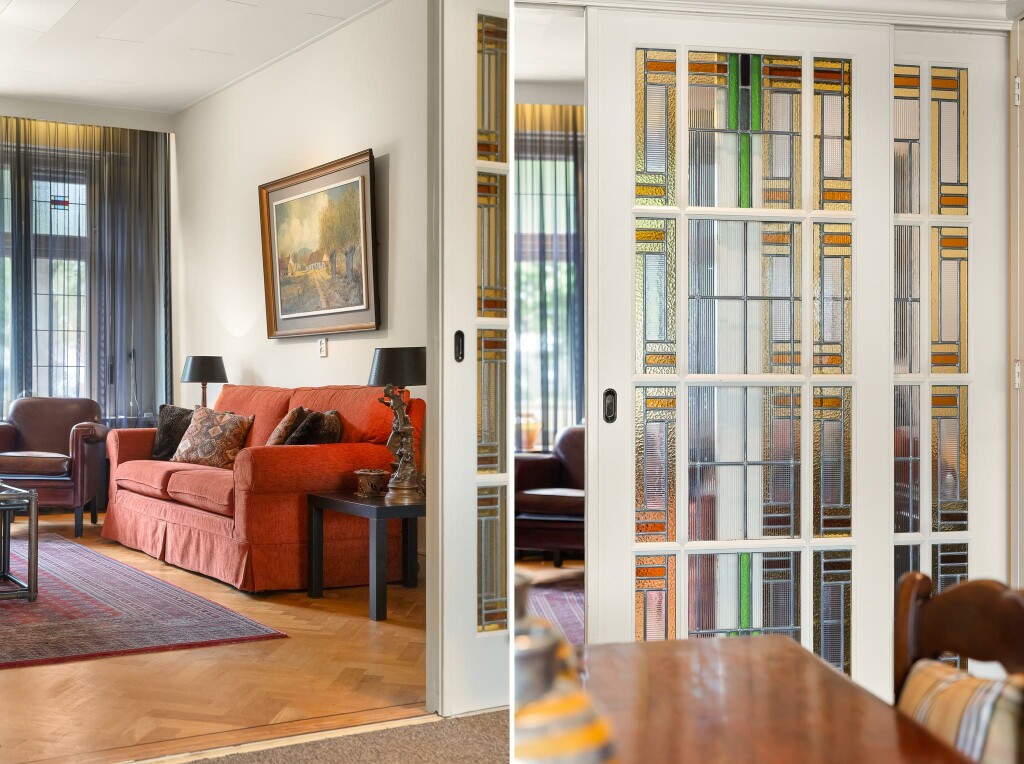 Woonkamer: De royale woonkamer “en-suite” is licht en ruim, met grote ramen die uitkijken op het dorpsplein en aan de achterzijde op de tuin. De stijlvolle afwerking met deels visgraat-parket, hoge plafonds, paneeldeuren en prachtig glas-in-loodwerk benadrukken de grandeur van de woning. Hier vindt u voldoende ruimte voor zowel een zit- als een eetgedeelte, perfect voor gezellige familieavonden en formele diners.