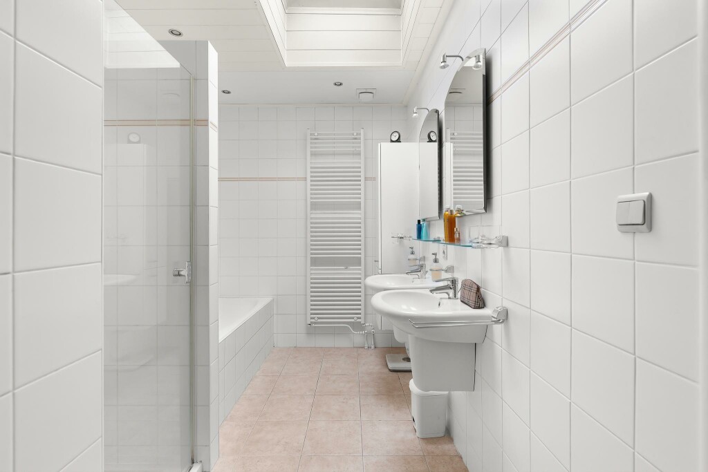 Badkamer: De ruime badkamer is compleet en uitgerust met een douche, een ligbad en een dubbele wastafel.