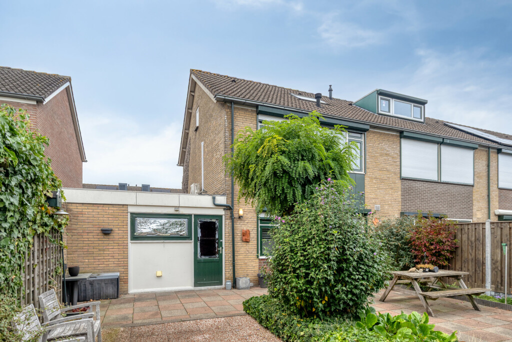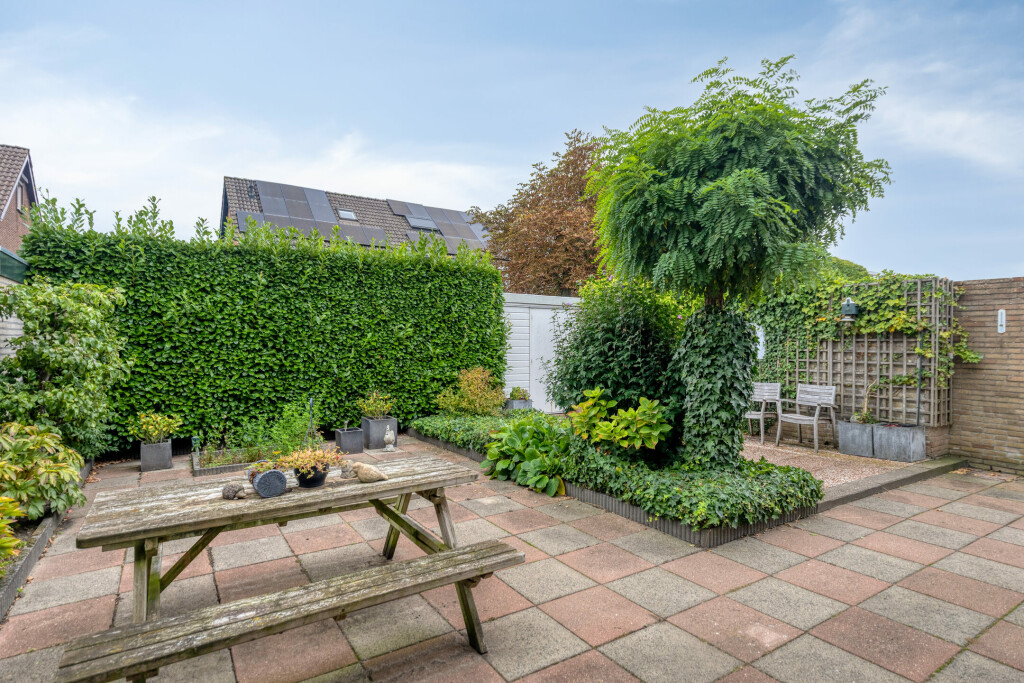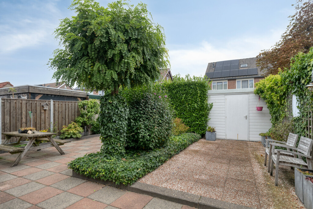 De tuin is onderhoudsarm en verzorgd aangelegd, met nette borders, een houten berging en een vrije achterom. Dankzij de oostelijke ligging is er de hele ochtend volop zon en de aangebouwde garage biedt extra opslag- of werkruimte. Voorzijde en oprit zijn ruim, zodat parkeren nooit een probleem is.