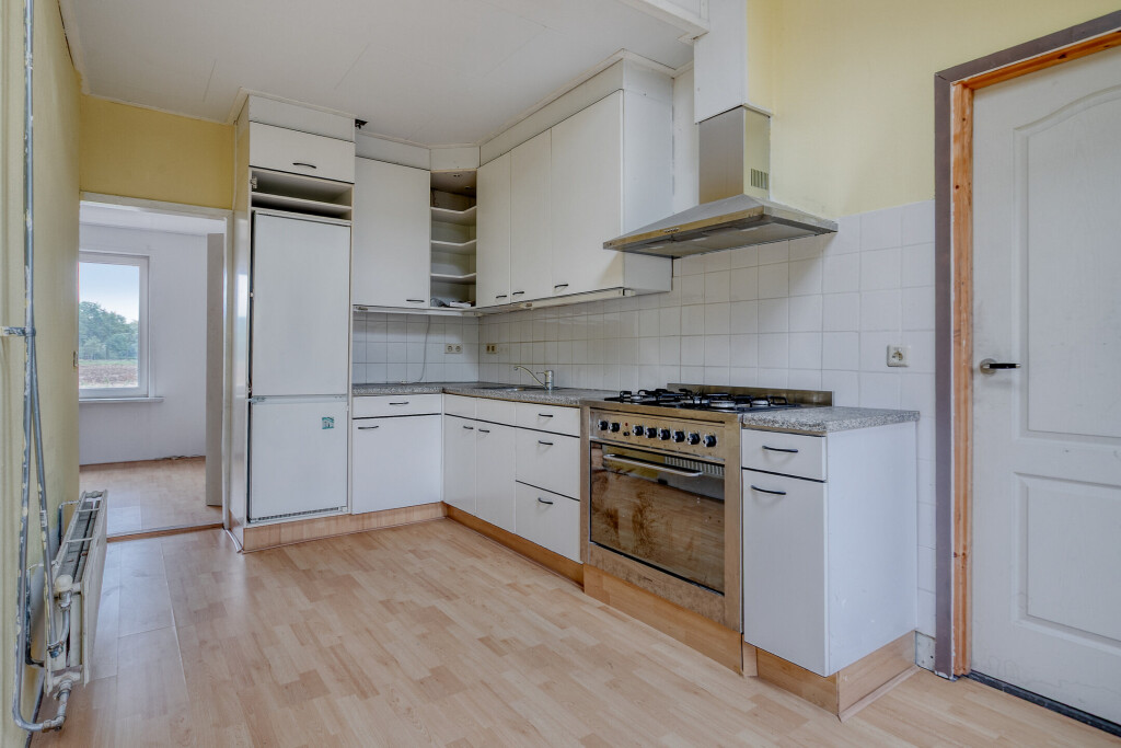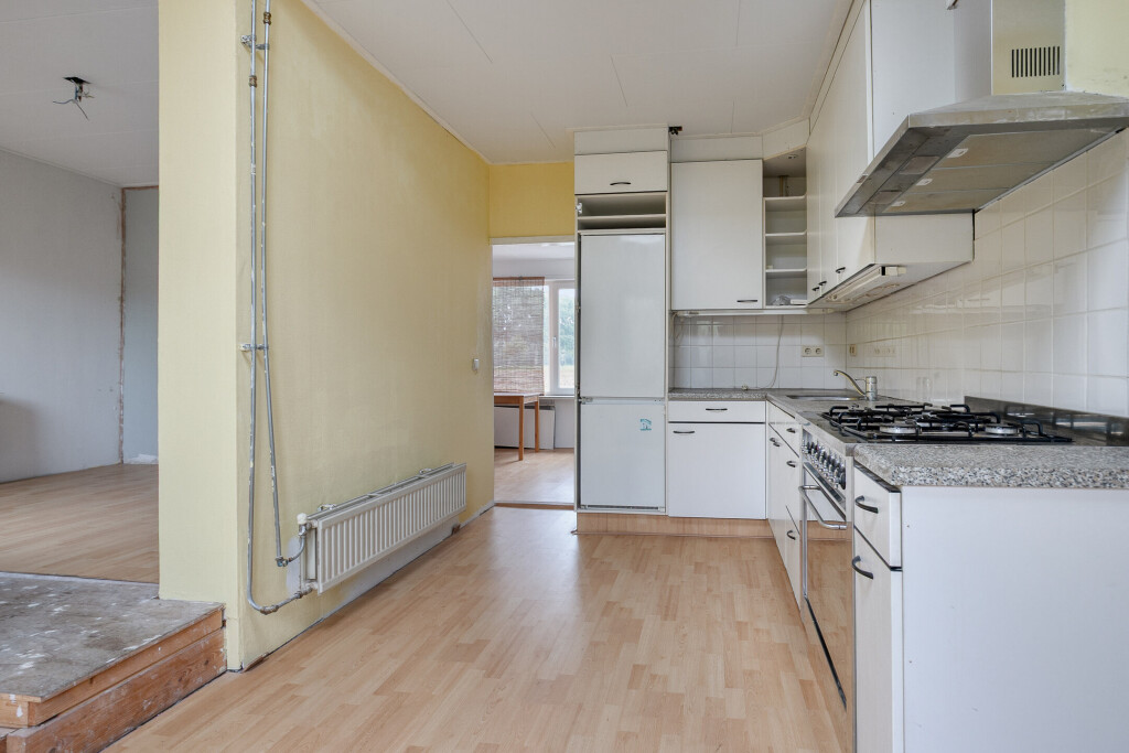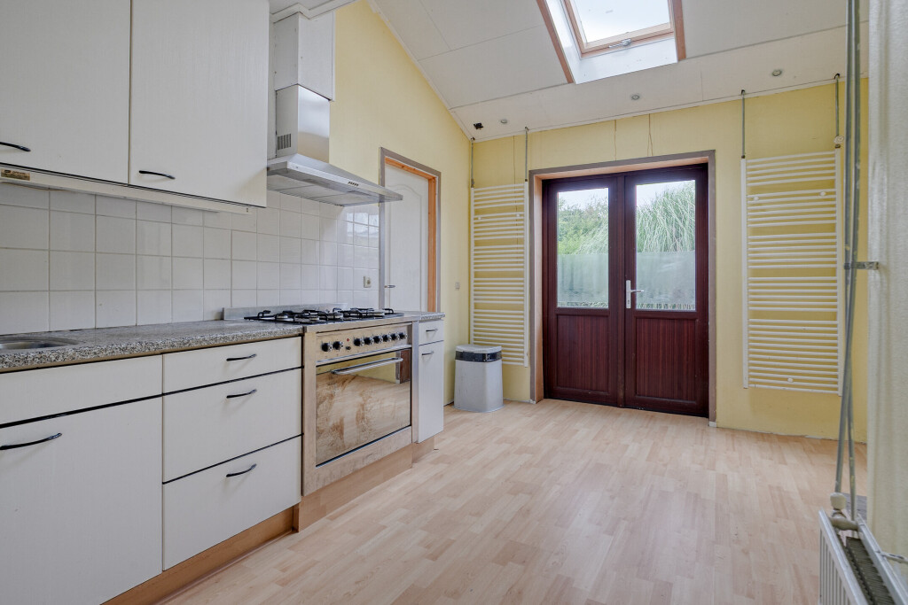 De ruime leefkeuken heeft een hoekopstelling en is voorzien van een gasfornuis, oven en koel/vriescombinatie. Vanuit de keuken zijn er dubbele tuindeuren naar het terras. Naast de keuken is er een knusse (op)kamer met een deur naar de tuin. Onder deze kamer is een kelder. In de handige bijkeuken treft u de c.v-installatie (Remeha ’04) en de wasmachineaansluiting. Vanuit de bijkeuken een deur naar de oprit.