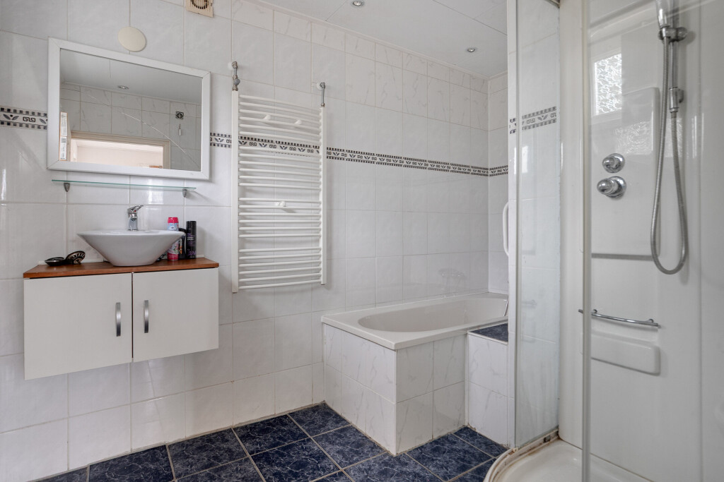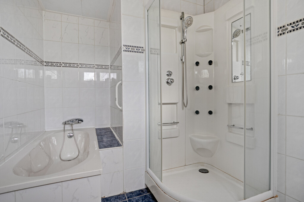 Entree in de hal met meterkast (verder af te werken). Gezellige, knusse woonkamer met een deur naar de andere kamer aan de voorzijde van de woning. Deze kamer heeft de trap naar de verdieping en biedt toegang tot het toilet en de badkamer. De ruime badkamer is voorzien van een ligbad, douche en wasmeubel.