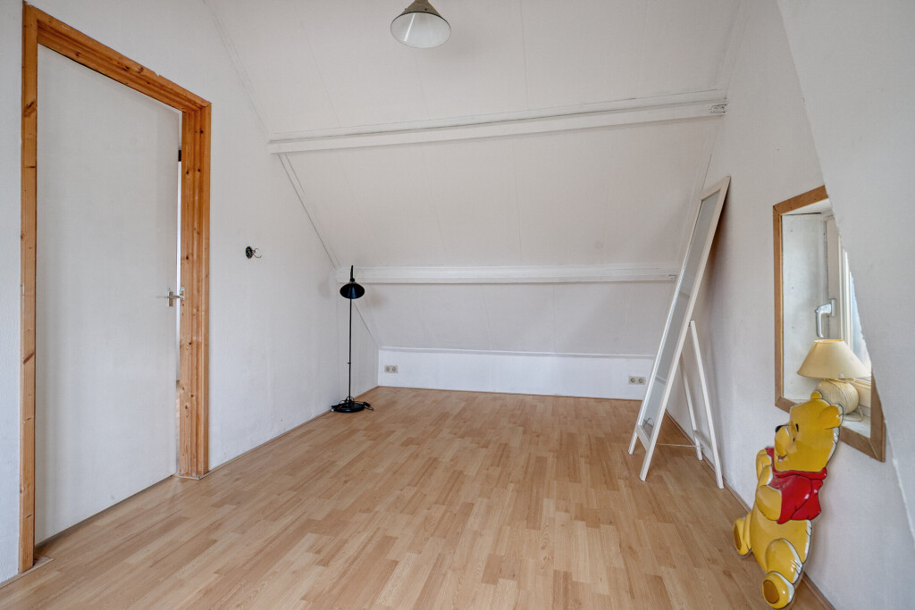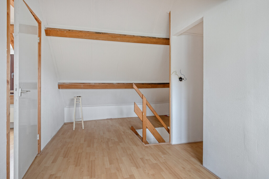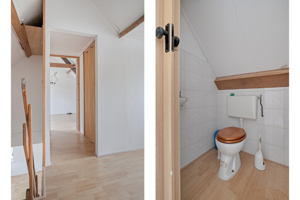 Ruime overloop met dakkapel en deur naar het toilet. Op deze verdieping zijn er 2 middelgrote kamers met dakkapel.