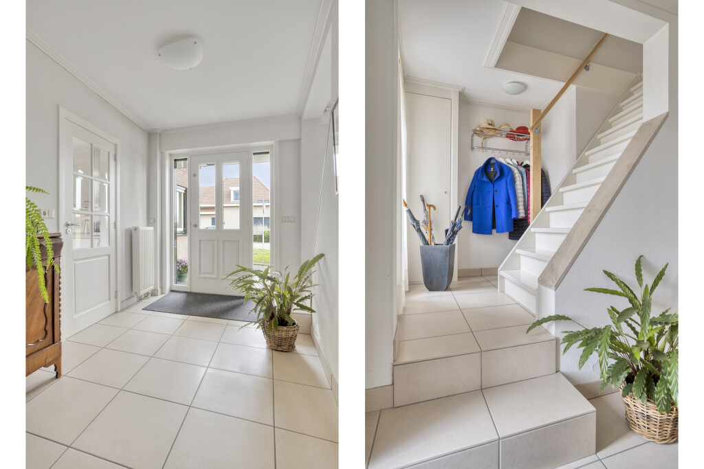 U betreedt de woning via de ruime hal met tegelvloer, trapopgang, meterkast en handige kelderkast – perfect voor het opbergen van proviand. Vanuit de hal bereikt u zowel de woonkamer, de keuken en de ruime kelder.