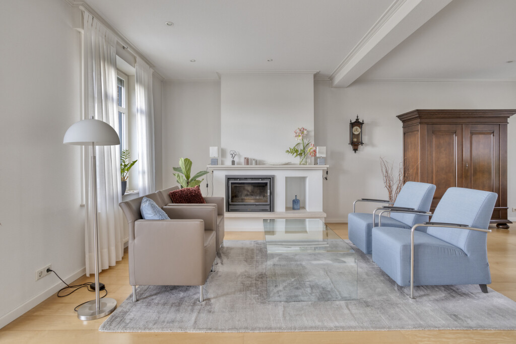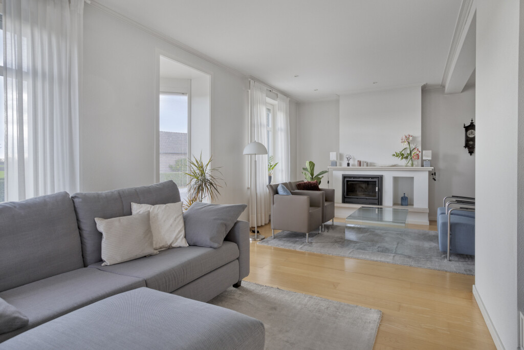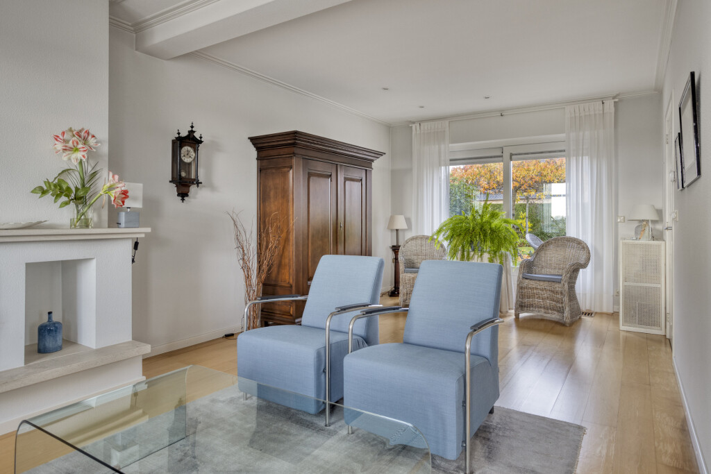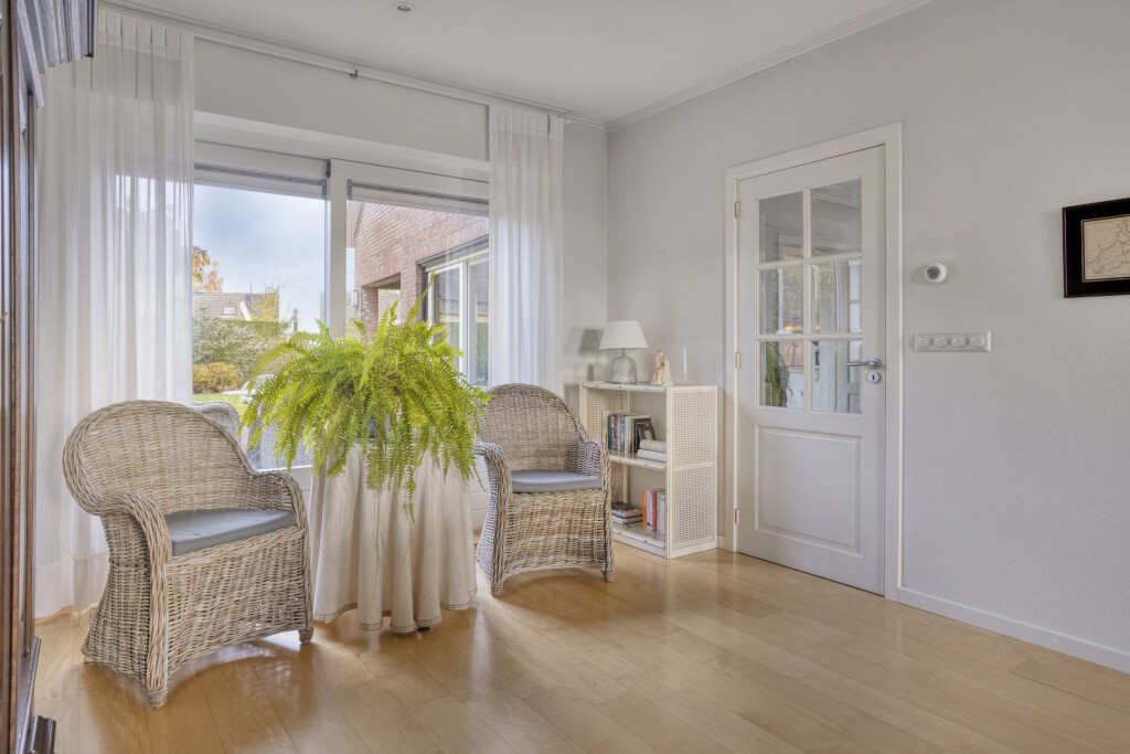 De lichte L-vormige woonkamer is een heerlijke leefruimte met een speels erkerraam aan de voorzijde en een schitterend uitzicht over de polder. De houten vloer, sfeervolle haard en inbouwspots zorgen voor een warme en uitnodigende sfeer. Via de schuifpui aan de achterzijde staat de woonkamer in direct contact met de tuin.