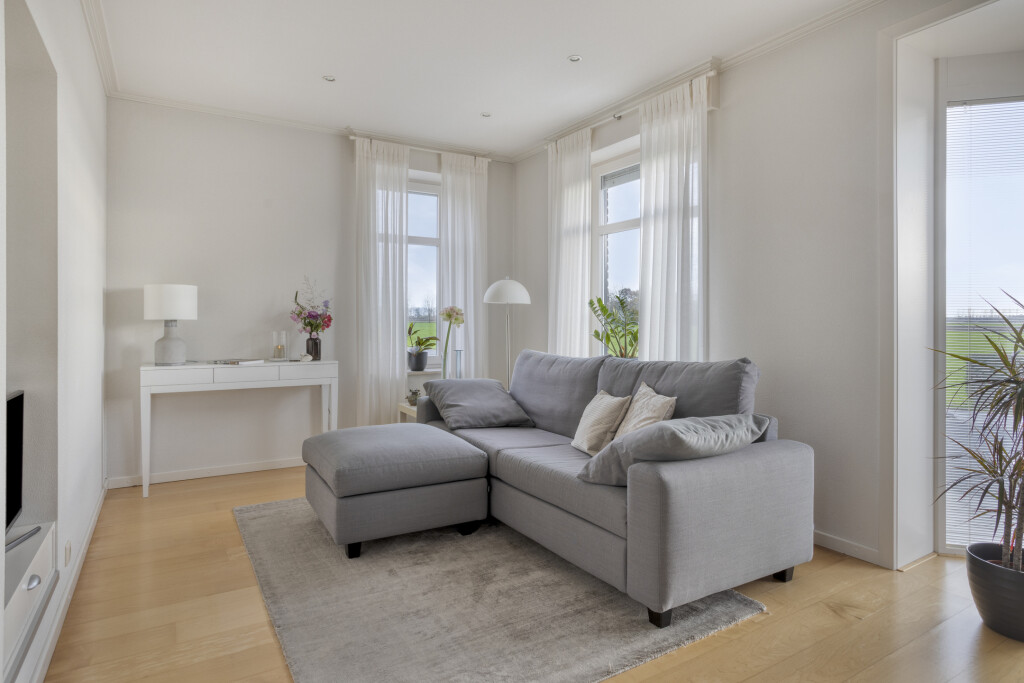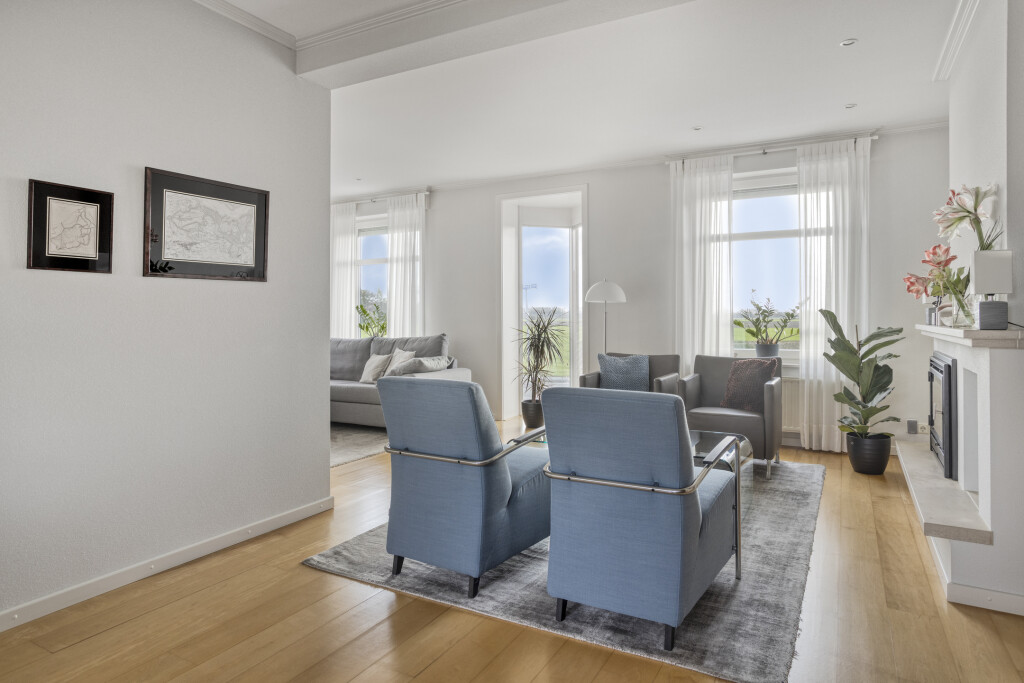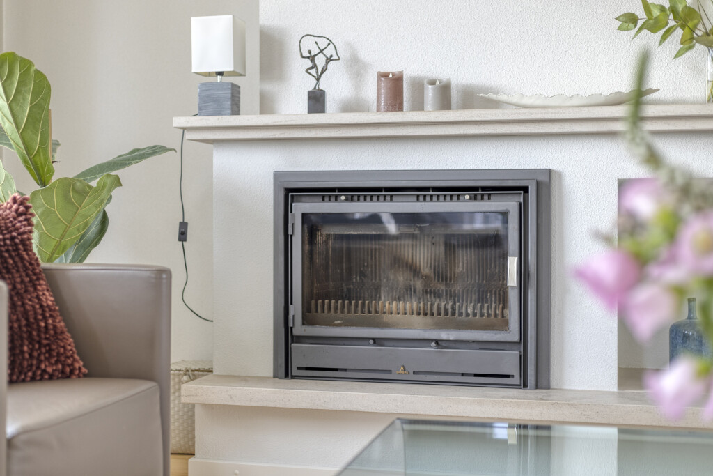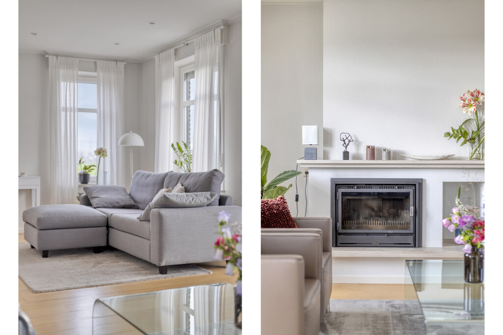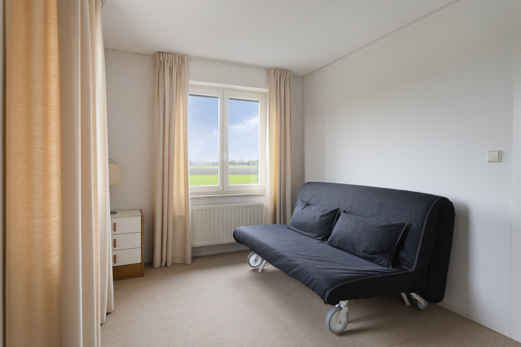 De lichte L-vormige woonkamer is een heerlijke leefruimte met een speels erkerraam aan de voorzijde en een schitterend uitzicht over de polder. De houten vloer, sfeervolle haard en inbouwspots zorgen voor een warme en uitnodigende sfeer. Via de schuifpui aan de achterzijde staat de woonkamer in direct contact met de tuin.